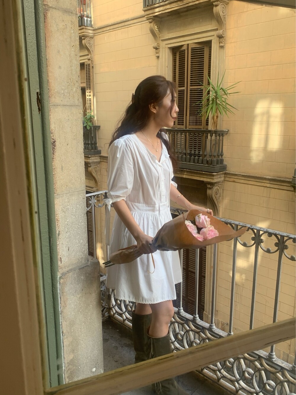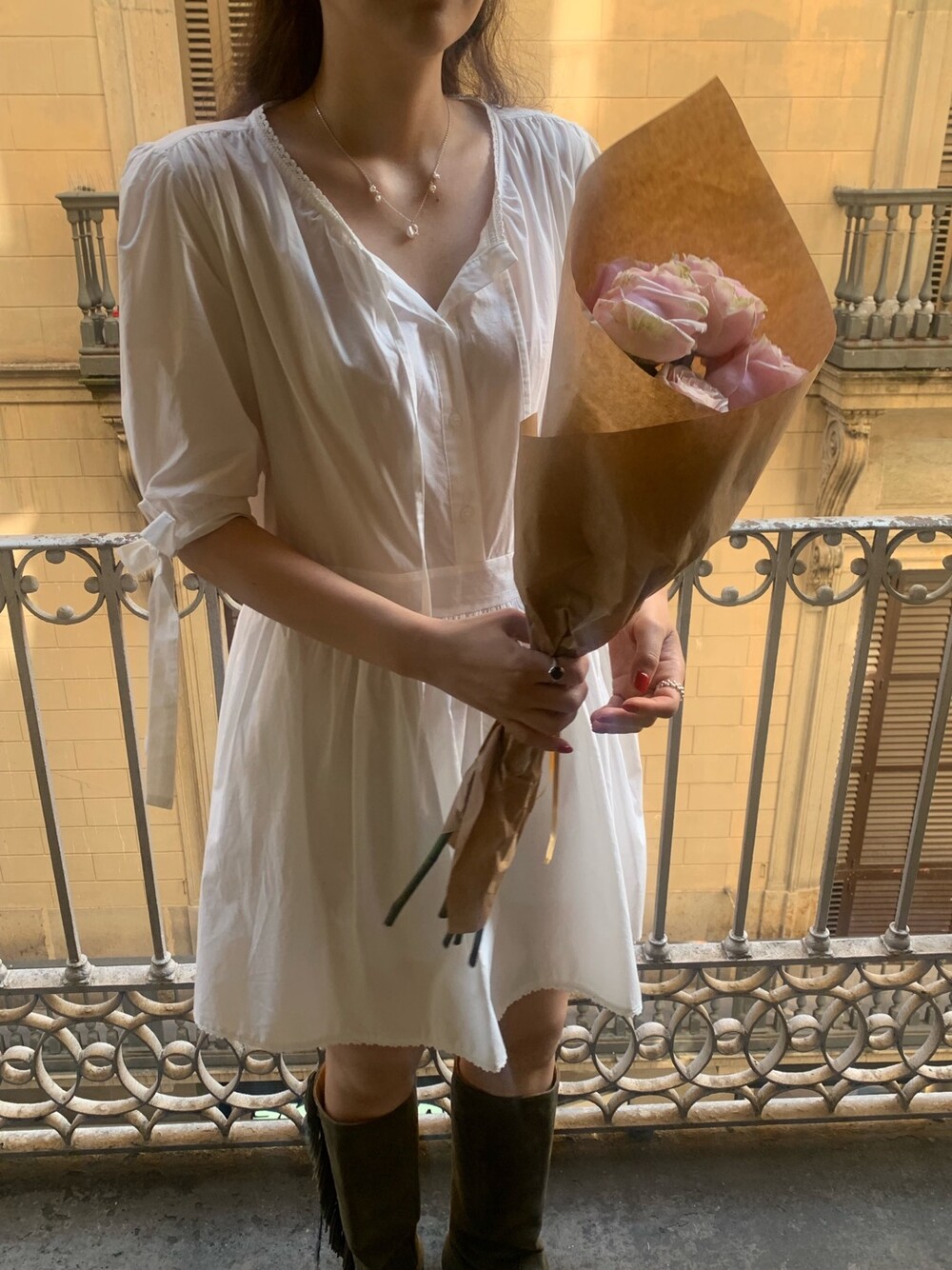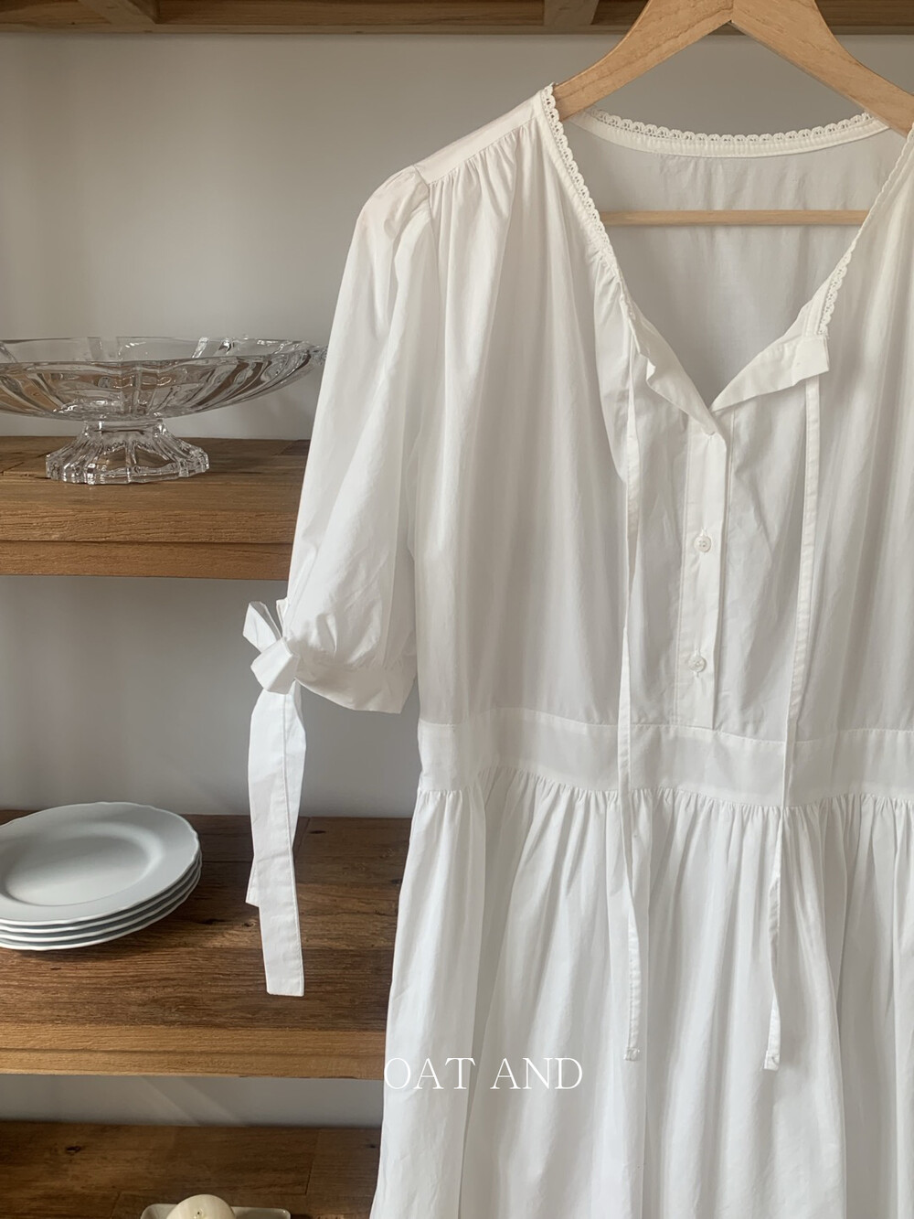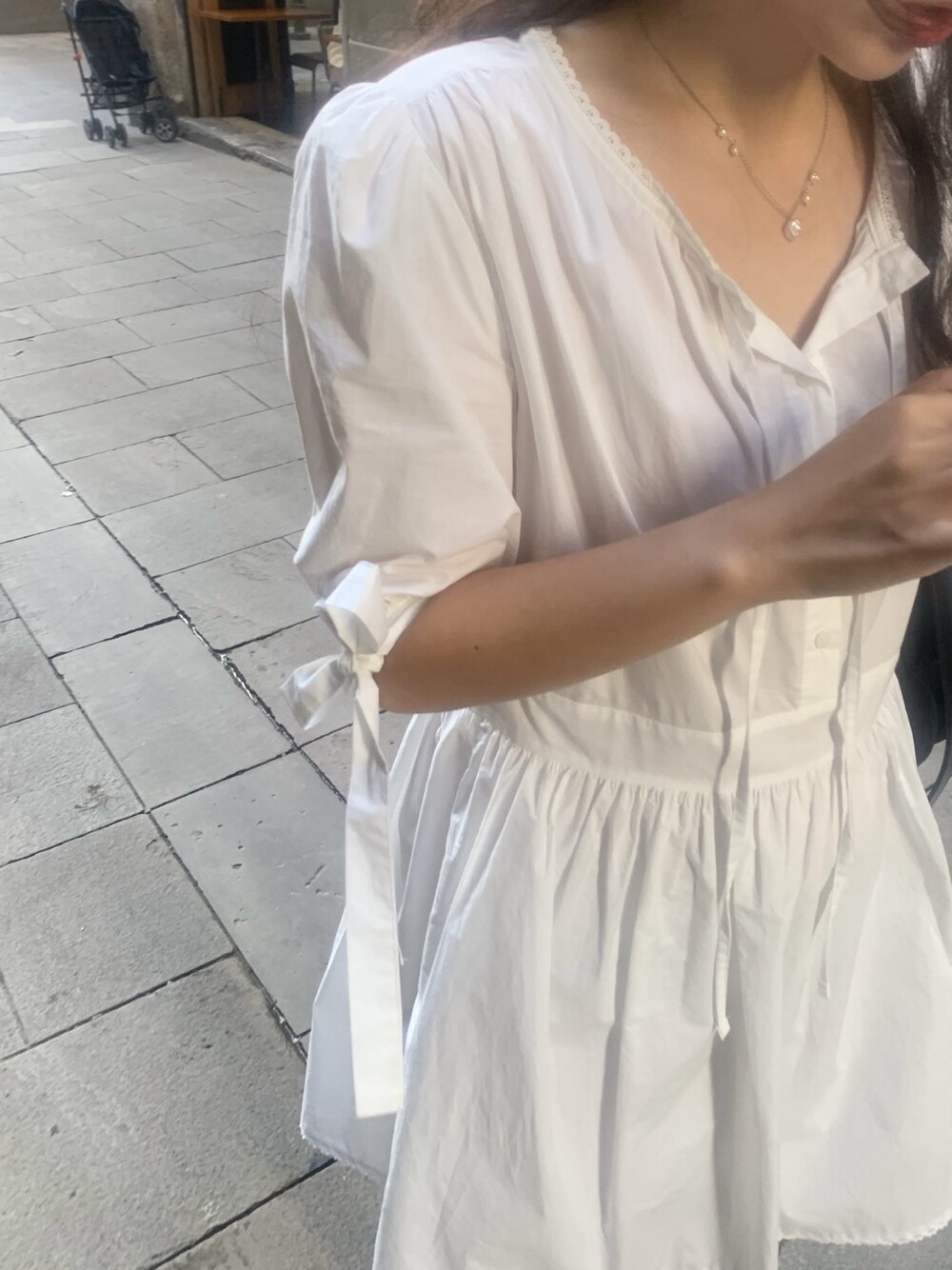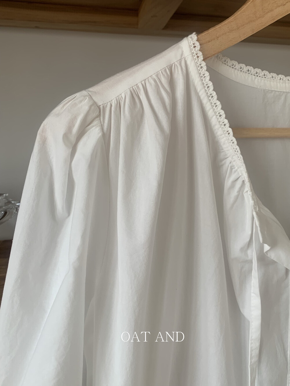한여름까지 착용하기 좋은 원단이며, 소매는 5부 길이로 로맨틱한 것 같아요~