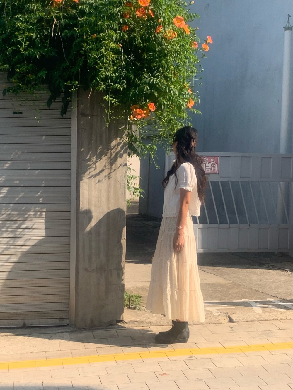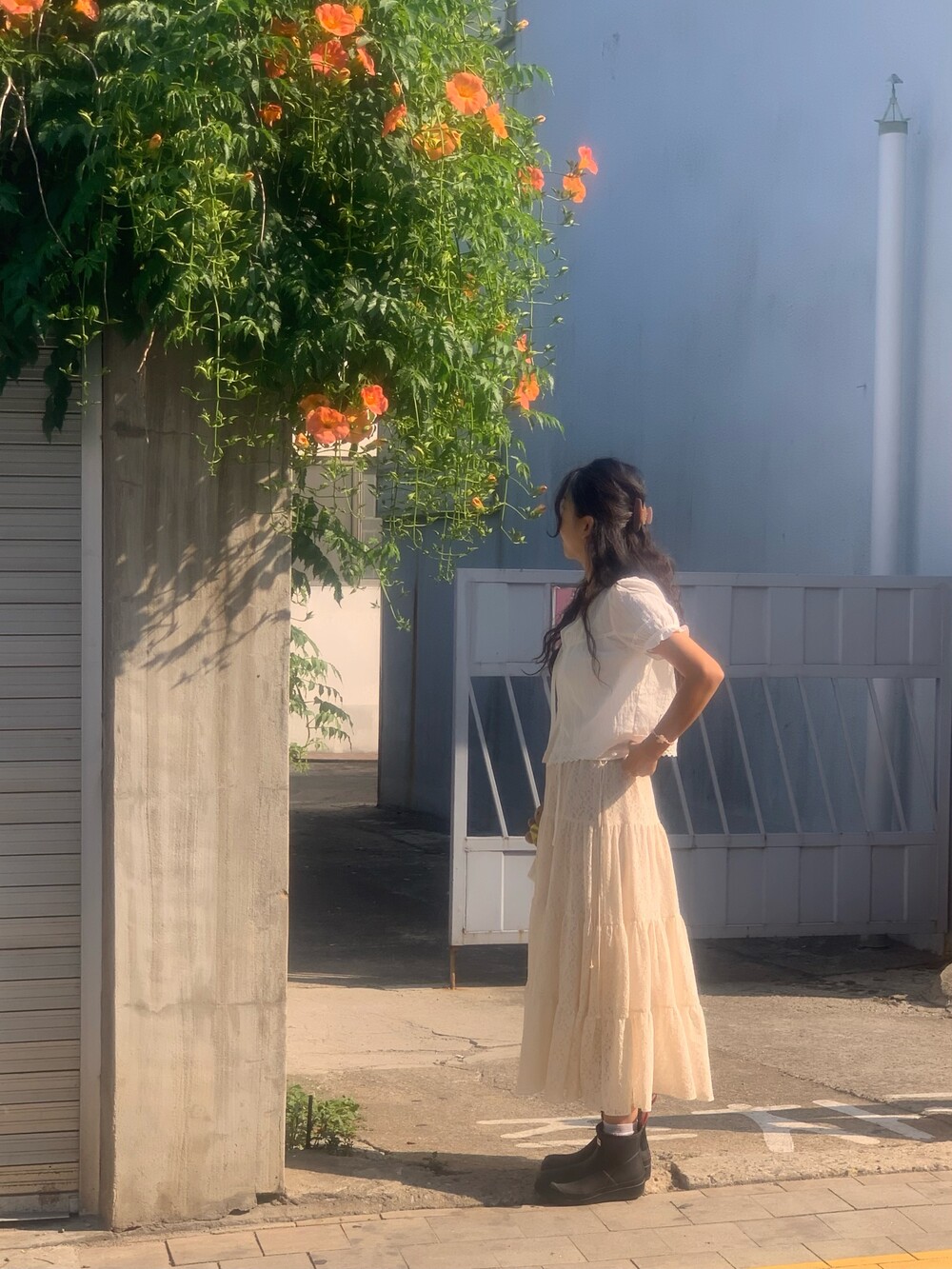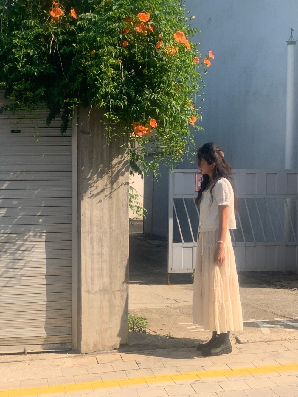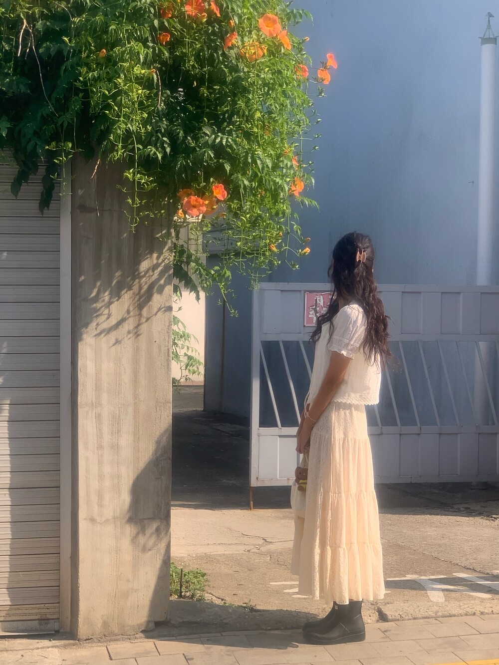 가볍고 여리여리한 소재감이 바람에 살랑이며, 마치 꽃잎이 흩날리는 듯한 실루엣을 만들어 준답니다 :)