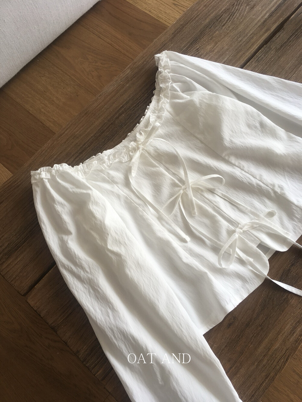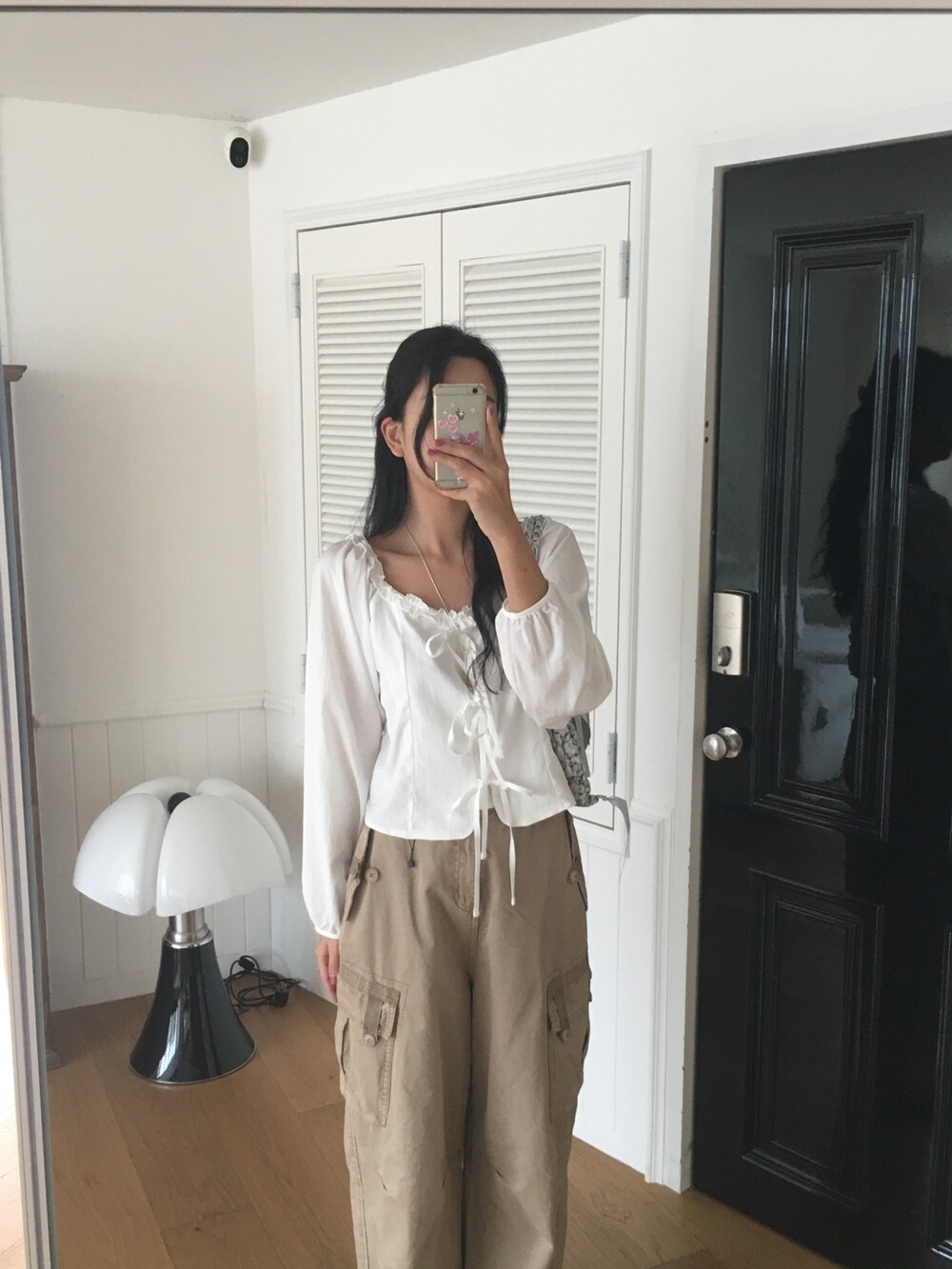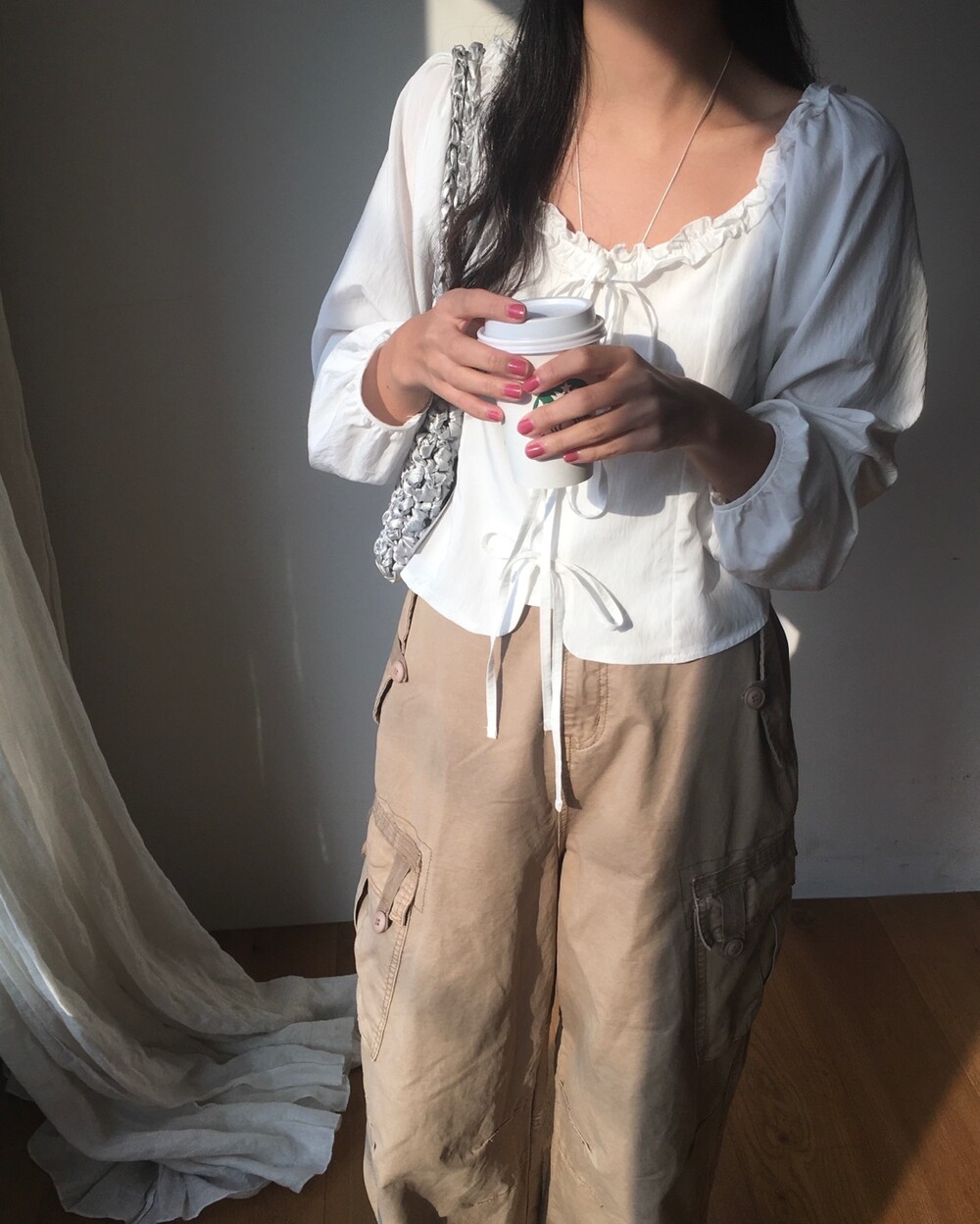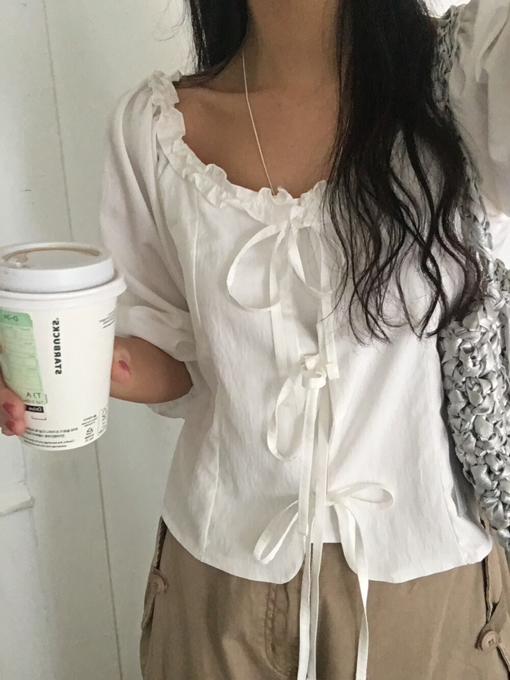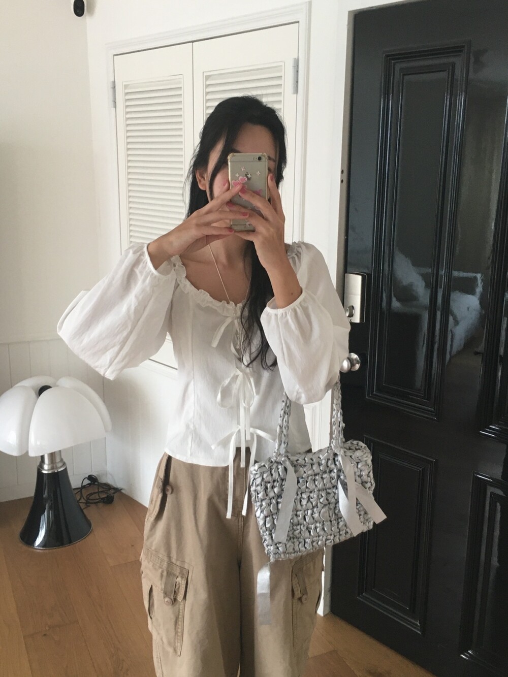 전면 중아에 세 개의 리본끈이 달려 있어 입었을때 사랑스럽고 로맨틱한 분위기를 나타내고, 넥라인을 따라 섬세한 프릴 디테일이 더해져 얼굴 라인을 화사하게 살려줍니다.