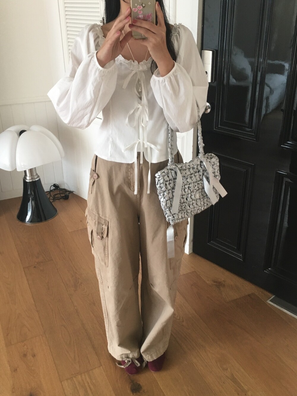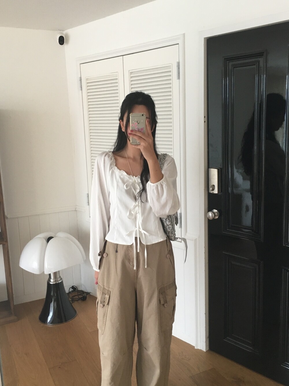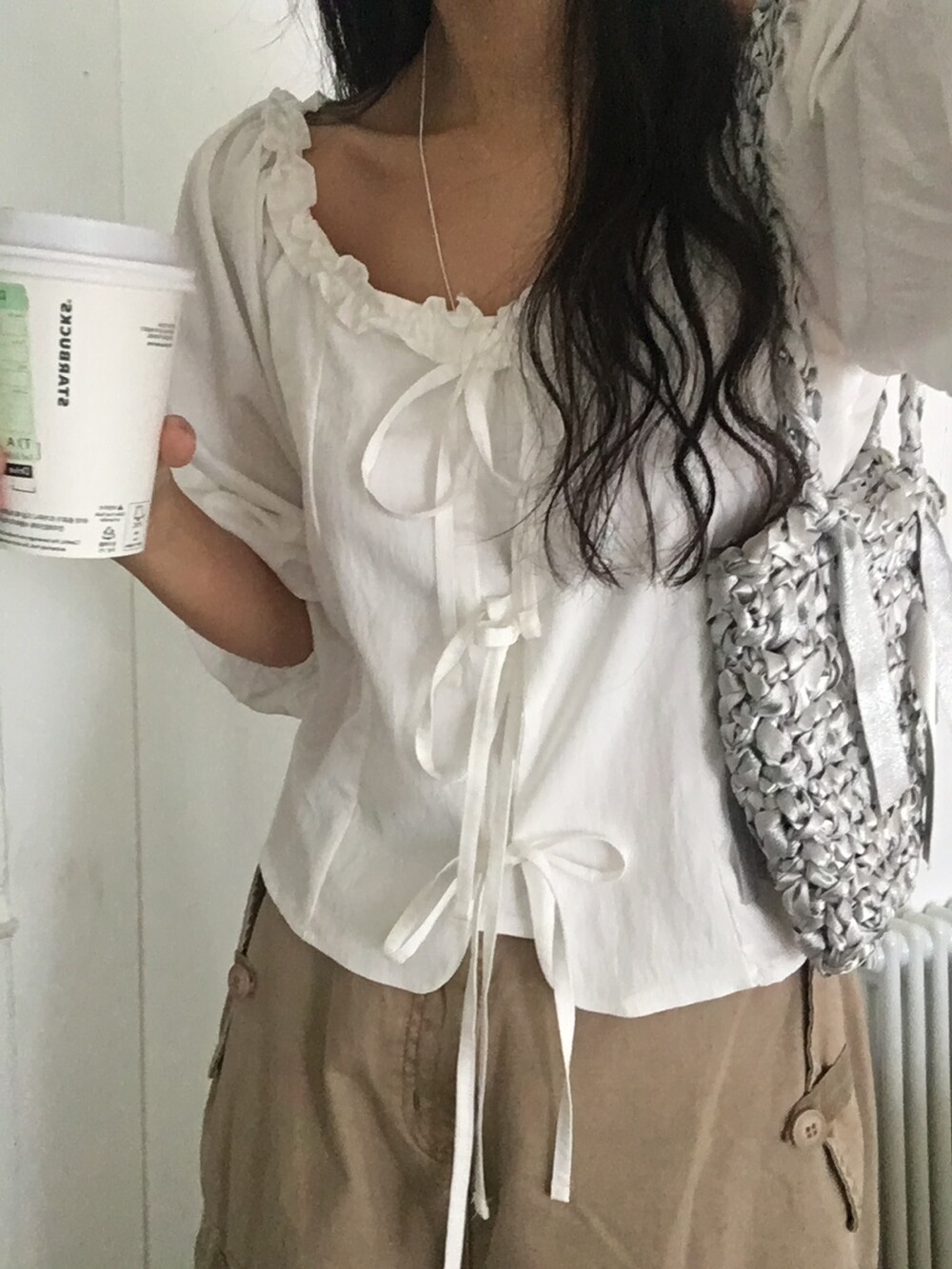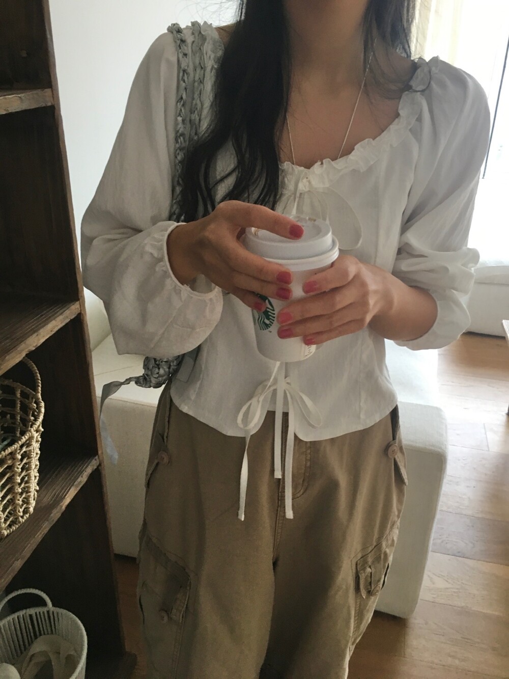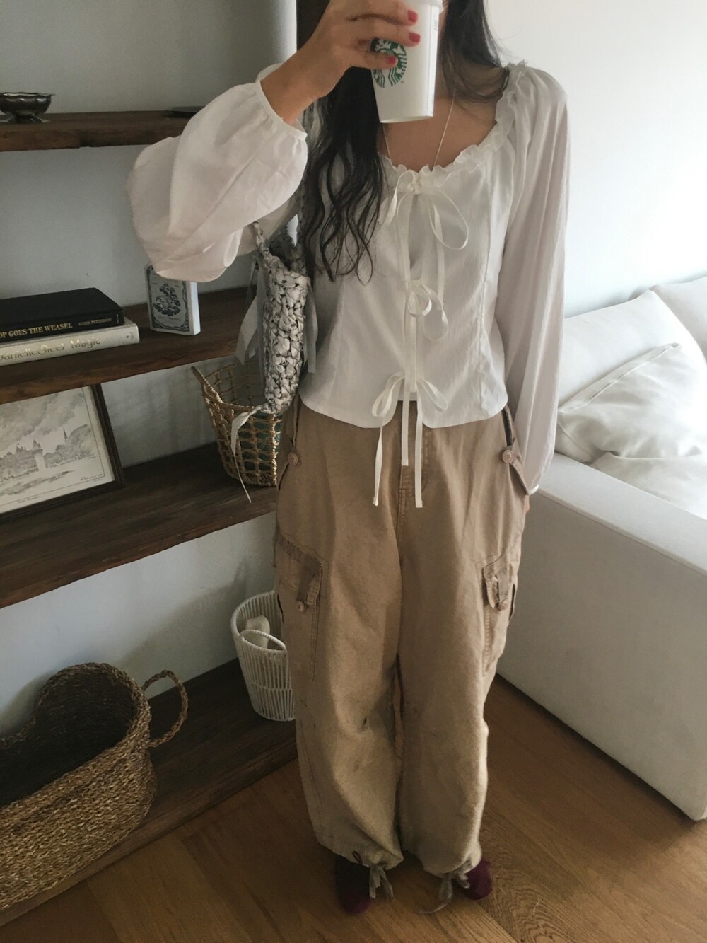 전면 중아에 세 개의 리본끈이 달려 있어 입었을때 사랑스럽고 로맨틱한 분위기를 나타내고, 넥라인을 따라 섬세한 프릴 디테일이 더해져 얼굴 라인을 화사하게 살려줍니다.