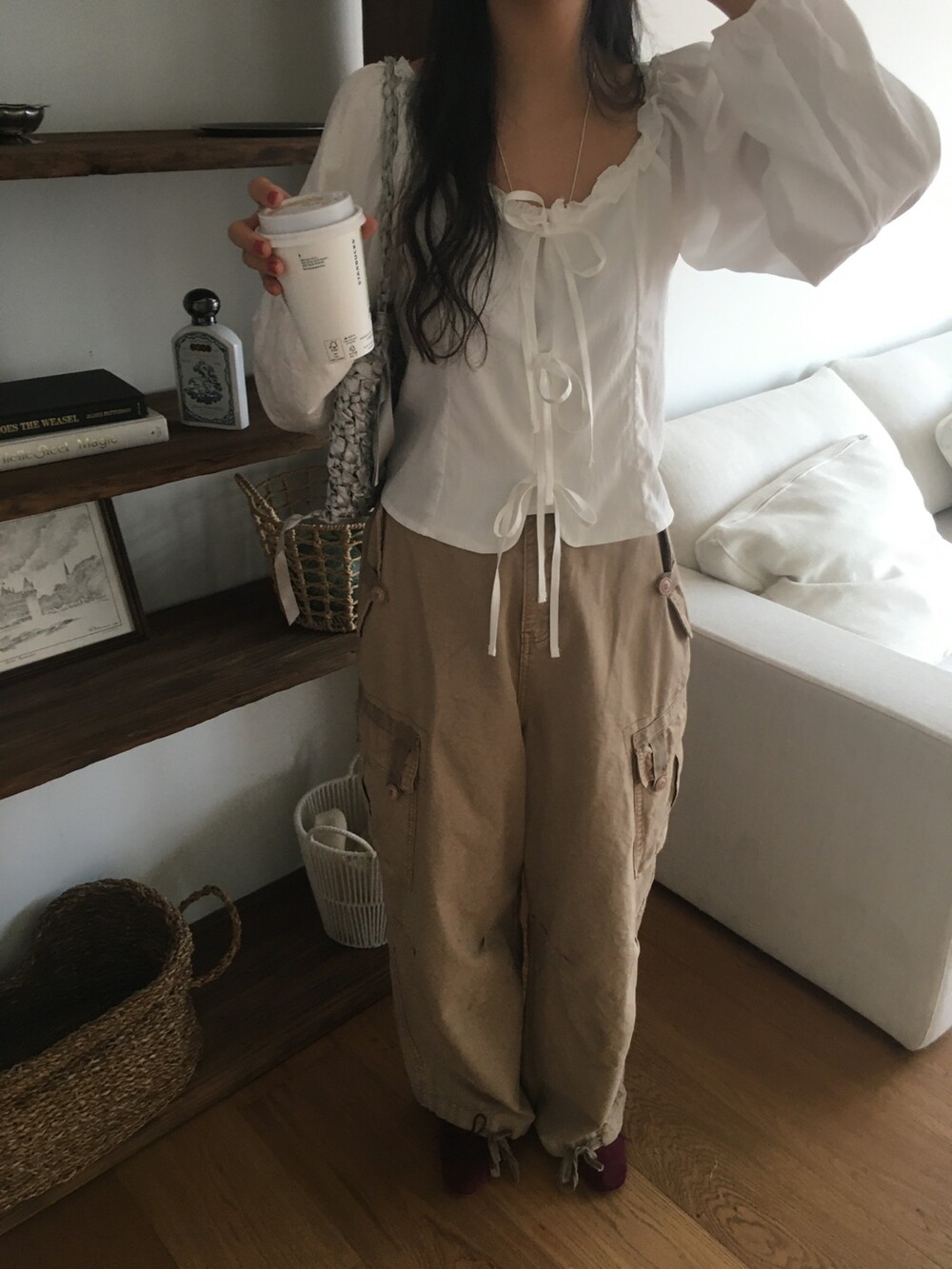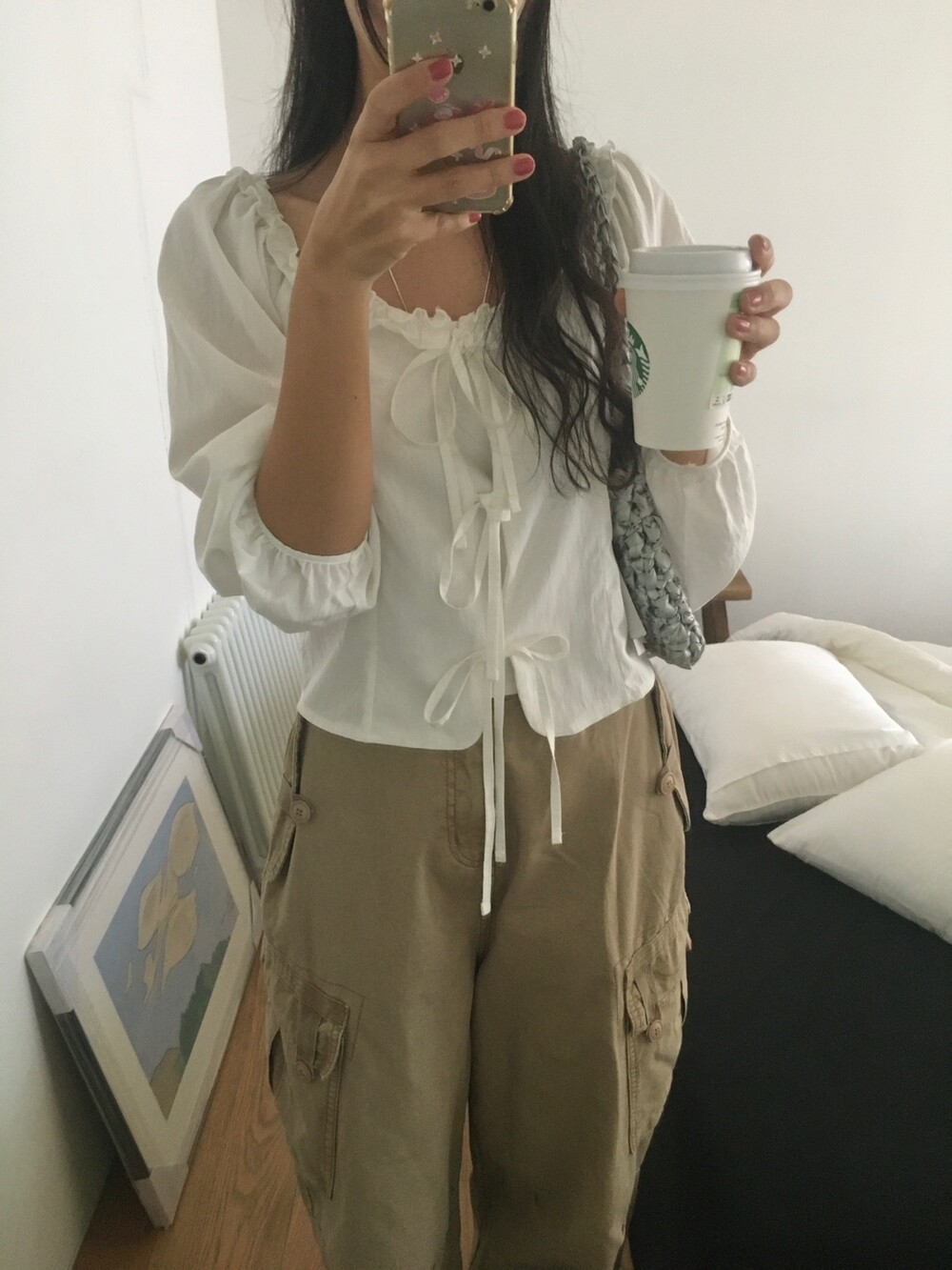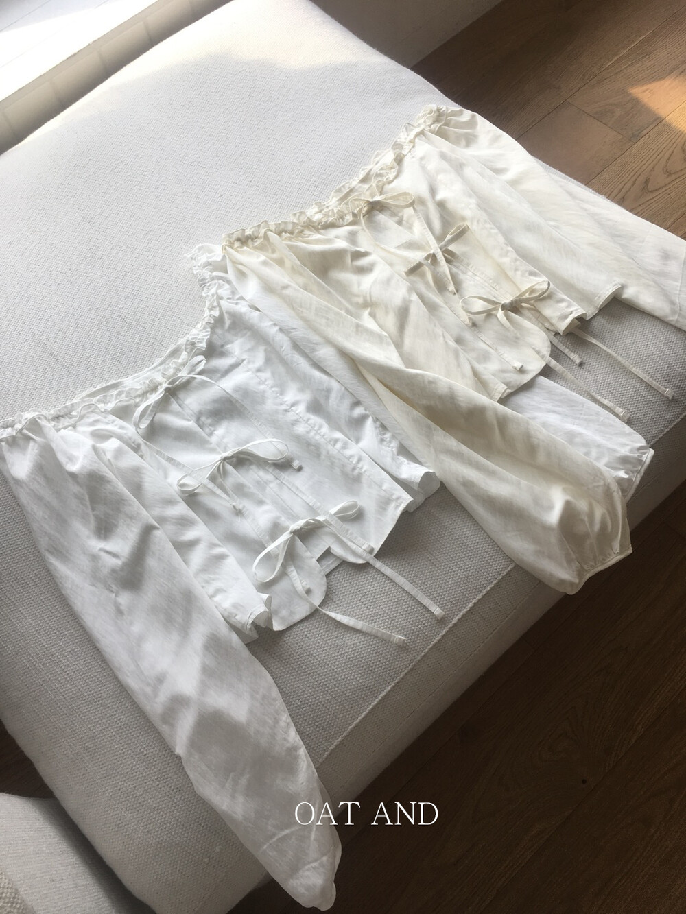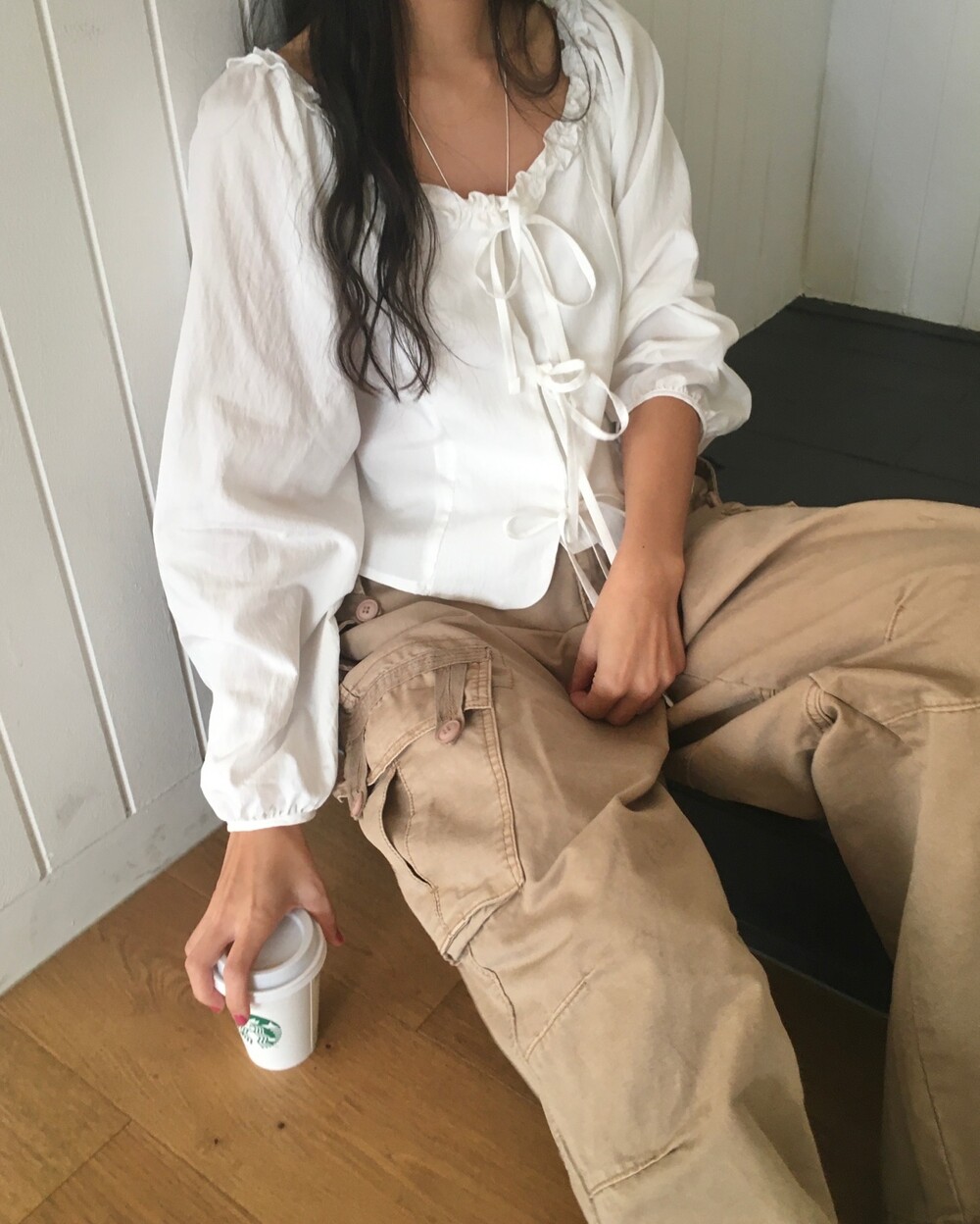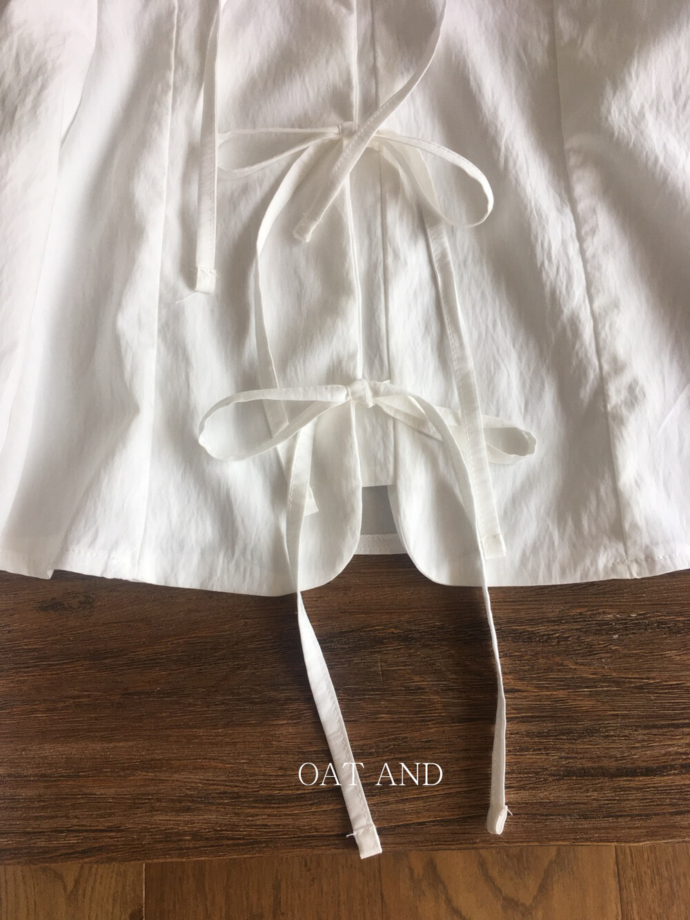 전면 중아에 세 개의 리본끈이 달려 있어 입었을때 사랑스럽고 로맨틱한 분위기를 나타내고, 넥라인을 따라 섬세한 프릴 디테일이 더해져 얼굴 라인을 화사하게 살려줍니다.