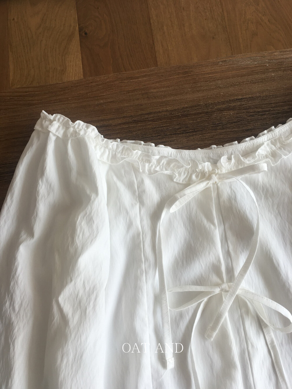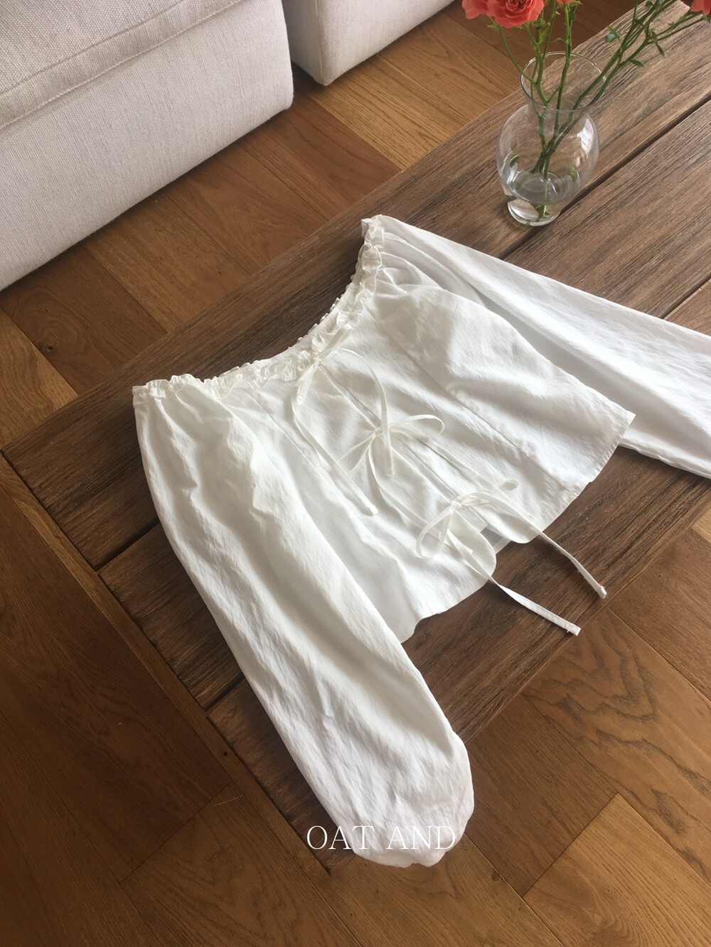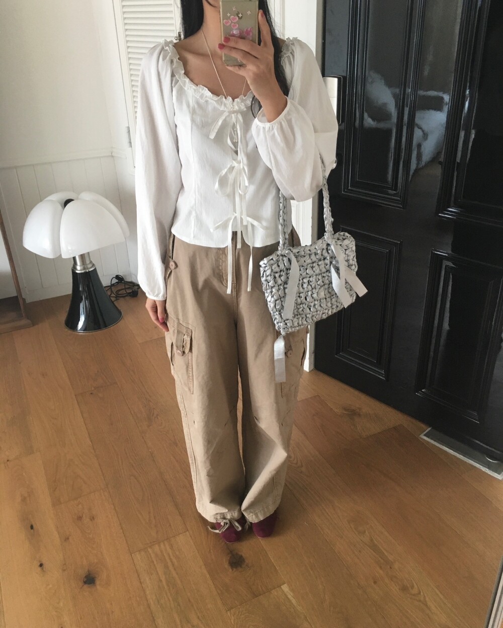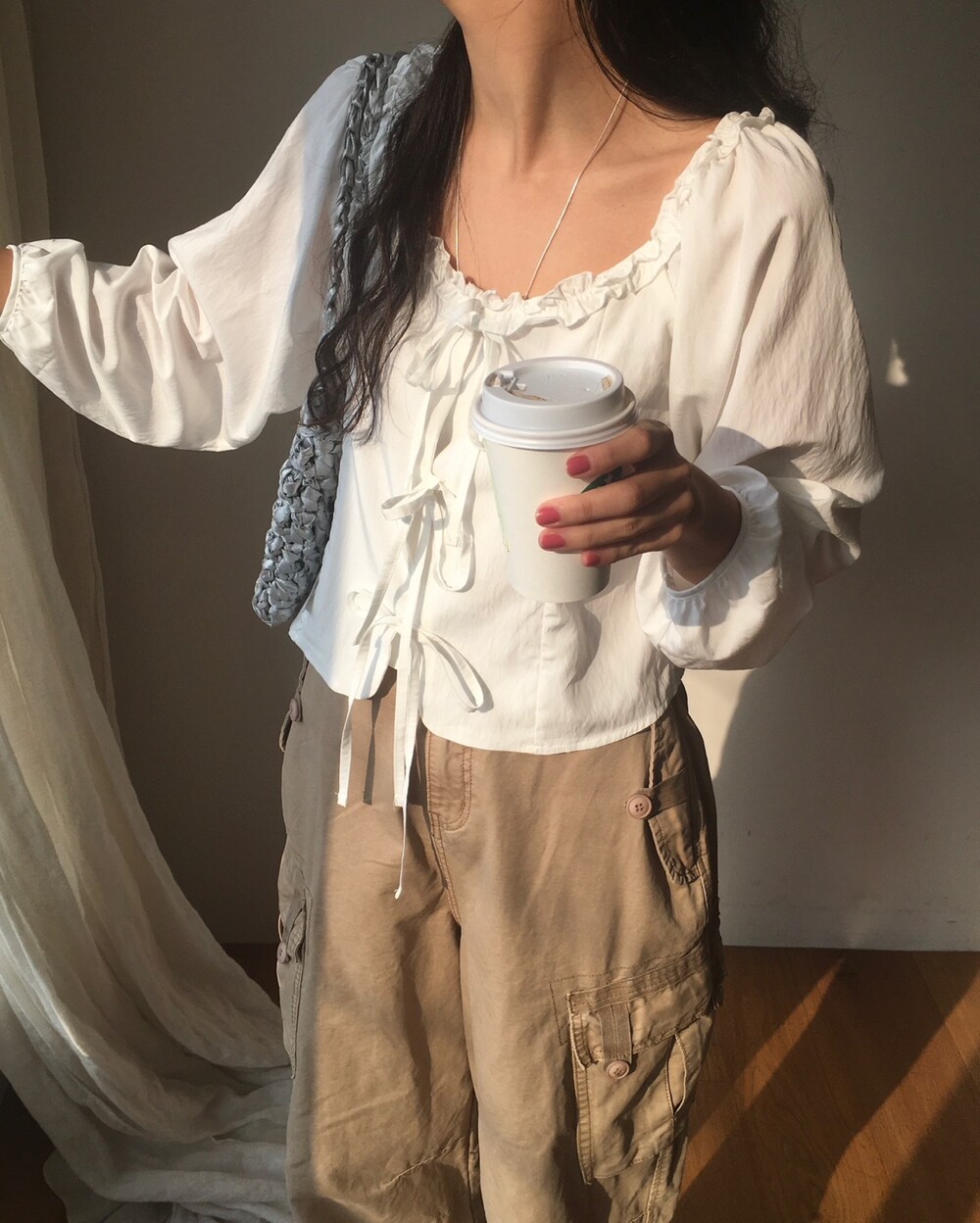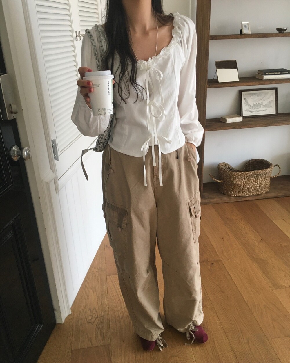 전면 중아에 세 개의 리본끈이 달려 있어 입었을때 사랑스럽고 로맨틱한 분위기를 나타내고, 넥라인을 따라 섬세한 프릴 디테일이 더해져 얼굴 라인을 화사하게 살려줍니다.