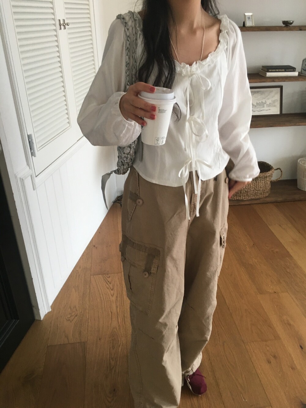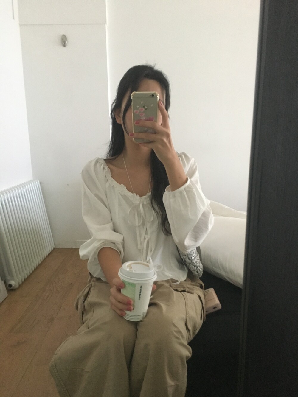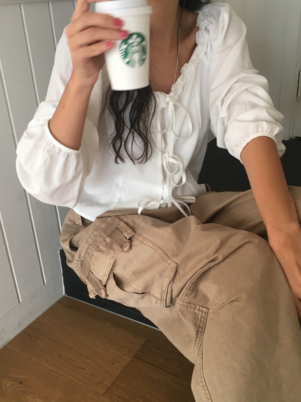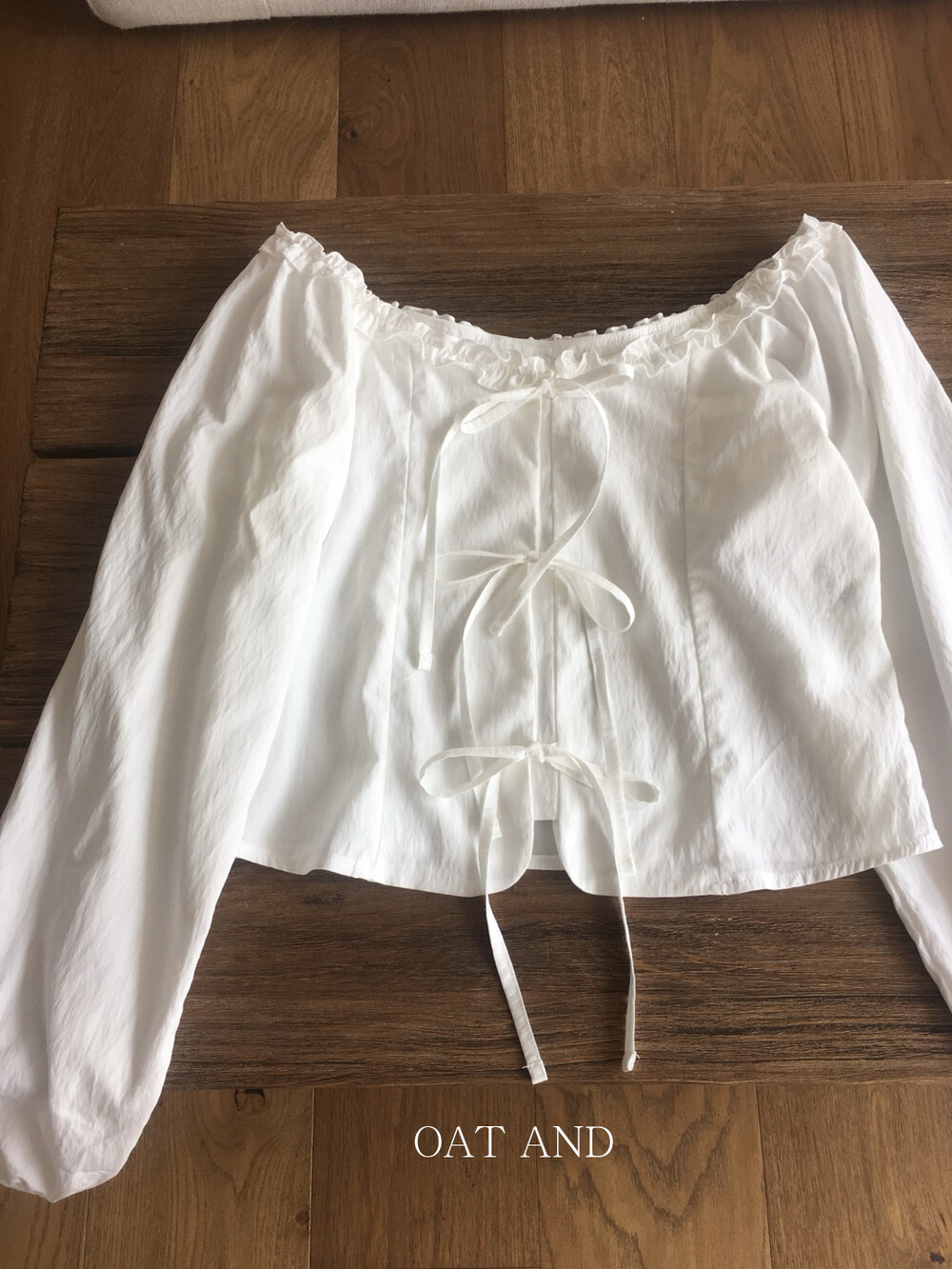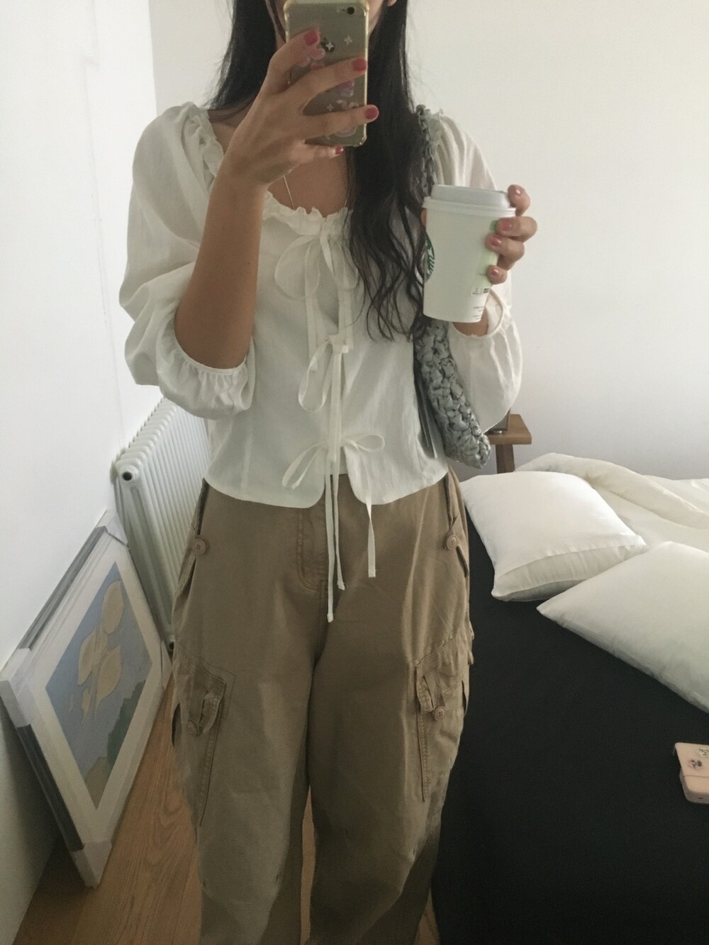 전면 중아에 세 개의 리본끈이 달려 있어 입었을때 사랑스럽고 로맨틱한 분위기를 나타내고, 넥라인을 따라 섬세한 프릴 디테일이 더해져 얼굴 라인을 화사하게 살려줍니다.