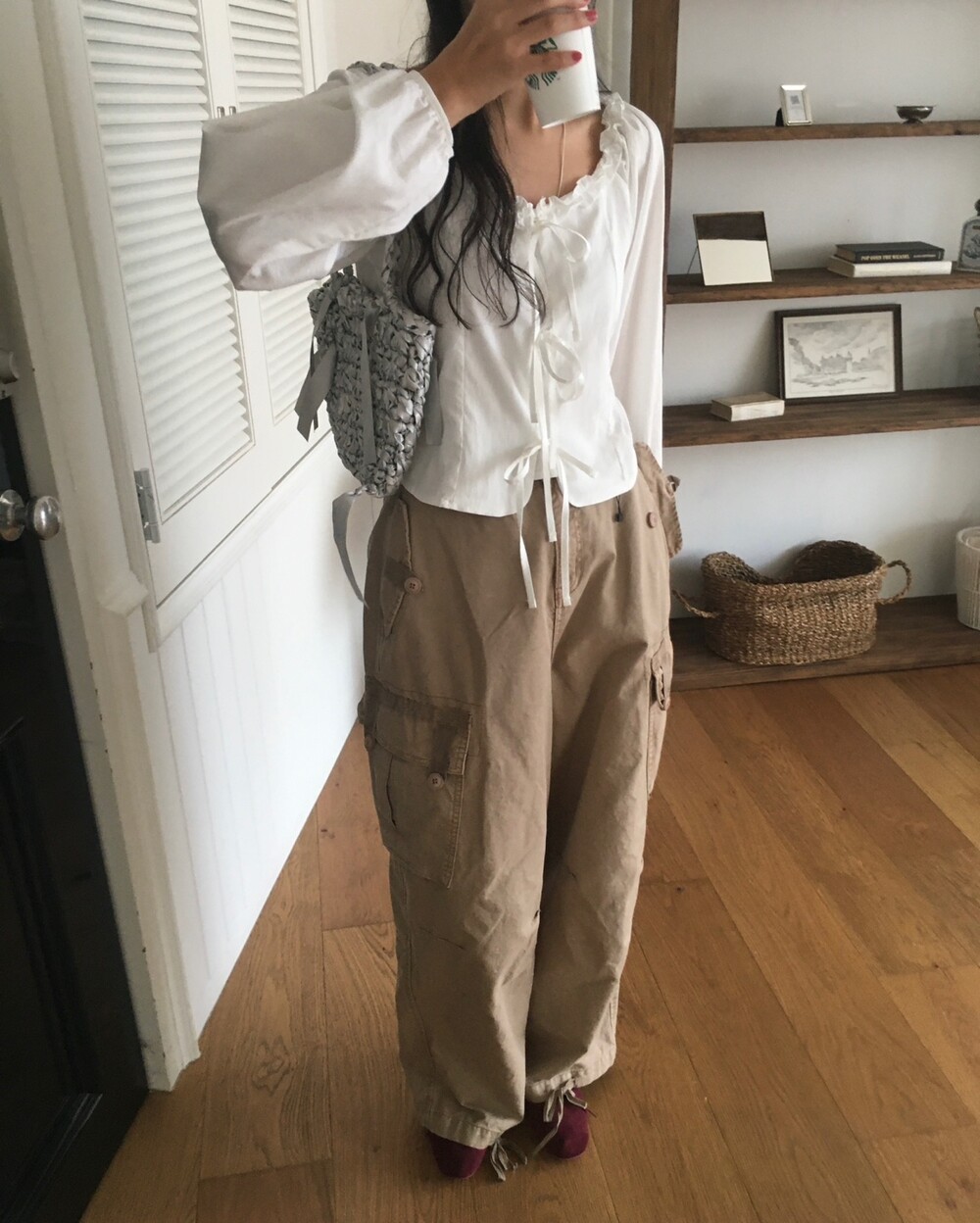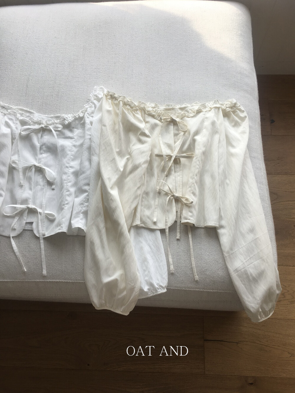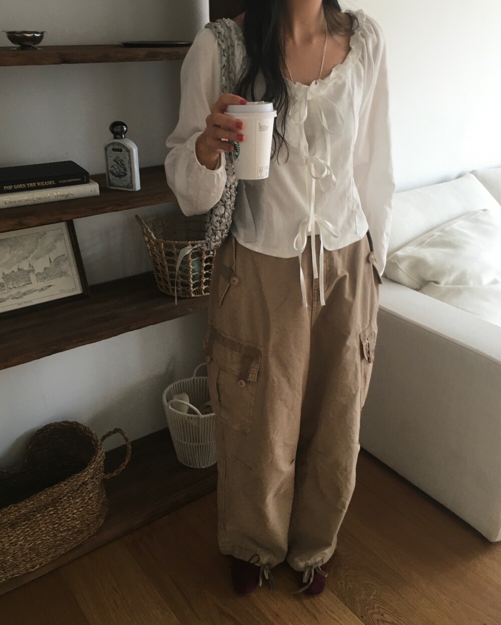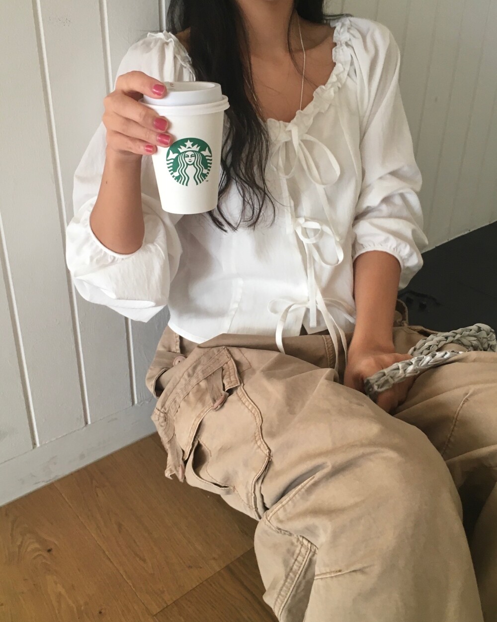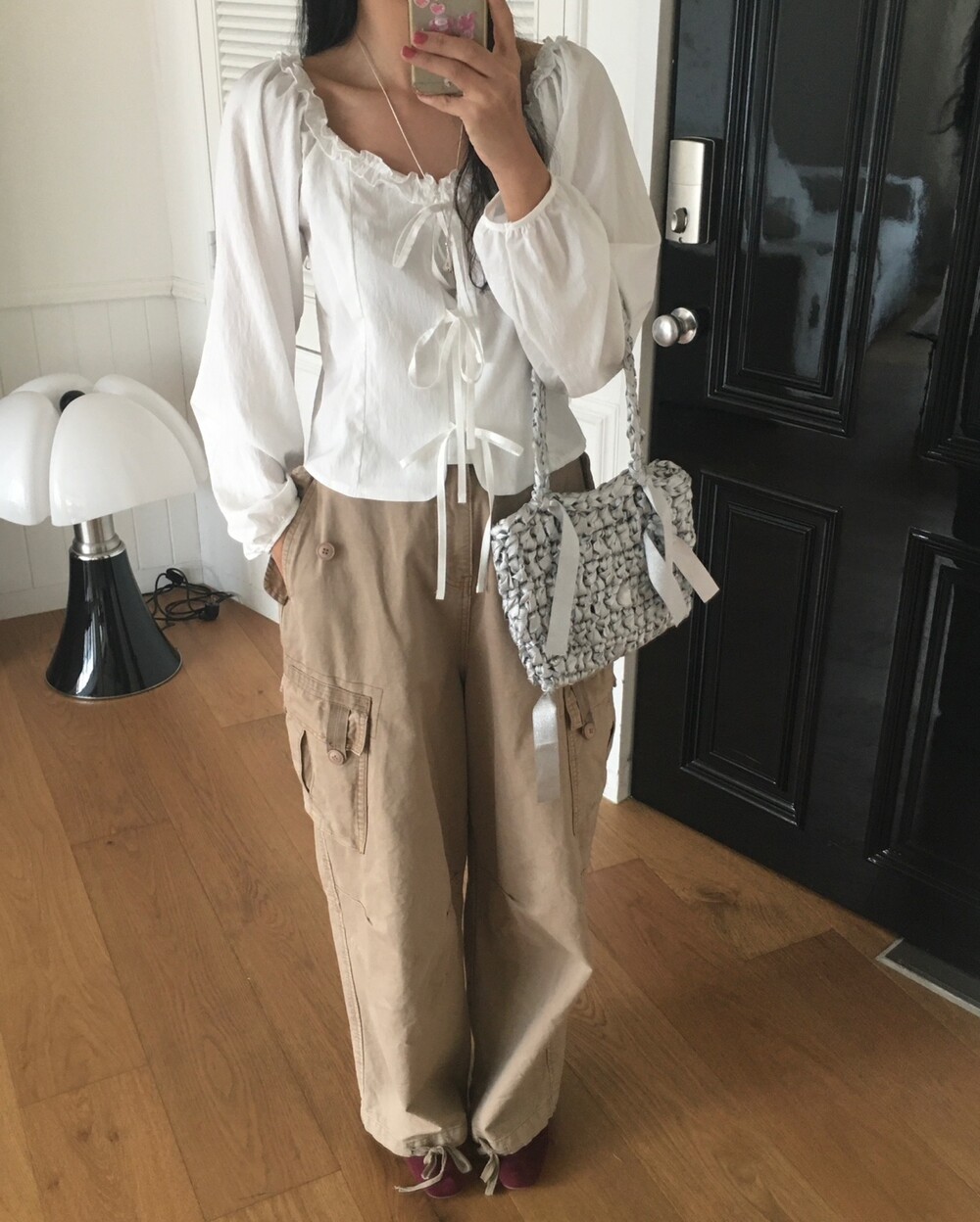 전면 중아에 세 개의 리본끈이 달려 있어 입었을때 사랑스럽고 로맨틱한 분위기를 나타내고, 넥라인을 따라 섬세한 프릴 디테일이 더해져 얼굴 라인을 화사하게 살려줍니다.