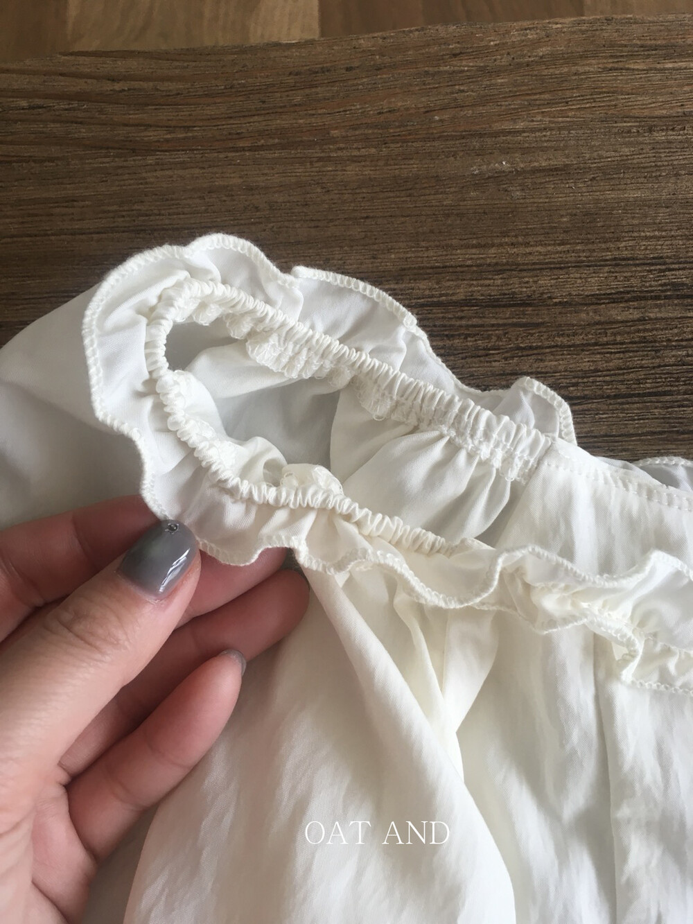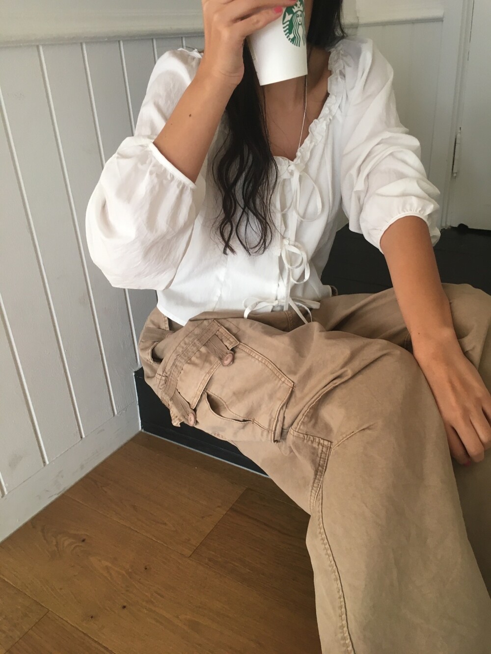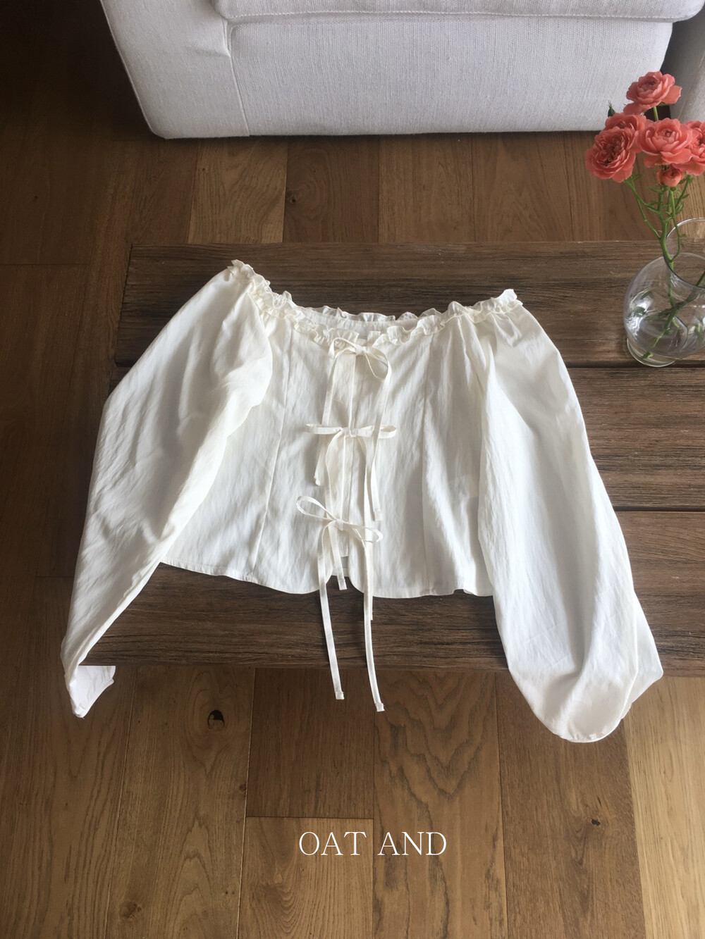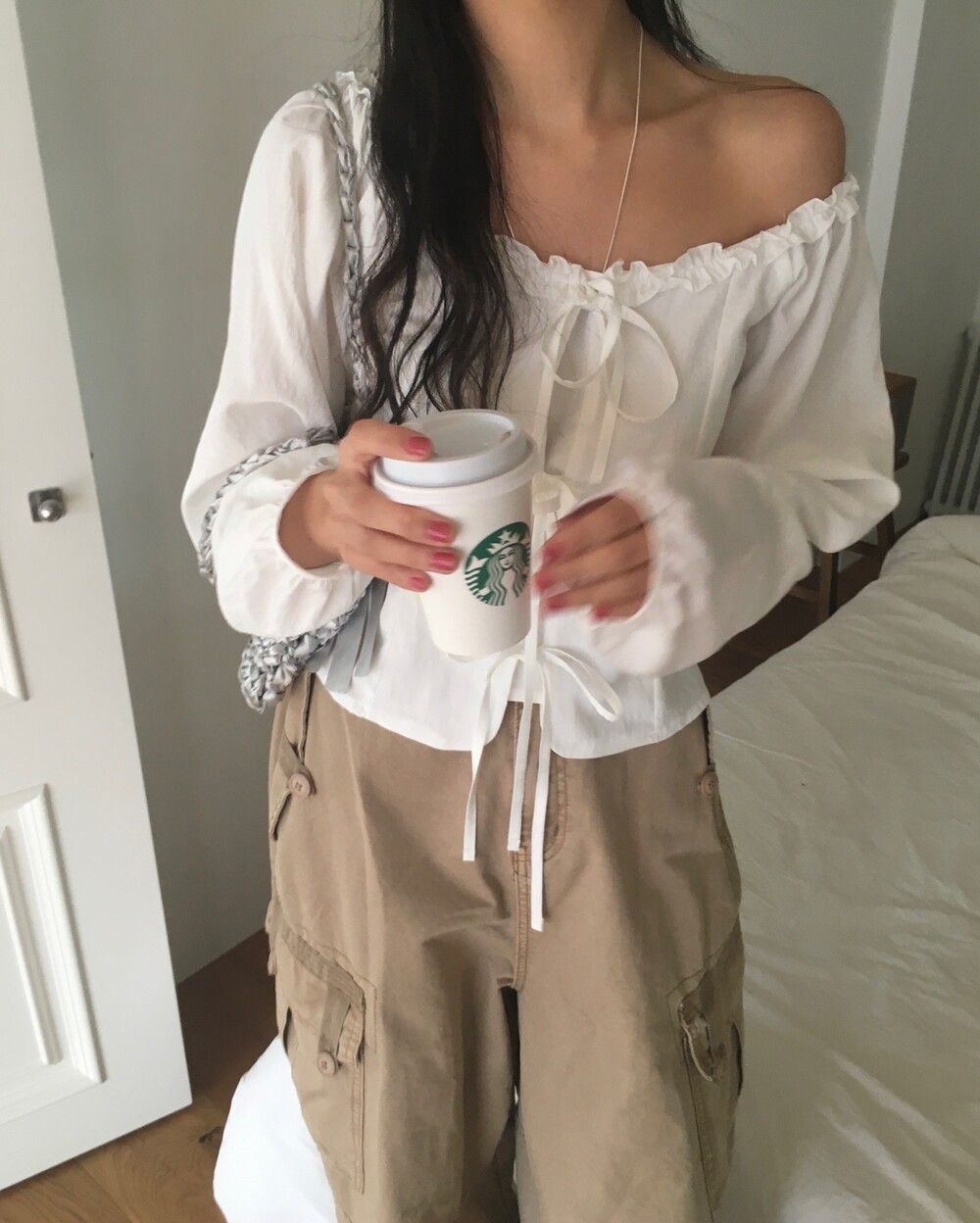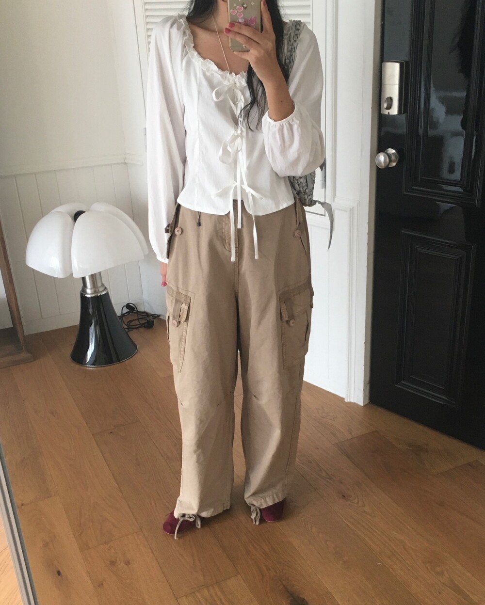 전면 중아에 세 개의 리본끈이 달려 있어 입었을때 사랑스럽고 로맨틱한 분위기를 나타내고, 넥라인을 따라 섬세한 프릴 디테일이 더해져 얼굴 라인을 화사하게 살려줍니다.
