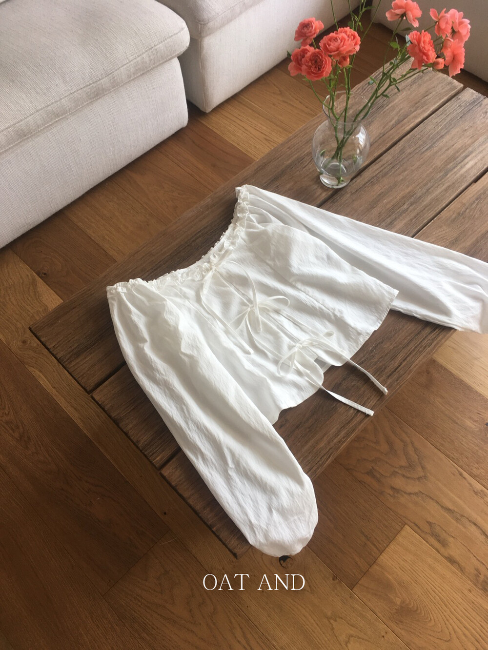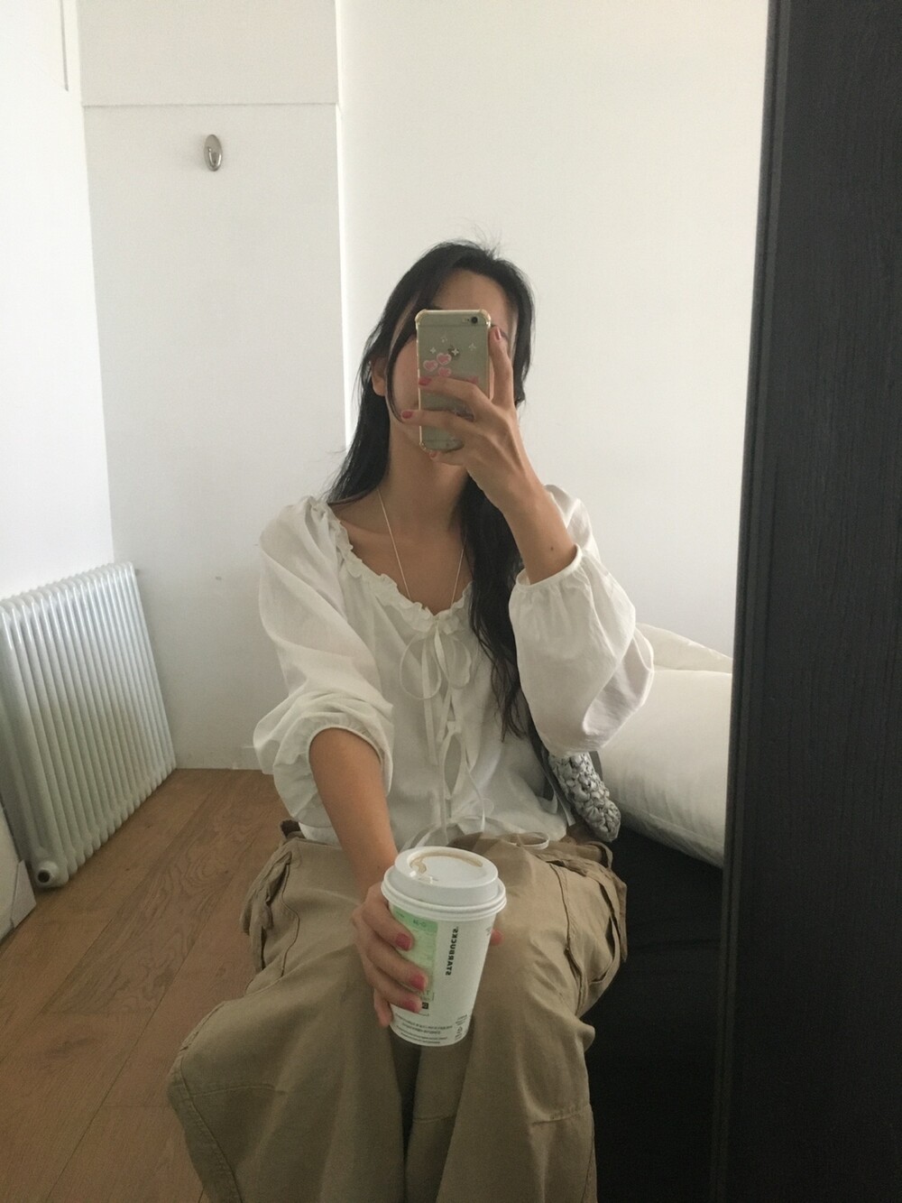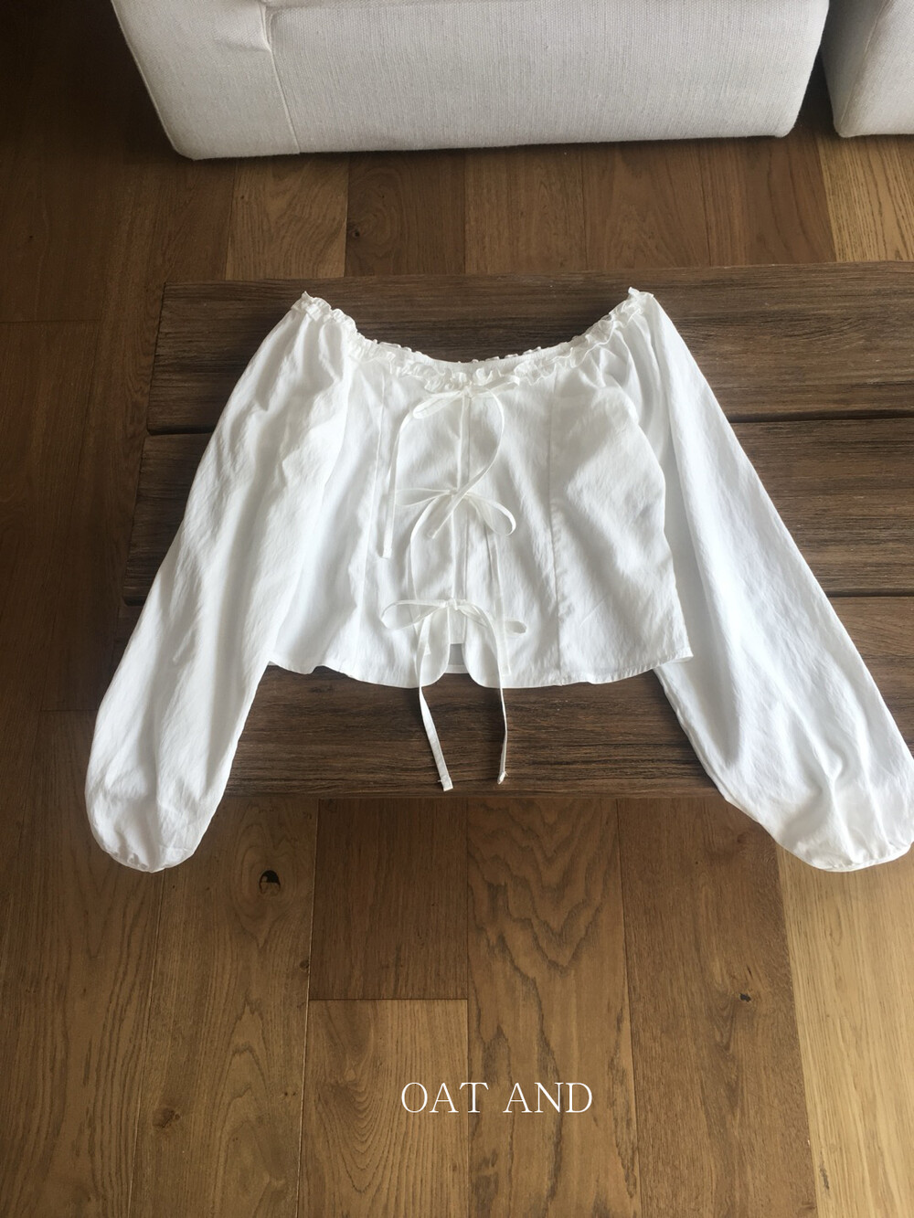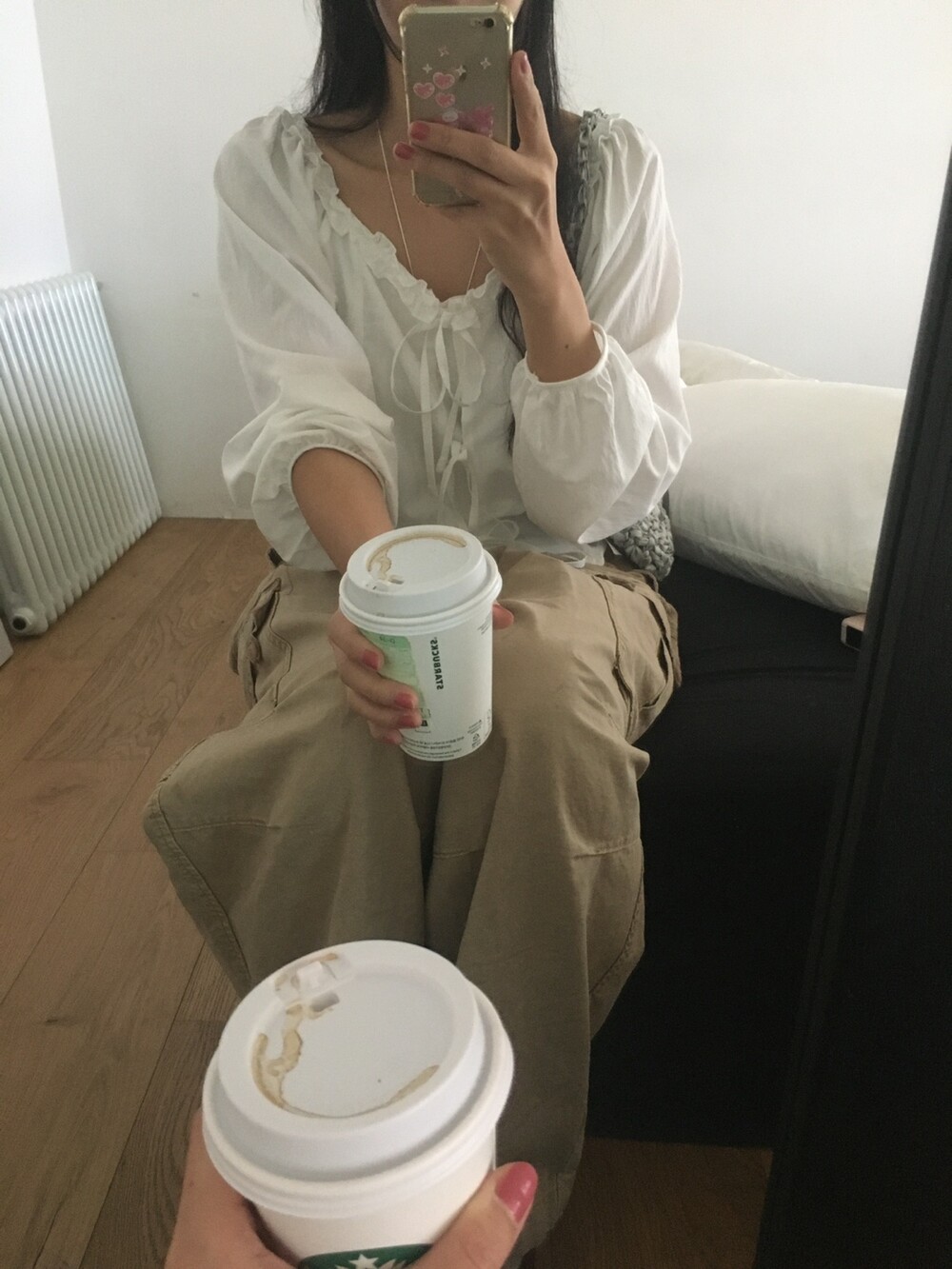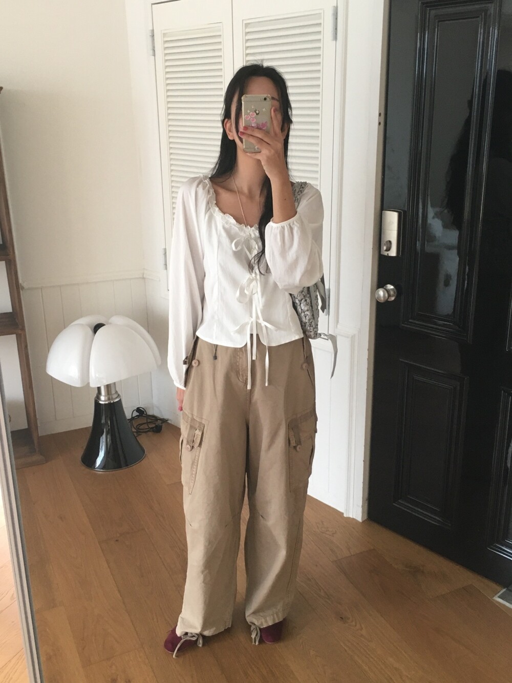 전면 중아에 세 개의 리본끈이 달려 있어 입었을때 사랑스럽고 로맨틱한 분위기를 나타내고, 넥라인을 따라 섬세한 프릴 디테일이 더해져 얼굴 라인을 화사하게 살려줍니다.