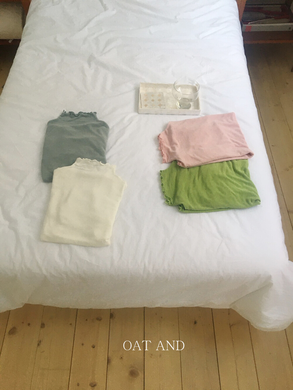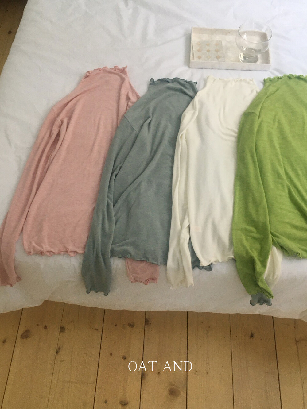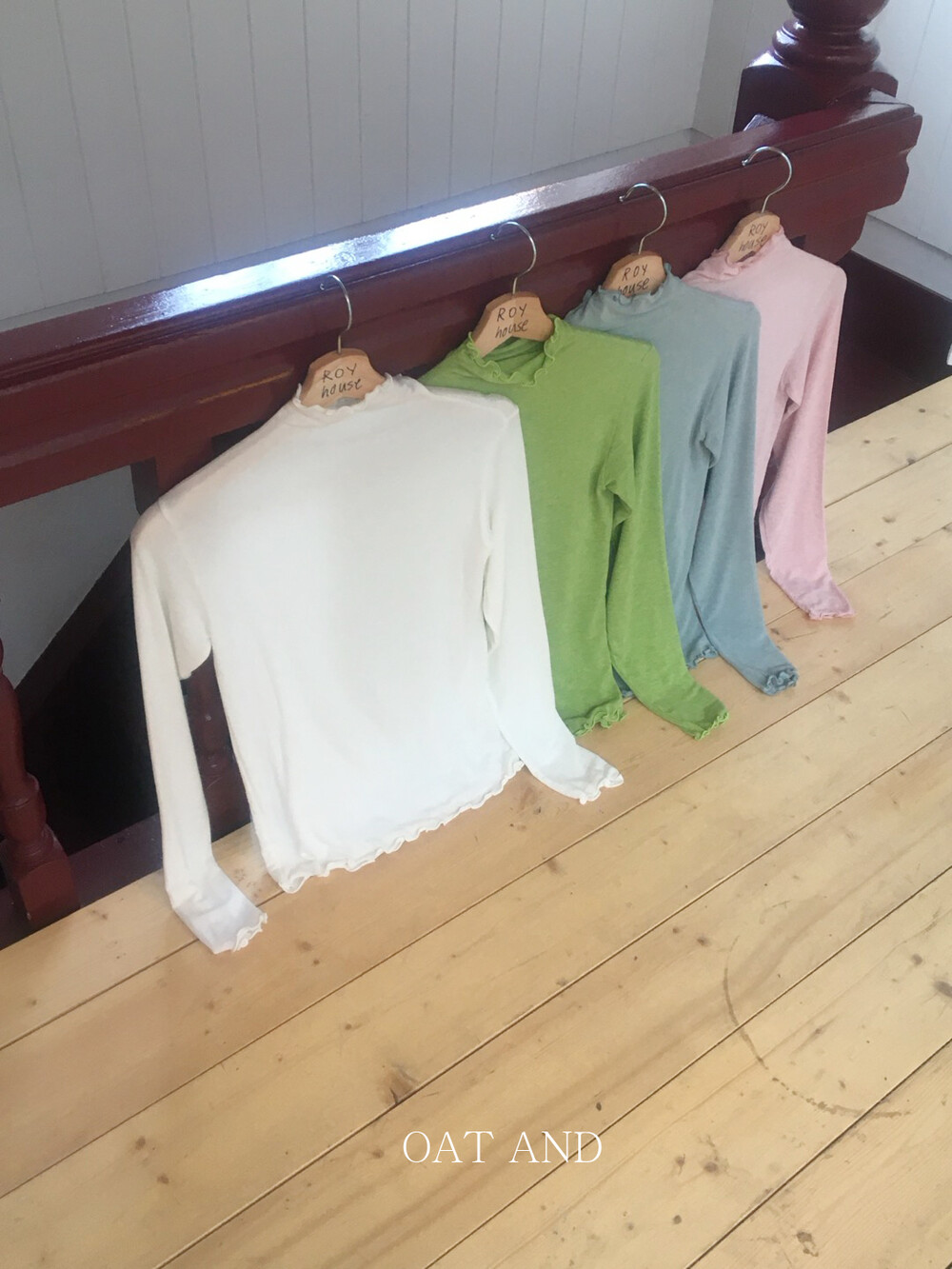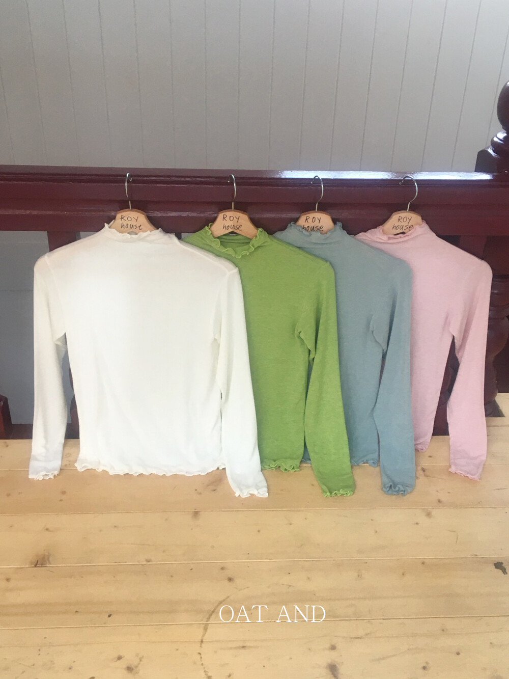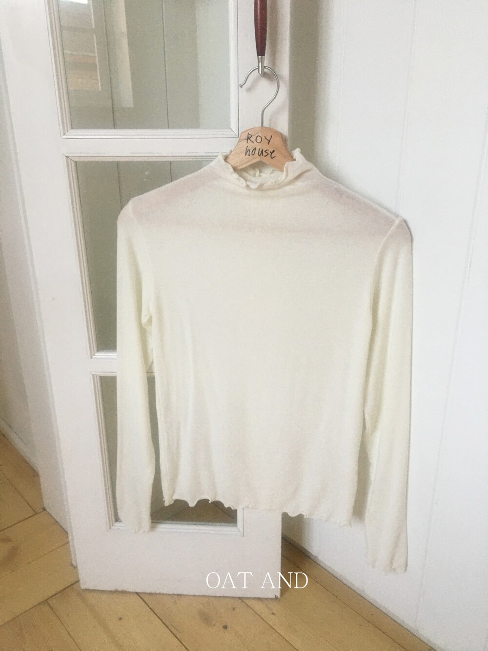 잔잔하게 퍼지는 프릴 물결 마감이 얼굴선을 더욱 부드럽게 살려주고, 편안한 신축성과 가벼운 착용감으로 하루 종일 부담 없이 입을 수 있는 데일리 탑이에요!