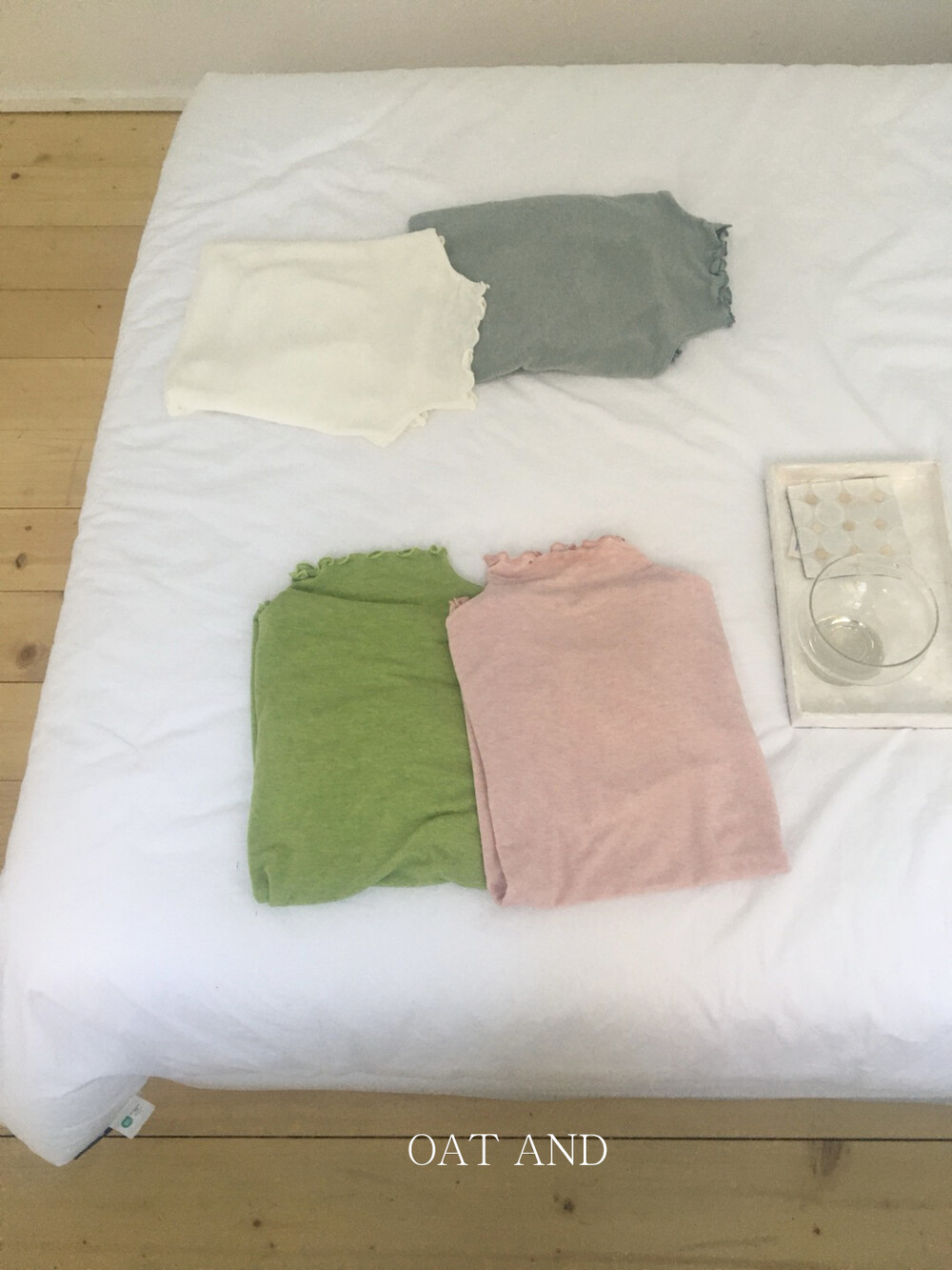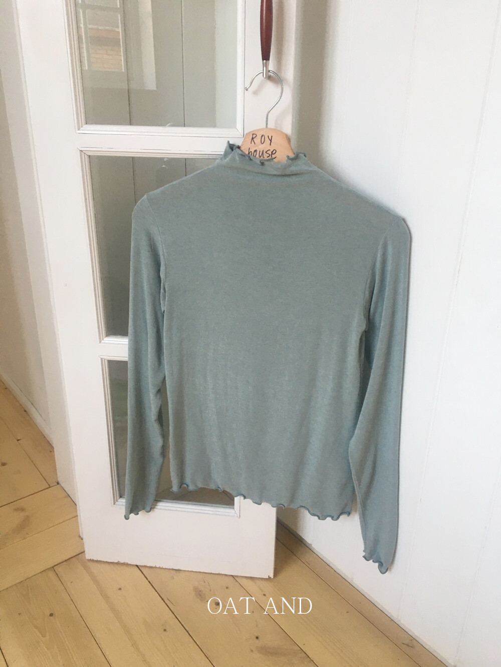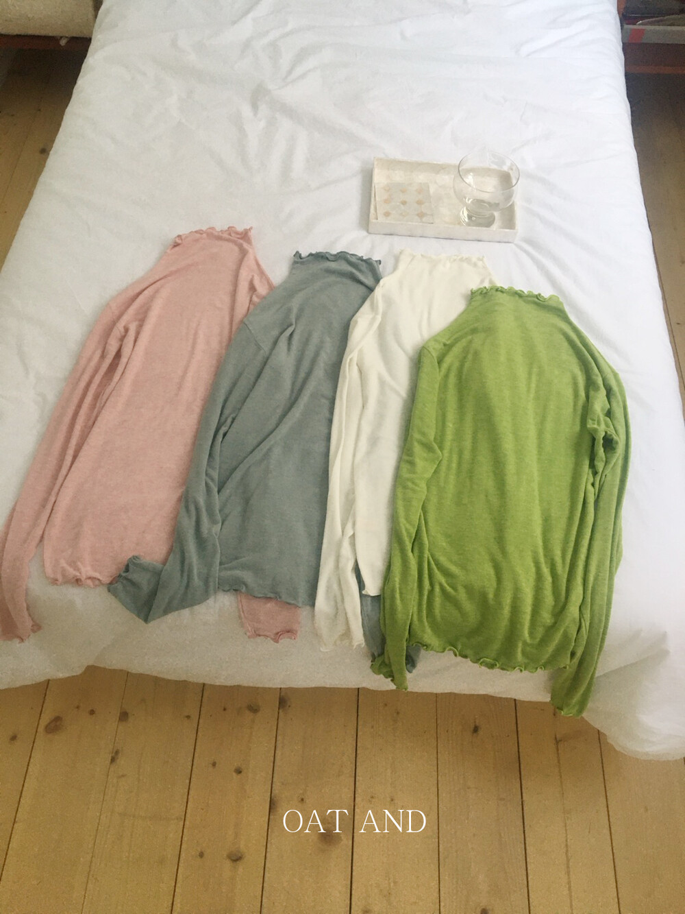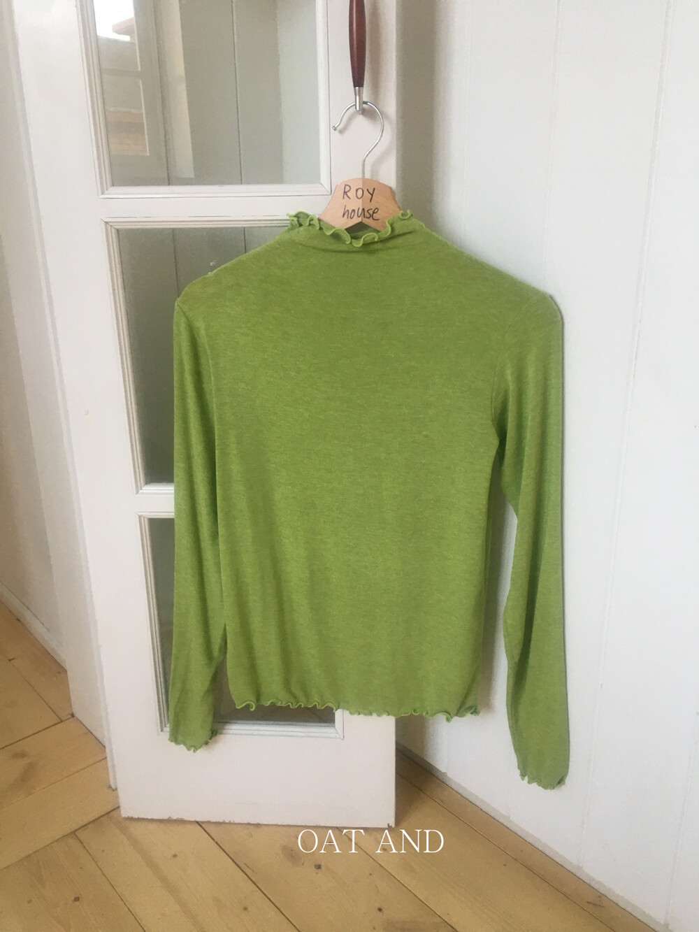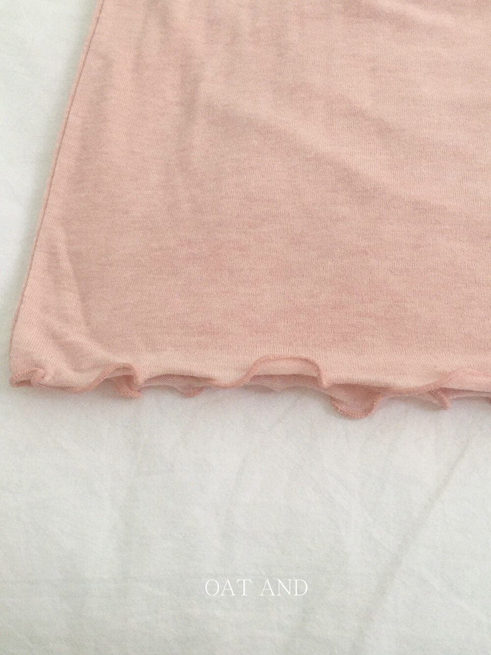 잔잔하게 퍼지는 프릴 물결 마감이 얼굴선을 더욱 부드럽게 살려주고, 편안한 신축성과 가벼운 착용감으로 하루 종일 부담 없이 입을 수 있는 데일리 탑이에요!