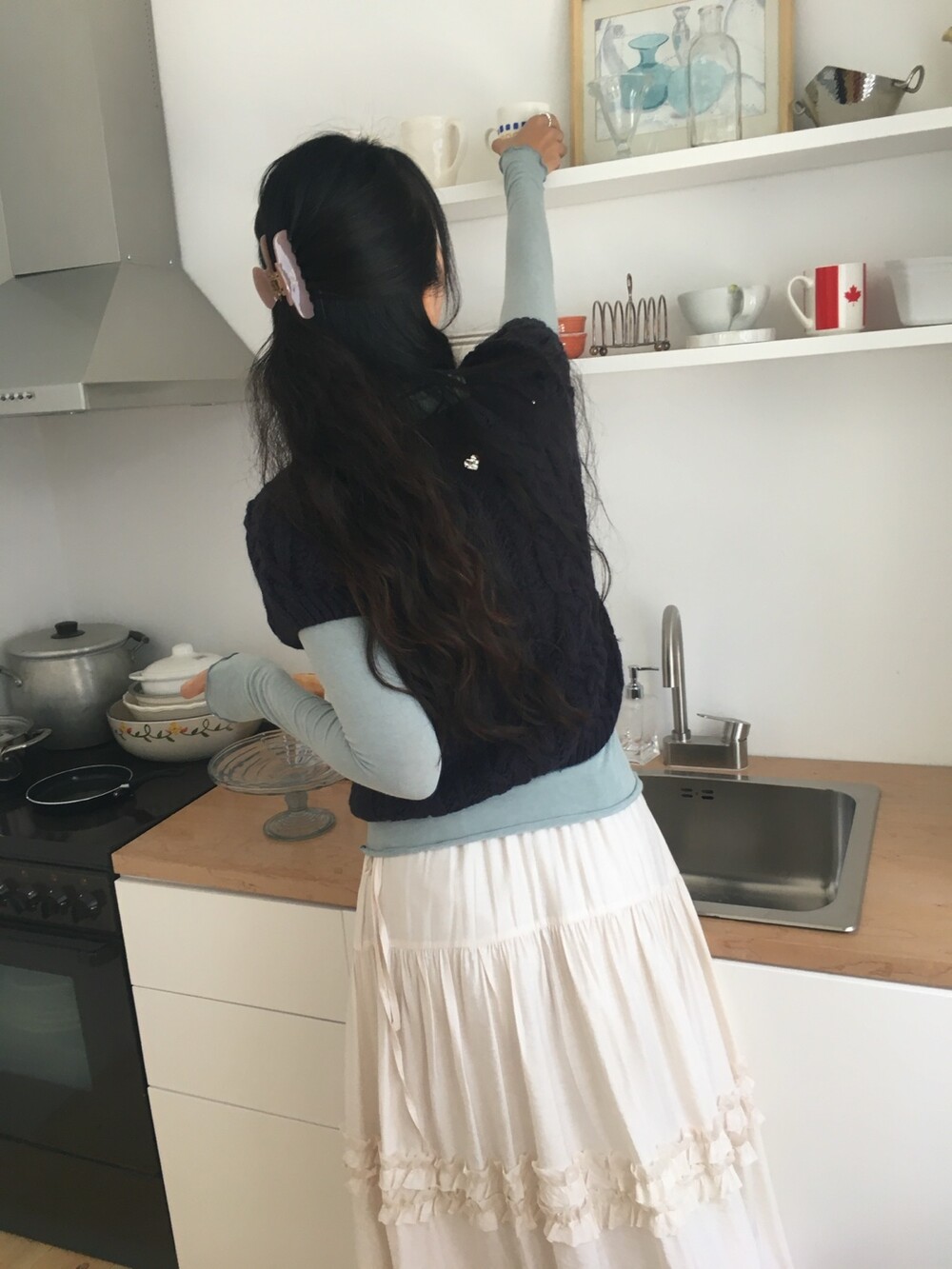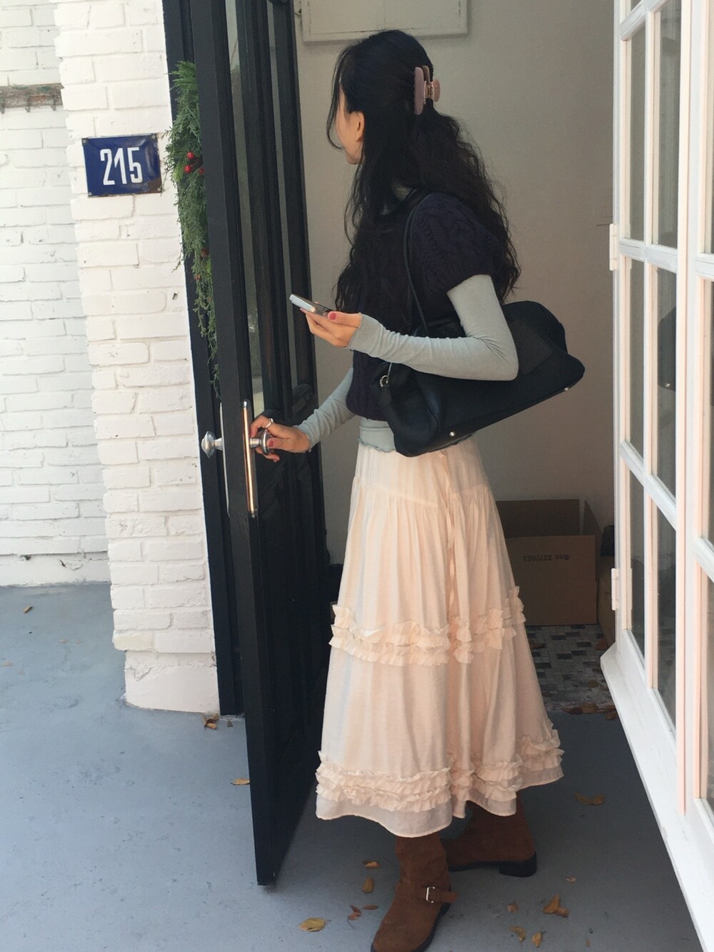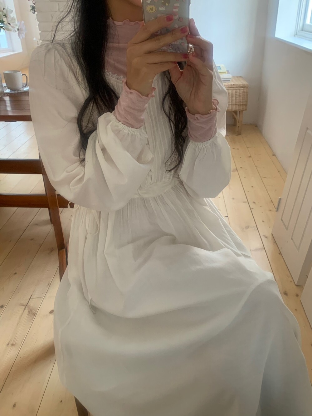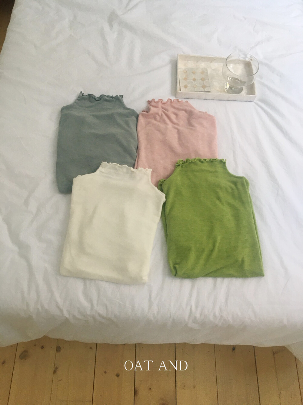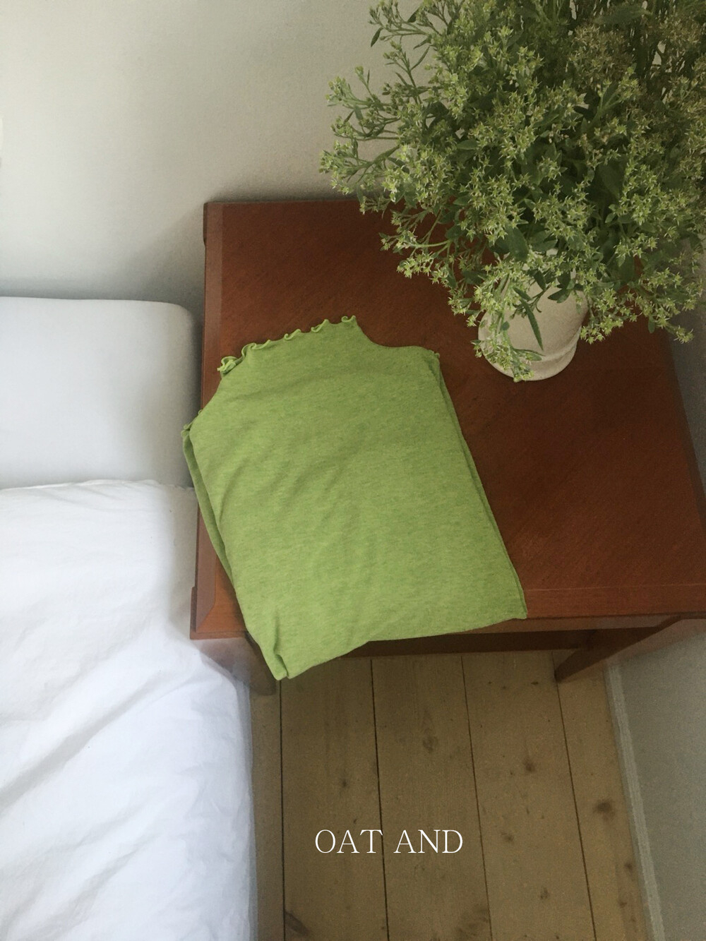 잔잔하게 퍼지는 프릴 물결 마감이 얼굴선을 더욱 부드럽게 살려주고, 편안한 신축성과 가벼운 착용감으로 하루 종일 부담 없이 입을 수 있는 데일리 탑이에요!