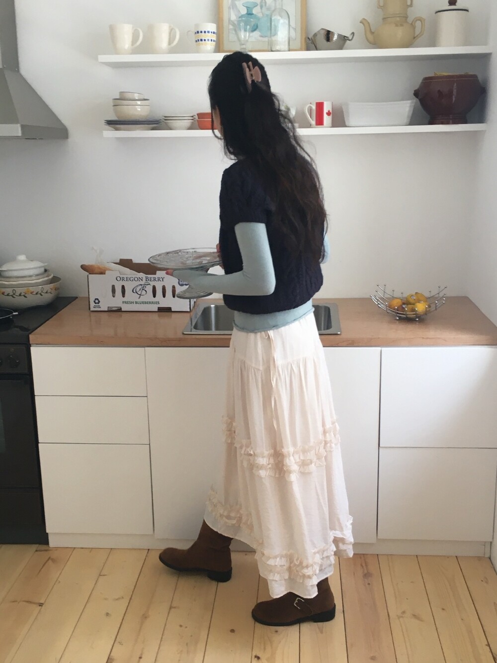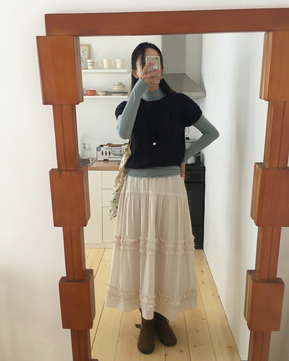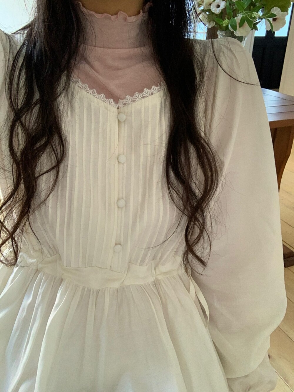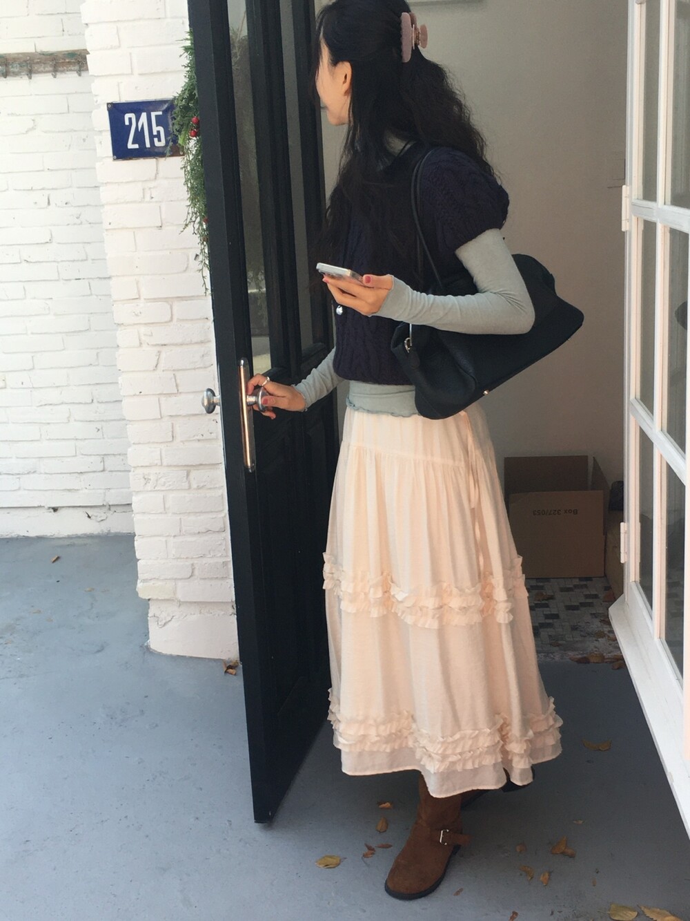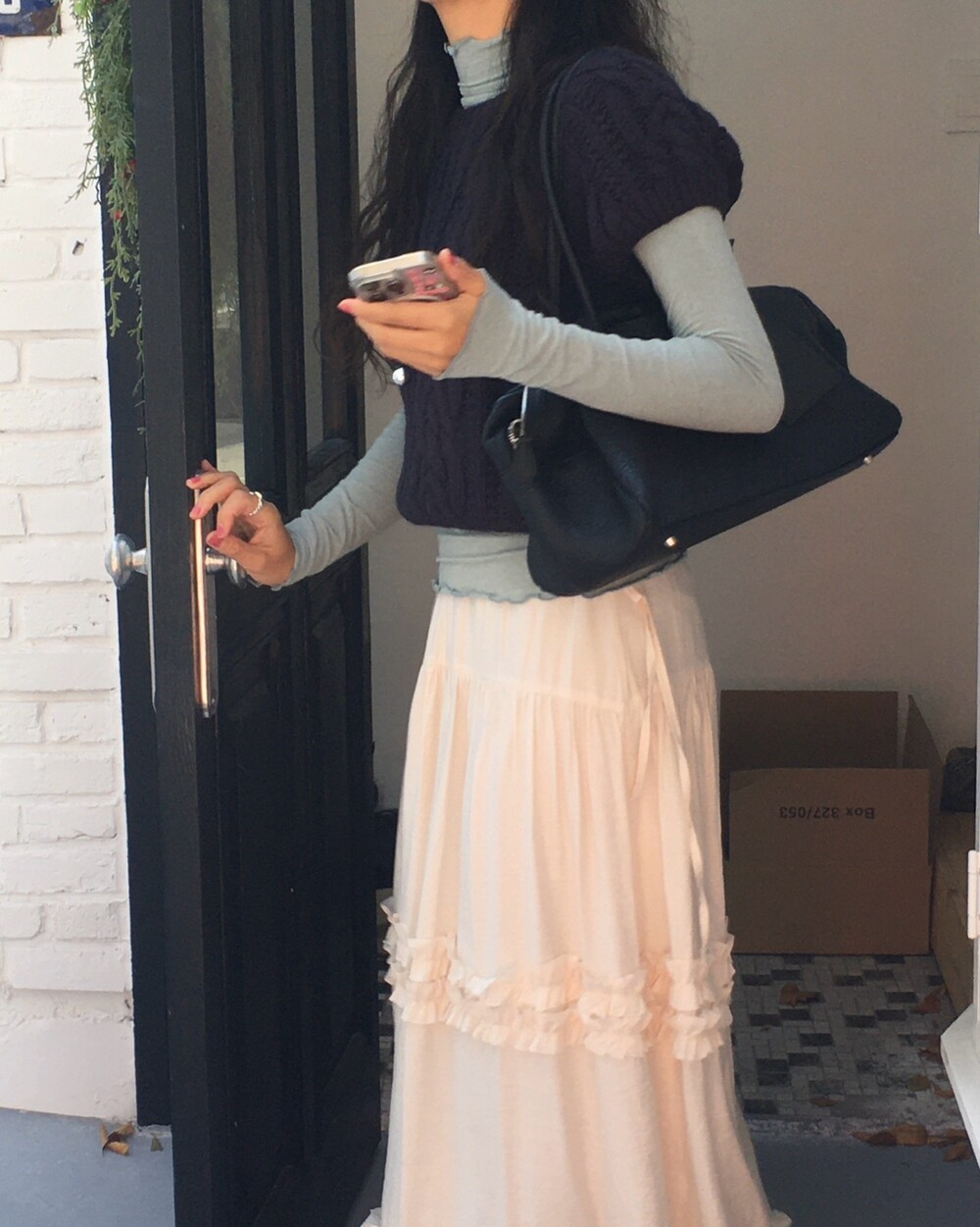 잔잔하게 퍼지는 프릴 물결 마감이 얼굴선을 더욱 부드럽게 살려주고, 편안한 신축성과 가벼운 착용감으로 하루 종일 부담 없이 입을 수 있는 데일리 탑이에요!