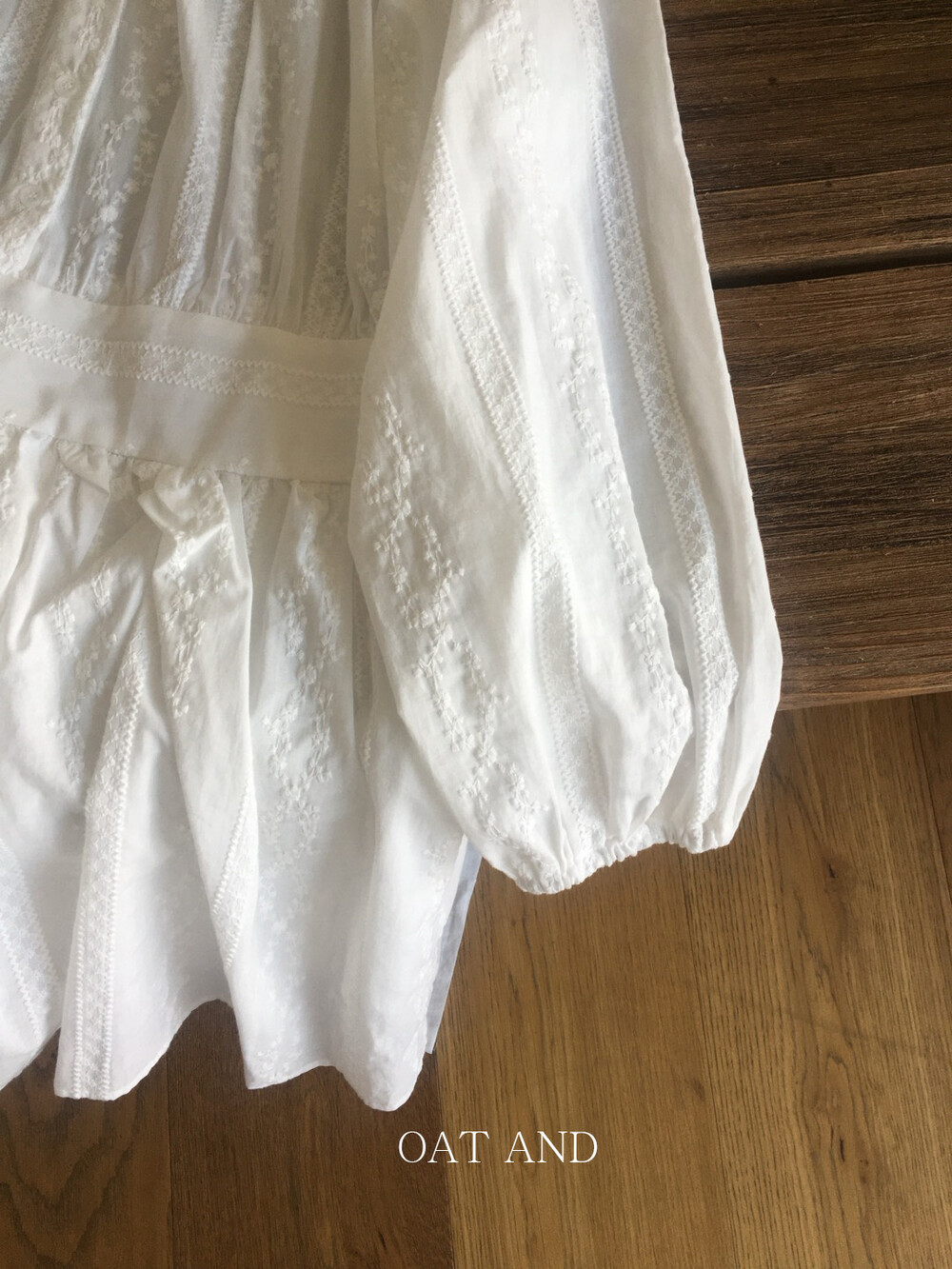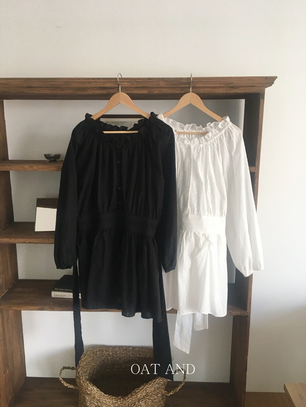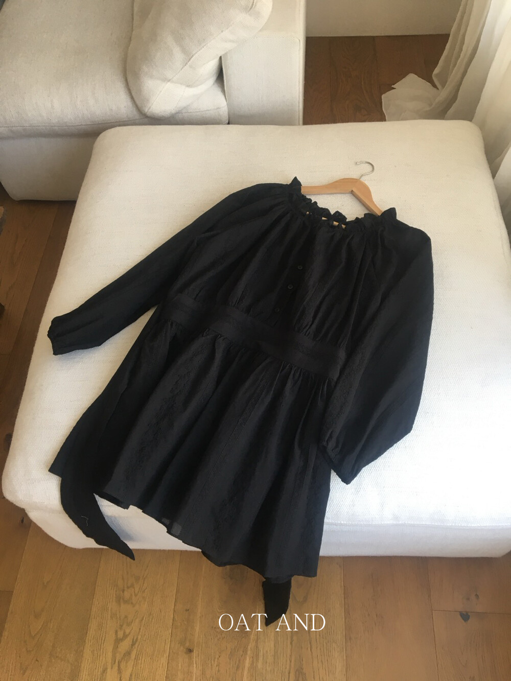 넥라인 셔링 디테일과 허리 절개 라인으로 자연스럽게 볼륨감 있는 실루엣을 연출해주며, 여성스럽고 여리한 분위기를 완성해줘요.