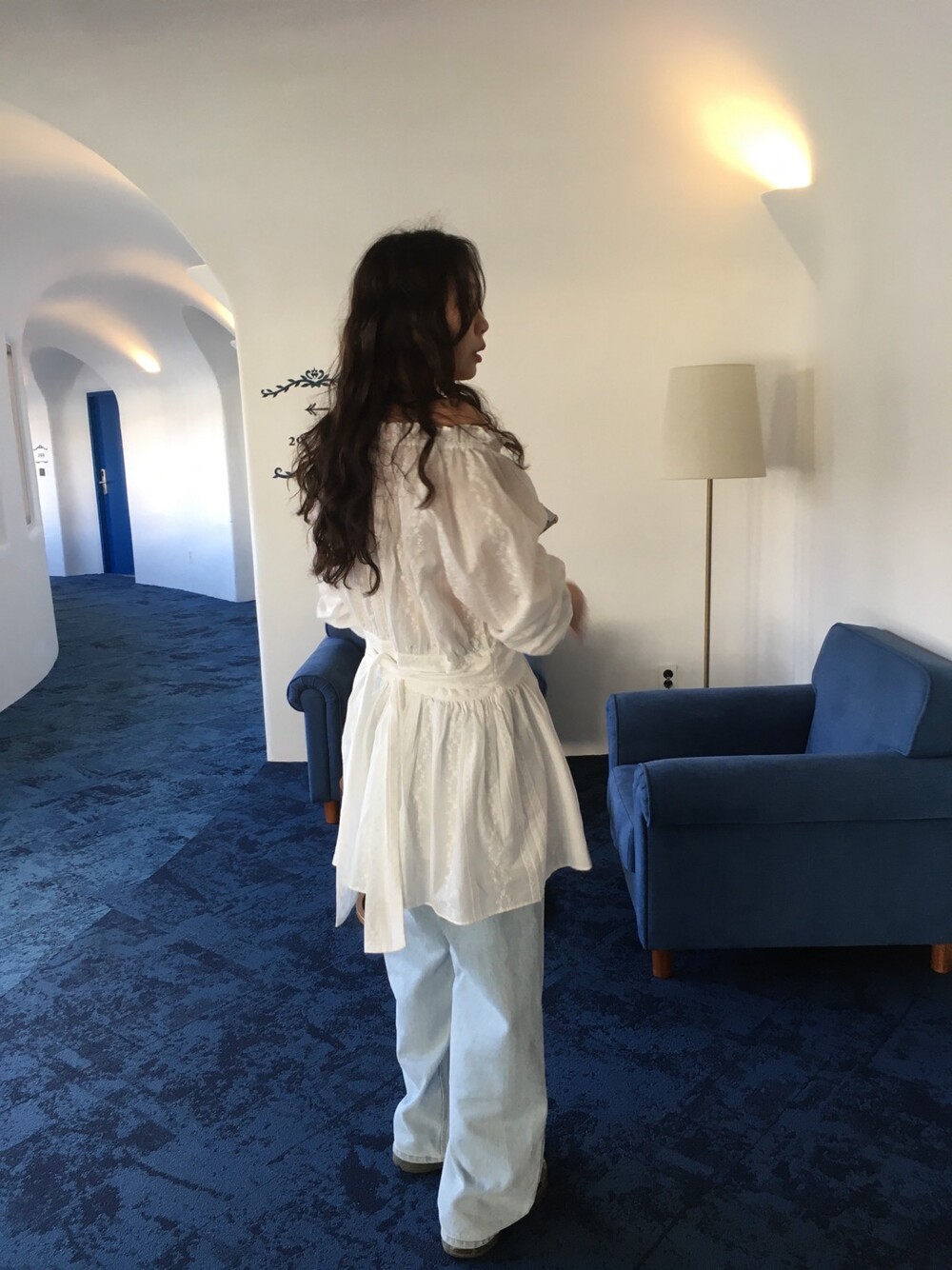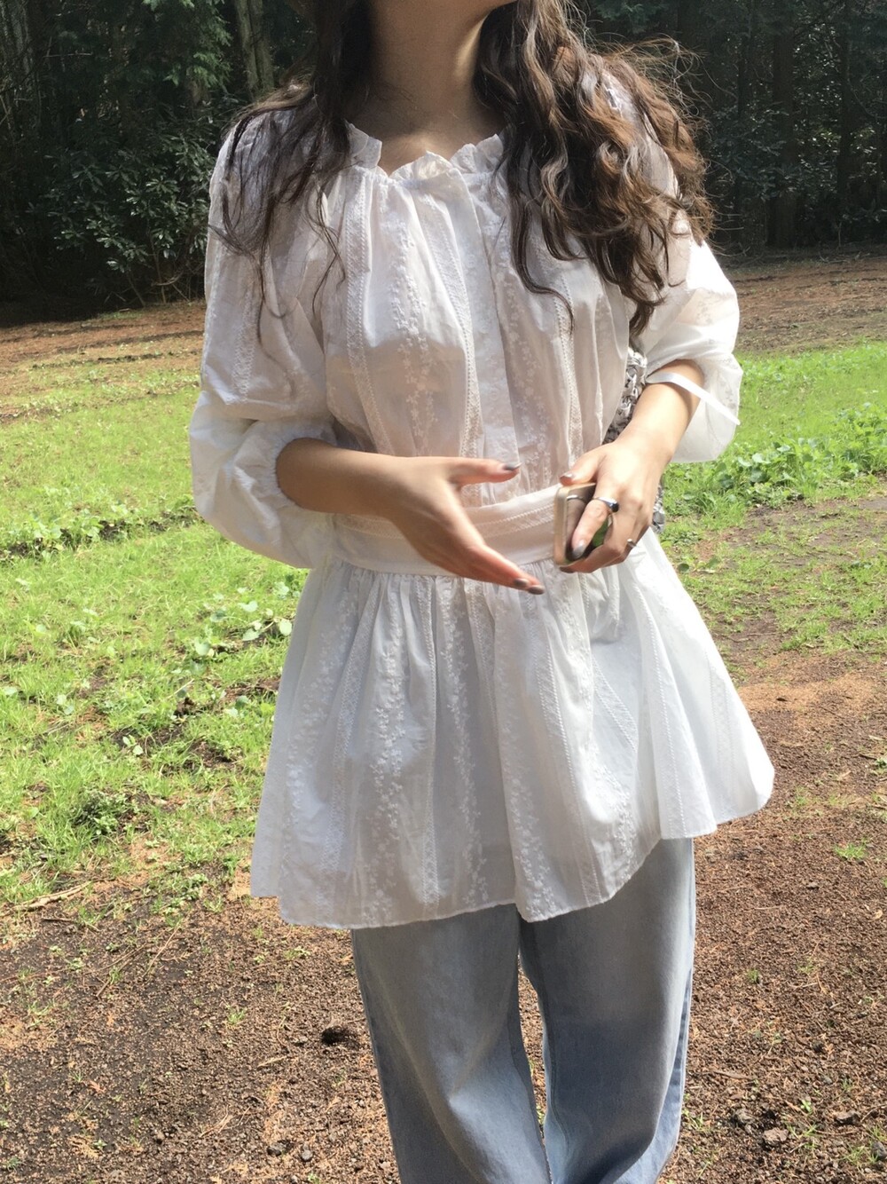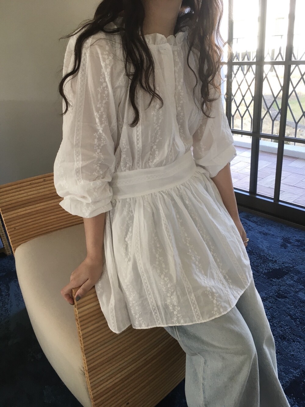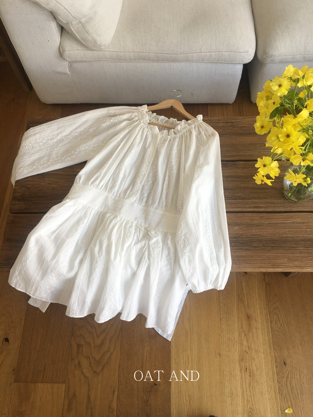 넥라인 셔링 디테일과 허리 절개 라인으로 자연스럽게 볼륨감 있는 실루엣을 연출해주며, 여성스럽고 여리한 분위기를 완성해줘요.