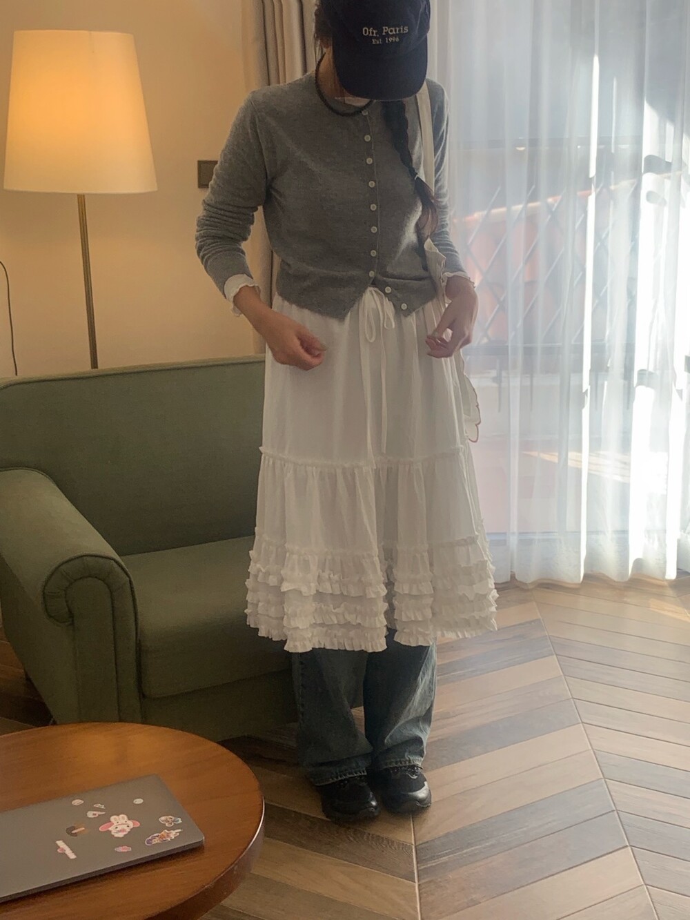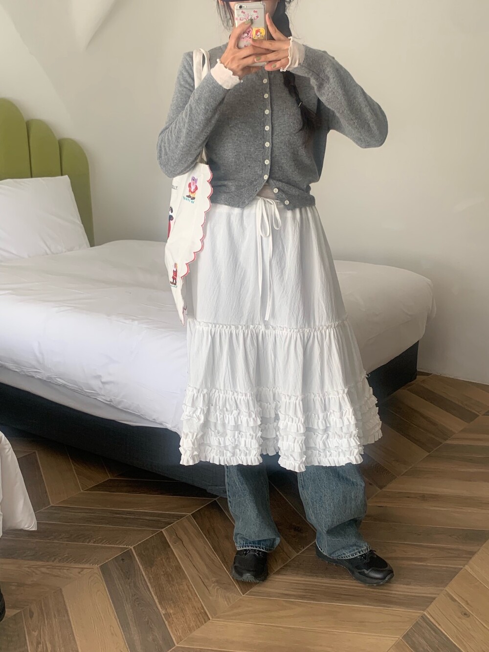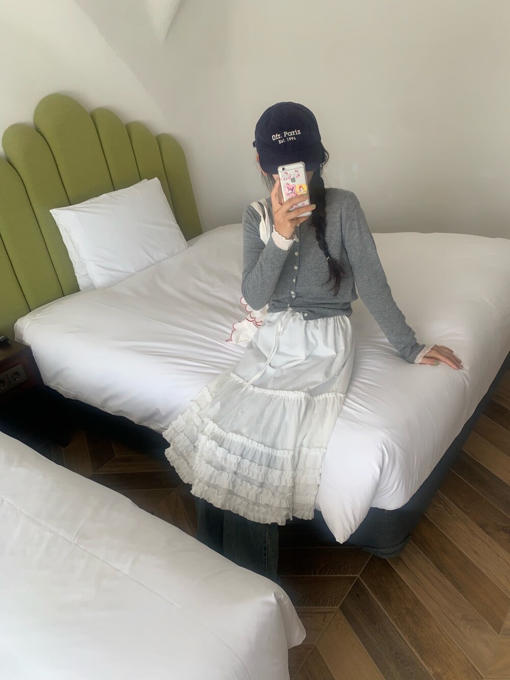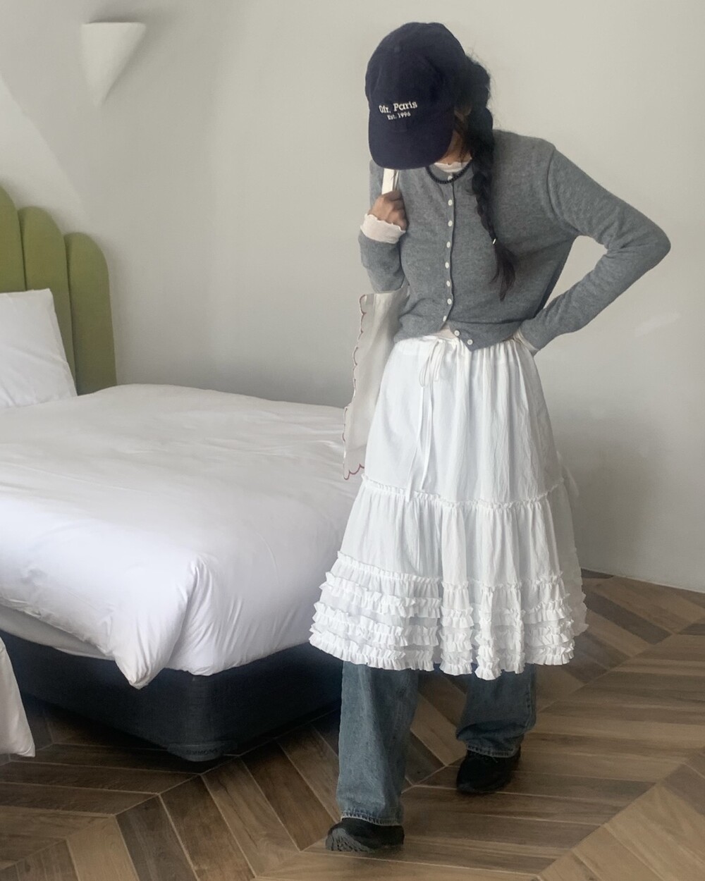 중간 절개에 쁘띠 프릴 한번, 밑단에 프릴 세단이 들어가서 로맨틱한 무드가 느껴집니다.