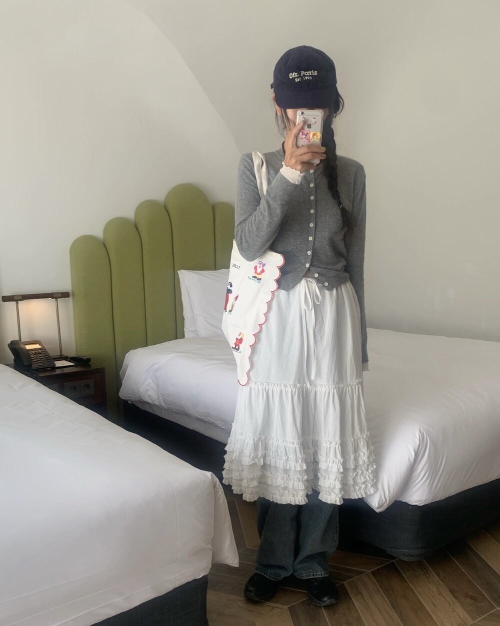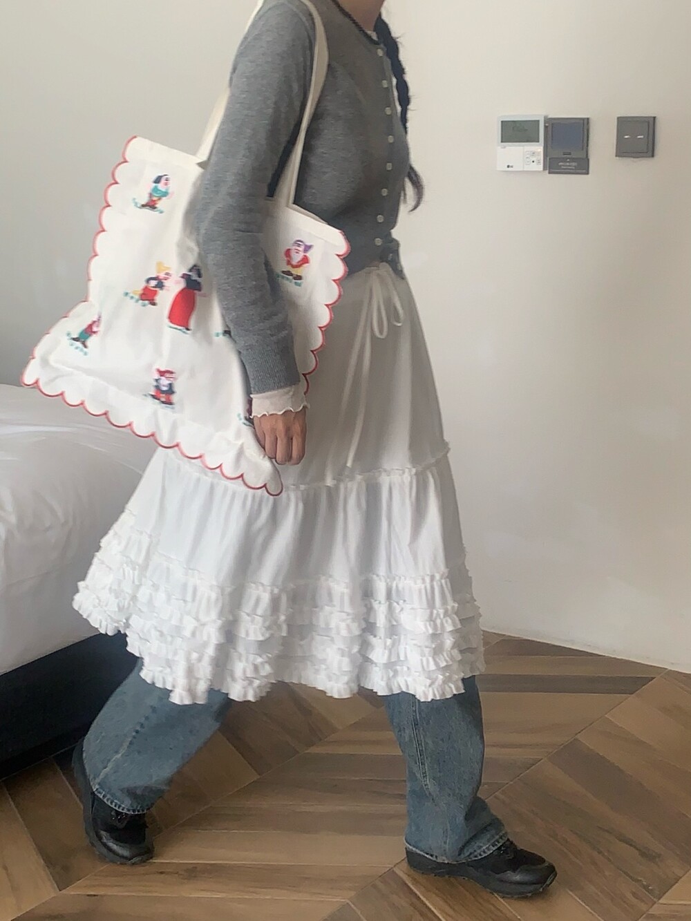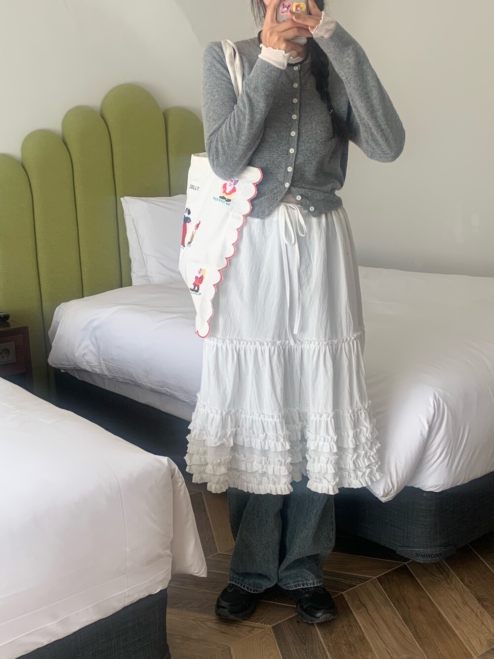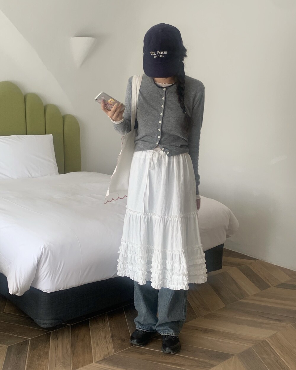 중간 절개에 쁘띠 프릴 한번, 밑단에 프릴 세단이 들어가서 로맨틱한 무드가 느껴집니다.