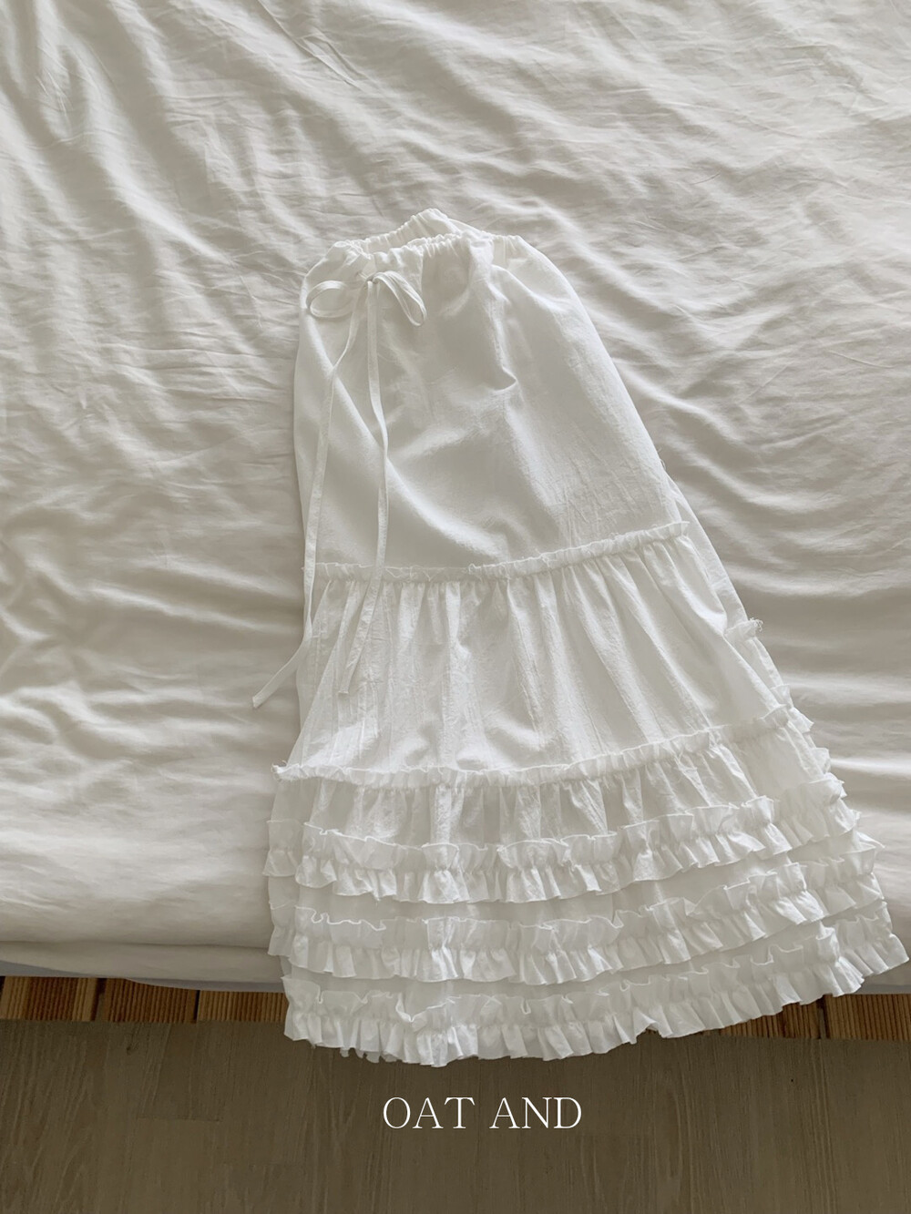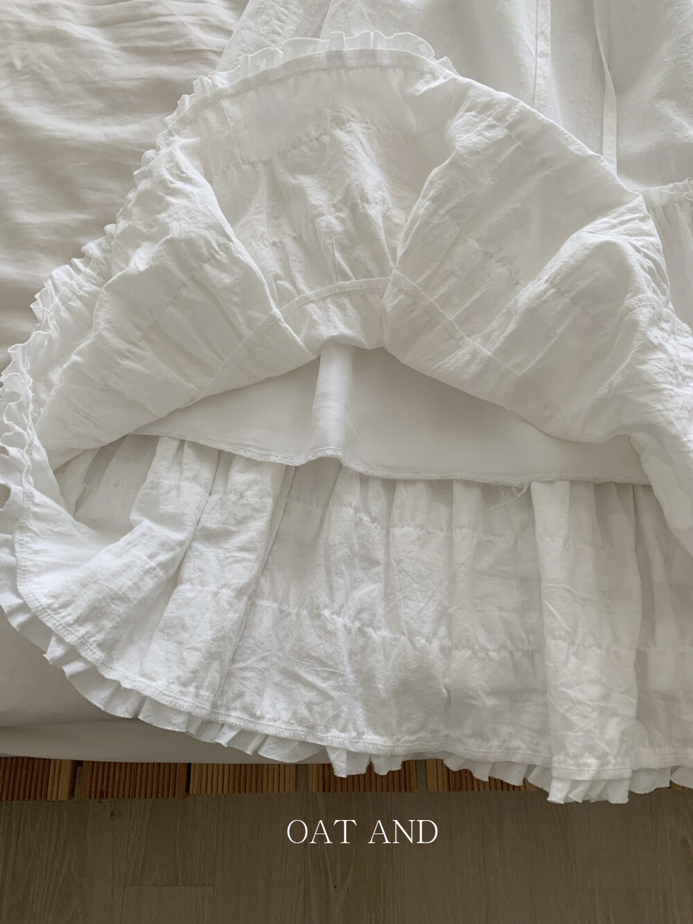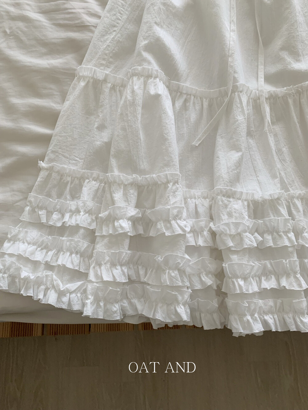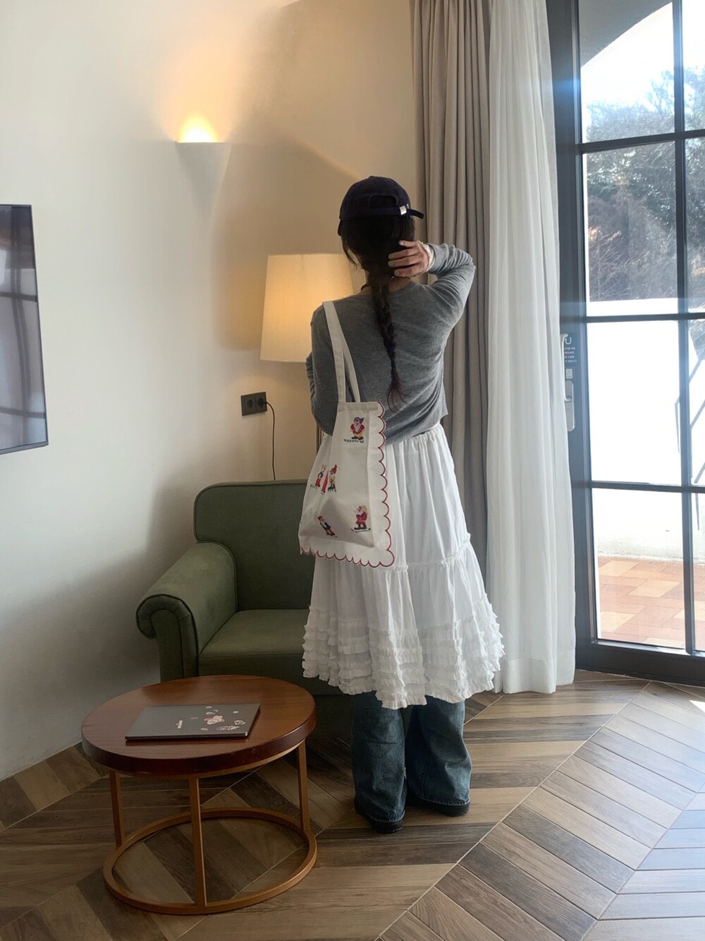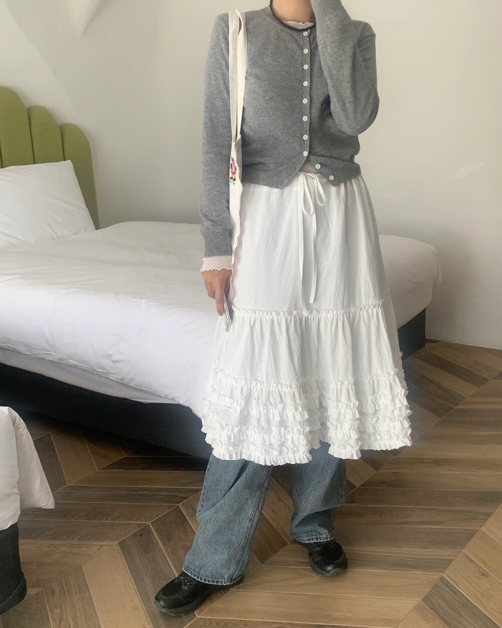 중간 절개에 쁘띠 프릴 한번, 밑단에 프릴 세단이 들어가서 로맨틱한 무드가 느껴집니다.