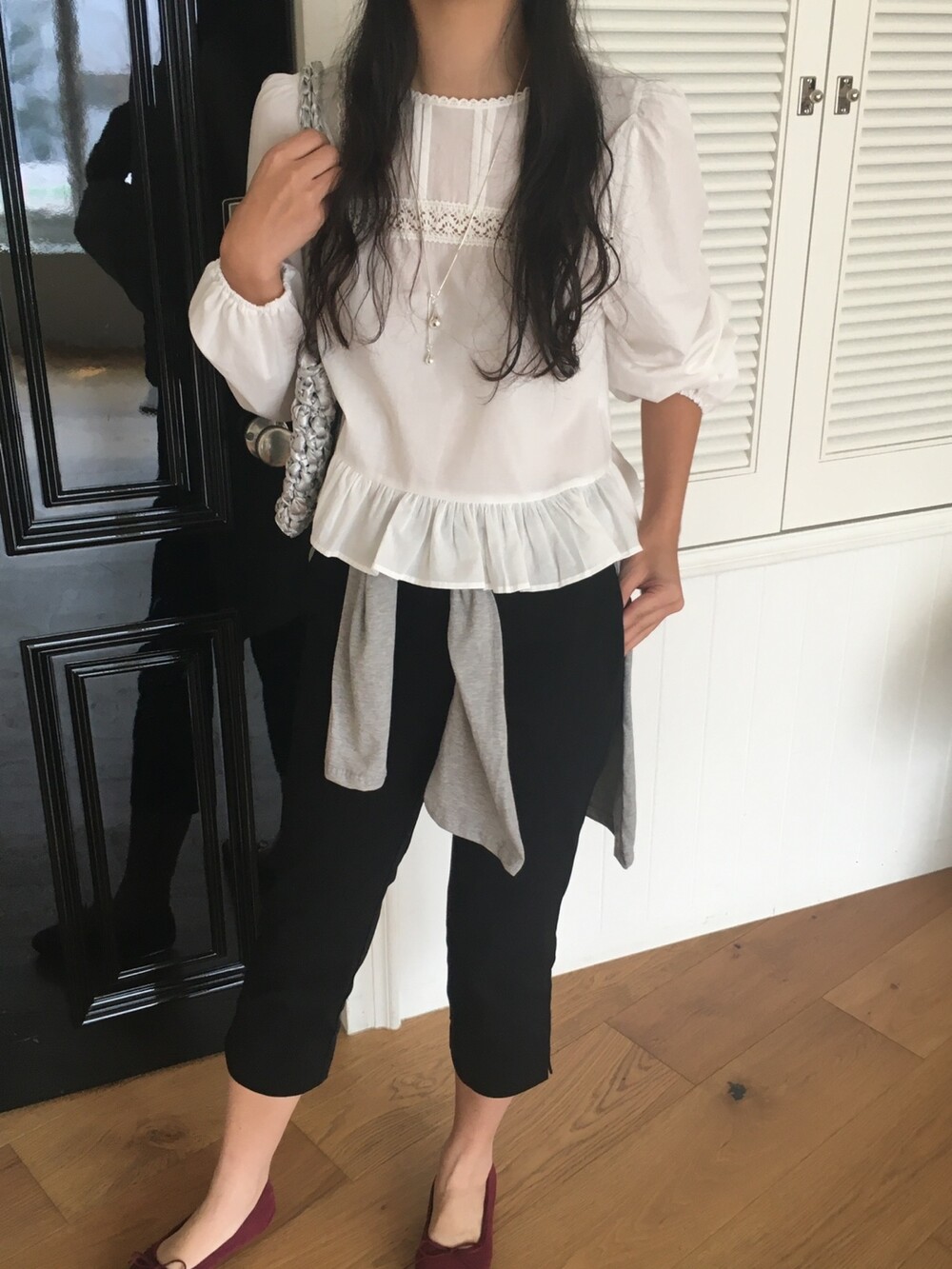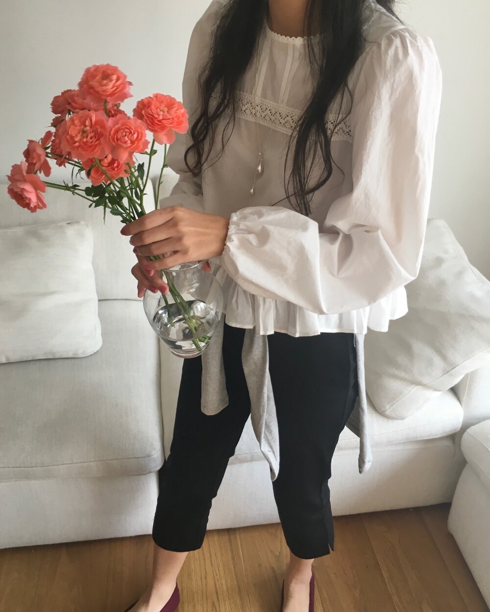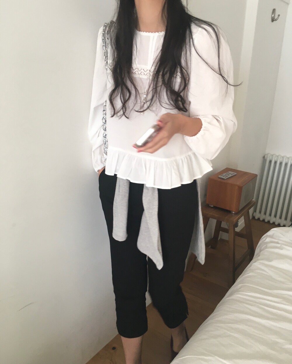 특히 밑단의 프릴 디테일은 스커트나 데님 팬츠 위에 꺼내 입었을 때 가장 예쁜 실루엣을 보여준답니다.
