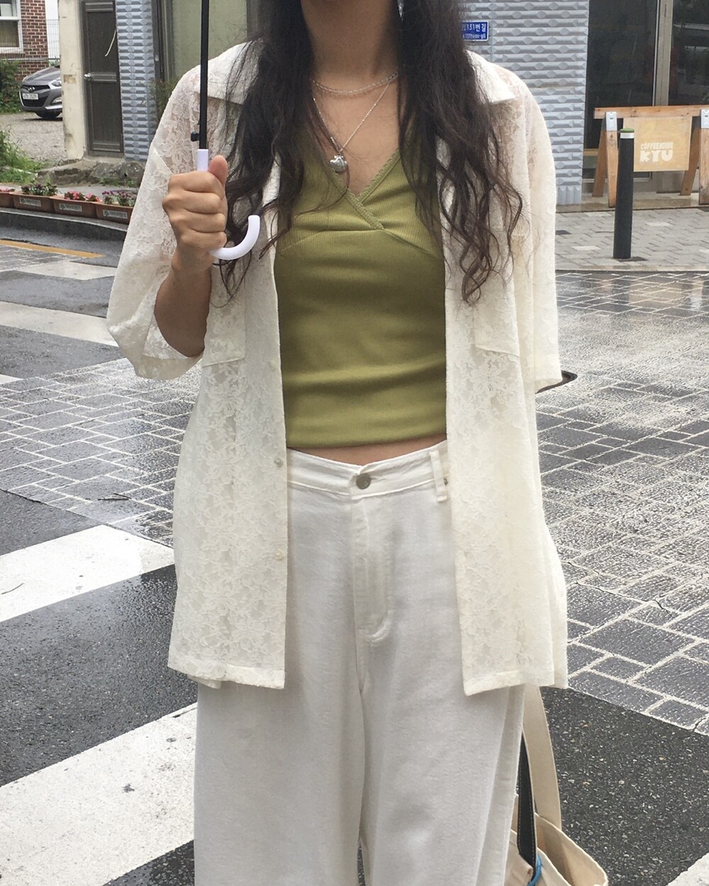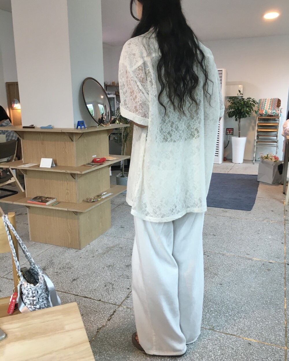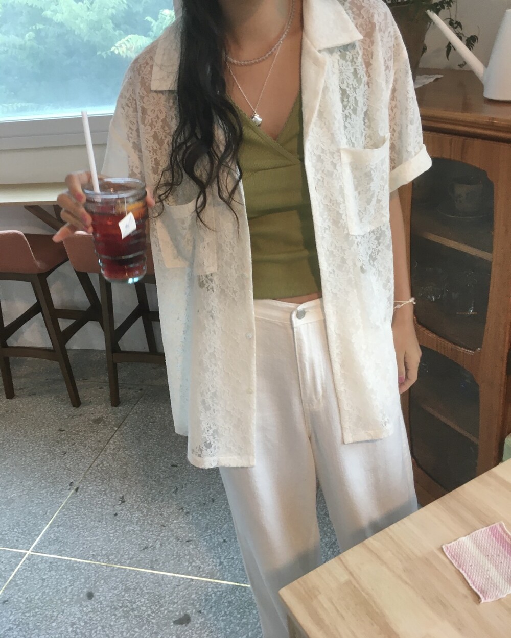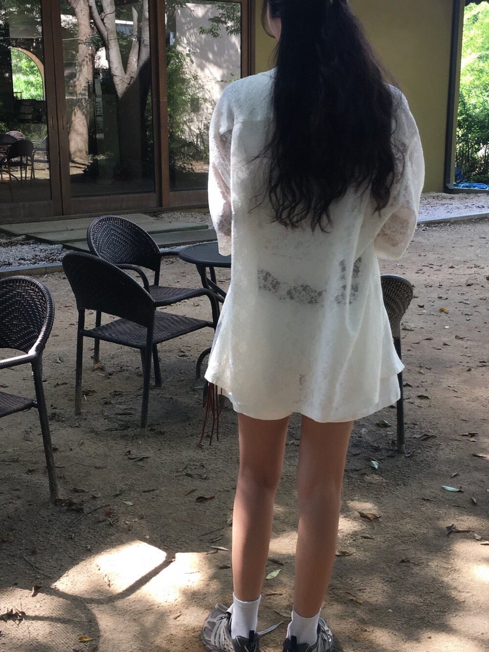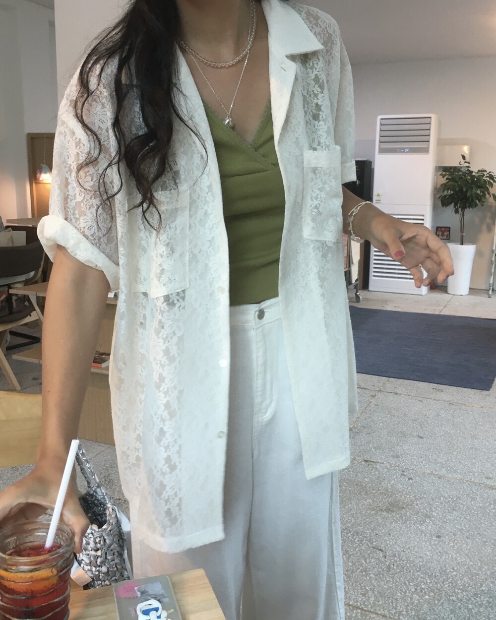 전체적으로 꽃무늬 패턴이 섬세하게 들어간 시스루 스타일의 레이스 원단으로, 통기성이 좋고 가볍습니다. 레이스 특성상 약간의 비침이 있으며, 이너 착용이 필요할 수 있습니다. 단독으로 착용한 피팅컷도 있으니, 참고해주세요!