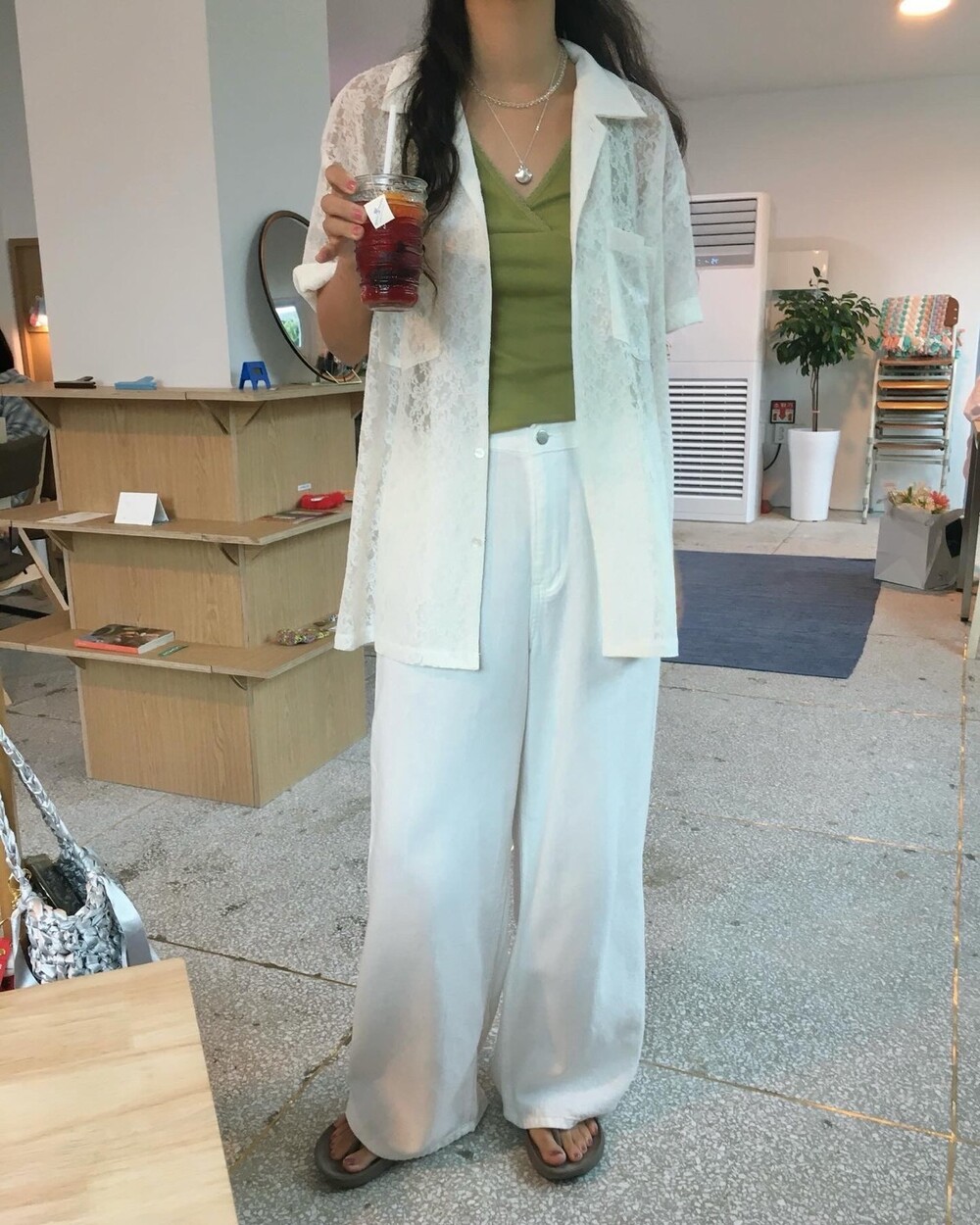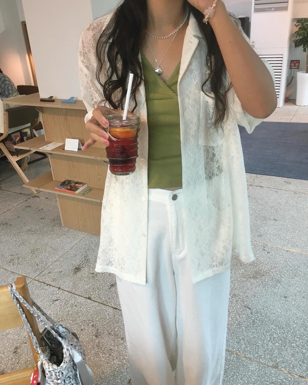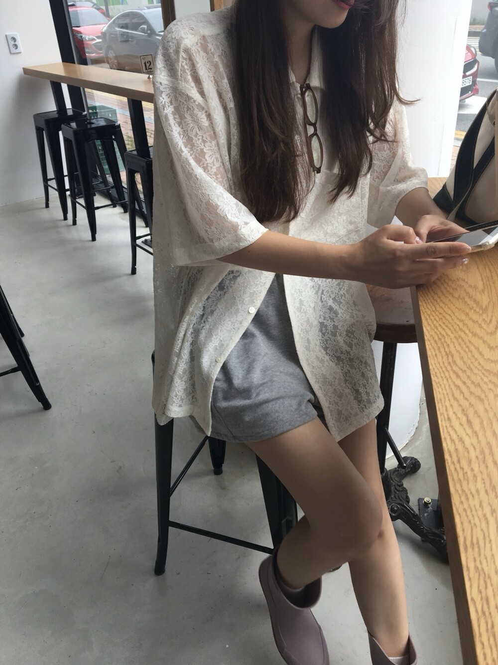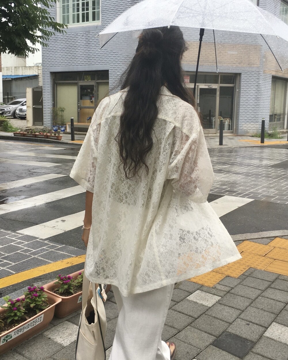 전체적으로 꽃무늬 패턴이 섬세하게 들어간 시스루 스타일의 레이스 원단으로, 통기성이 좋고 가볍습니다. 레이스 특성상 약간의 비침이 있으며, 이너 착용이 필요할 수 있습니다. 단독으로 착용한 피팅컷도 있으니, 참고해주세요!