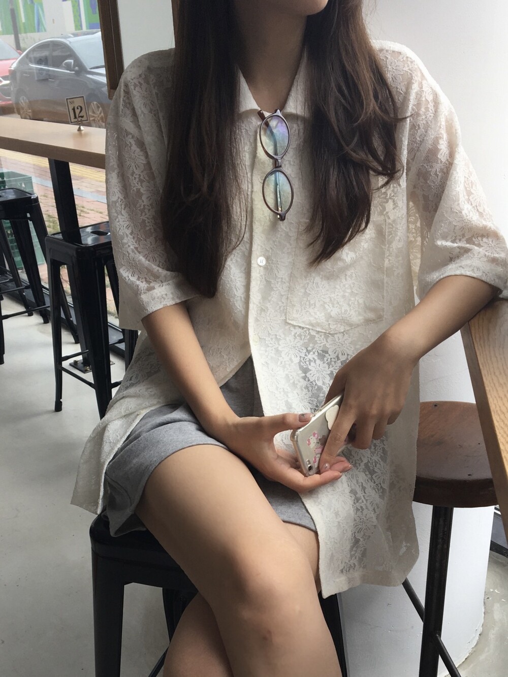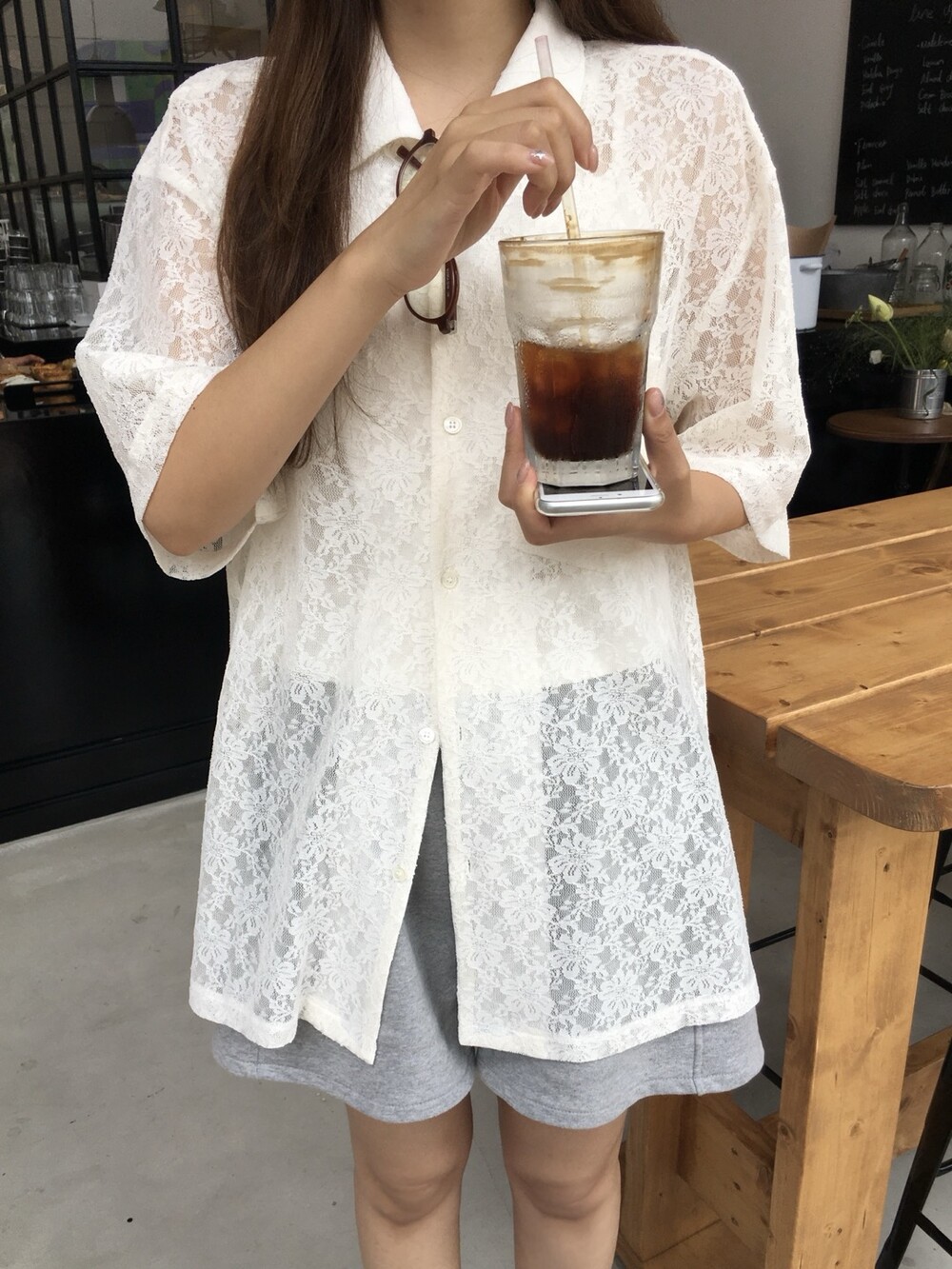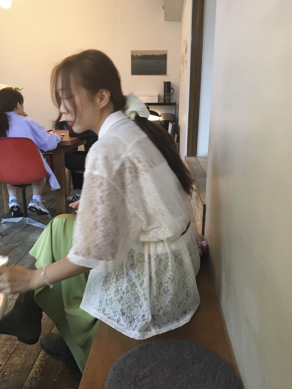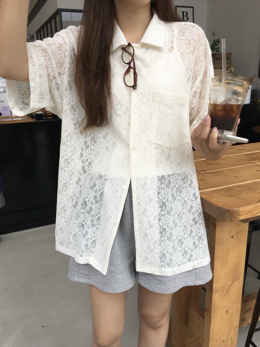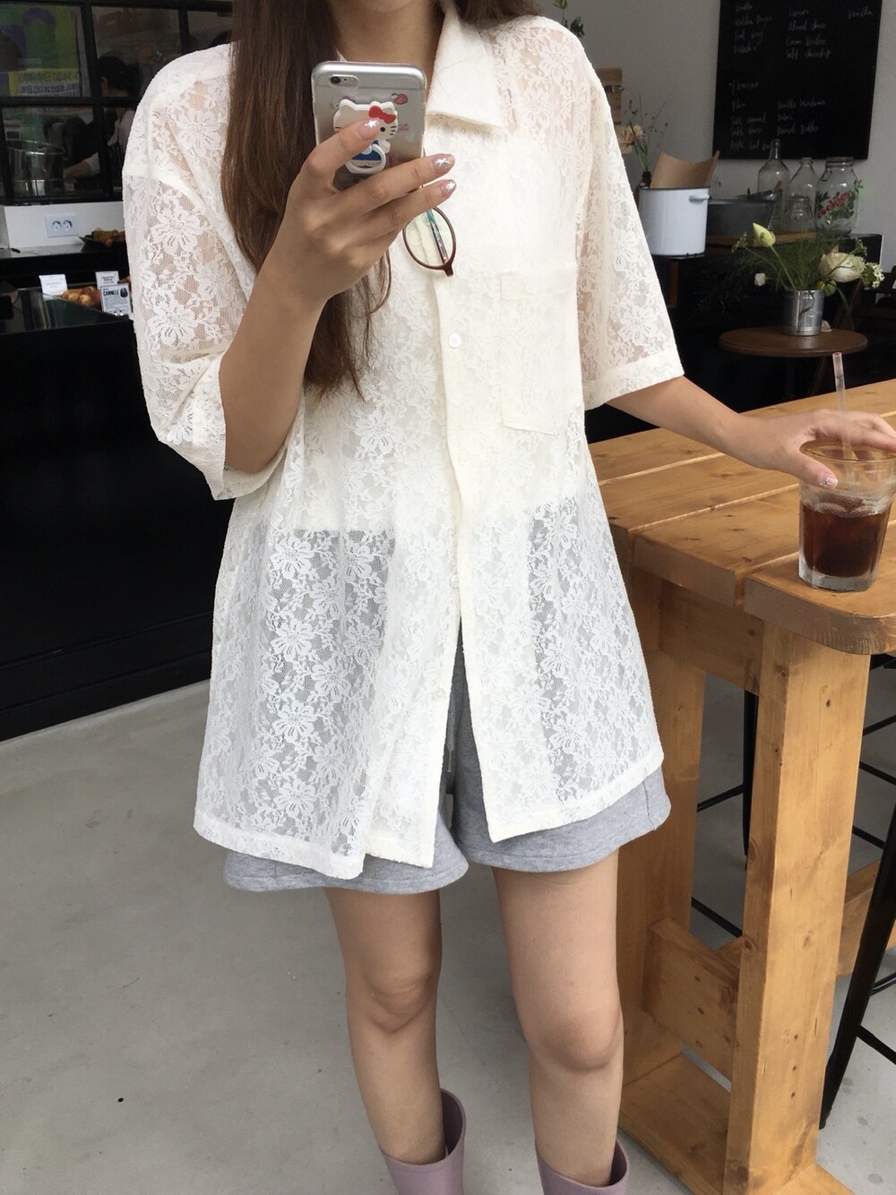 전체적으로 꽃무늬 패턴이 섬세하게 들어간 시스루 스타일의 레이스 원단으로, 통기성이 좋고 가볍습니다. 레이스 특성상 약간의 비침이 있으며, 이너 착용이 필요할 수 있습니다. 단독으로 착용한 피팅컷도 있으니, 참고해주세요!