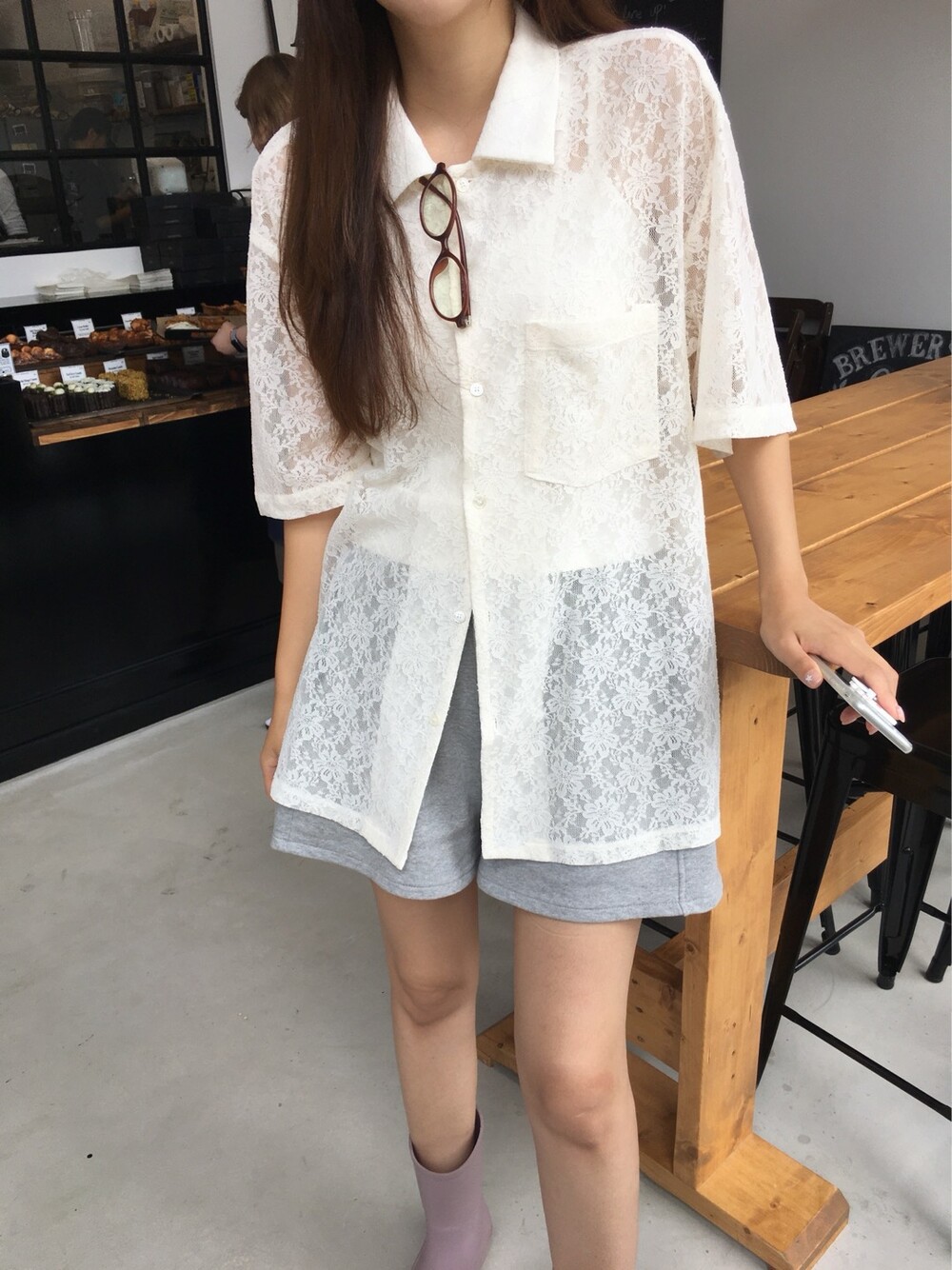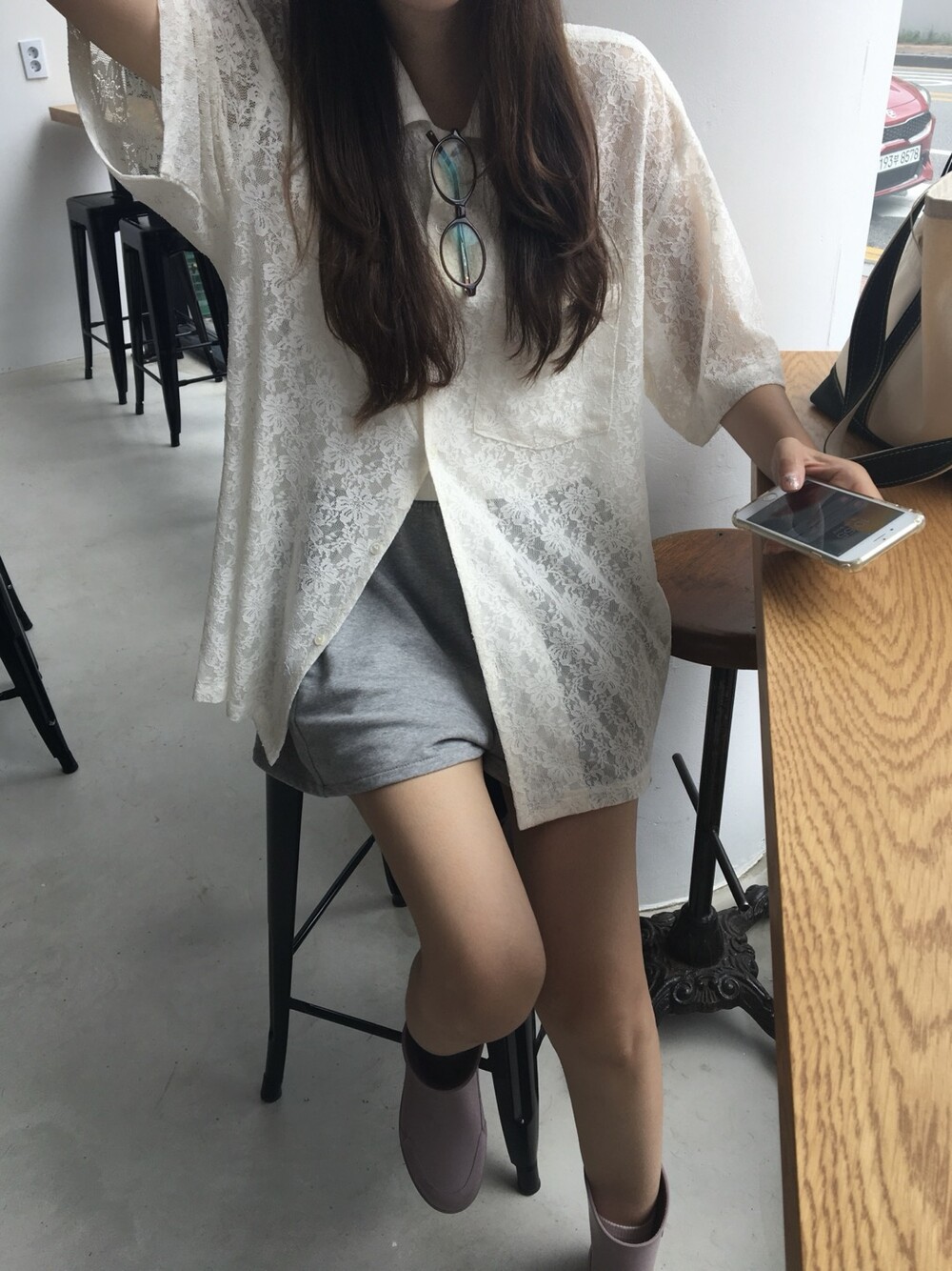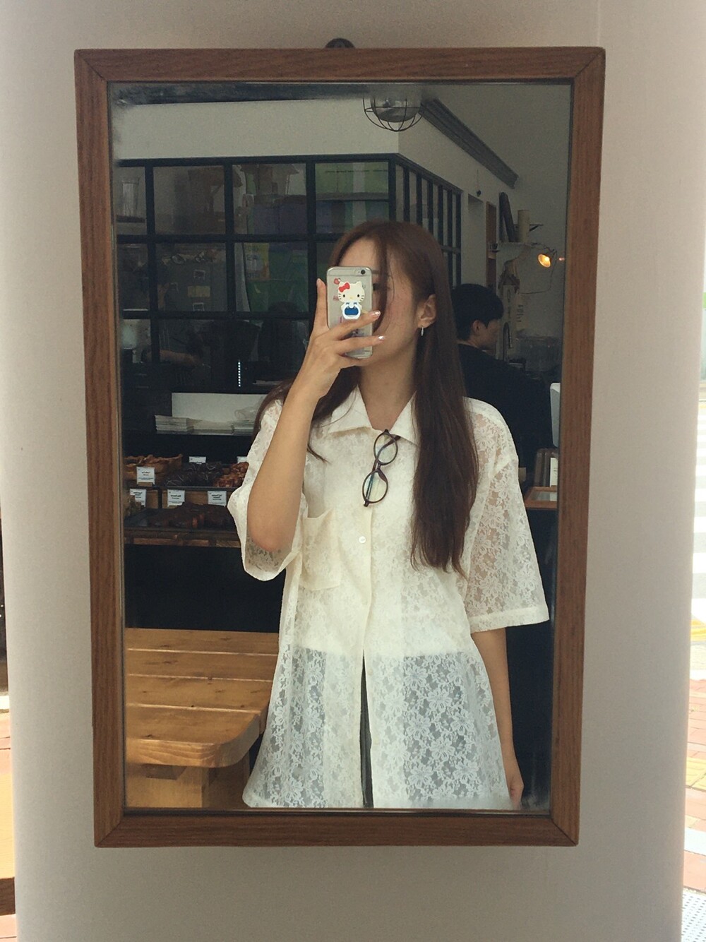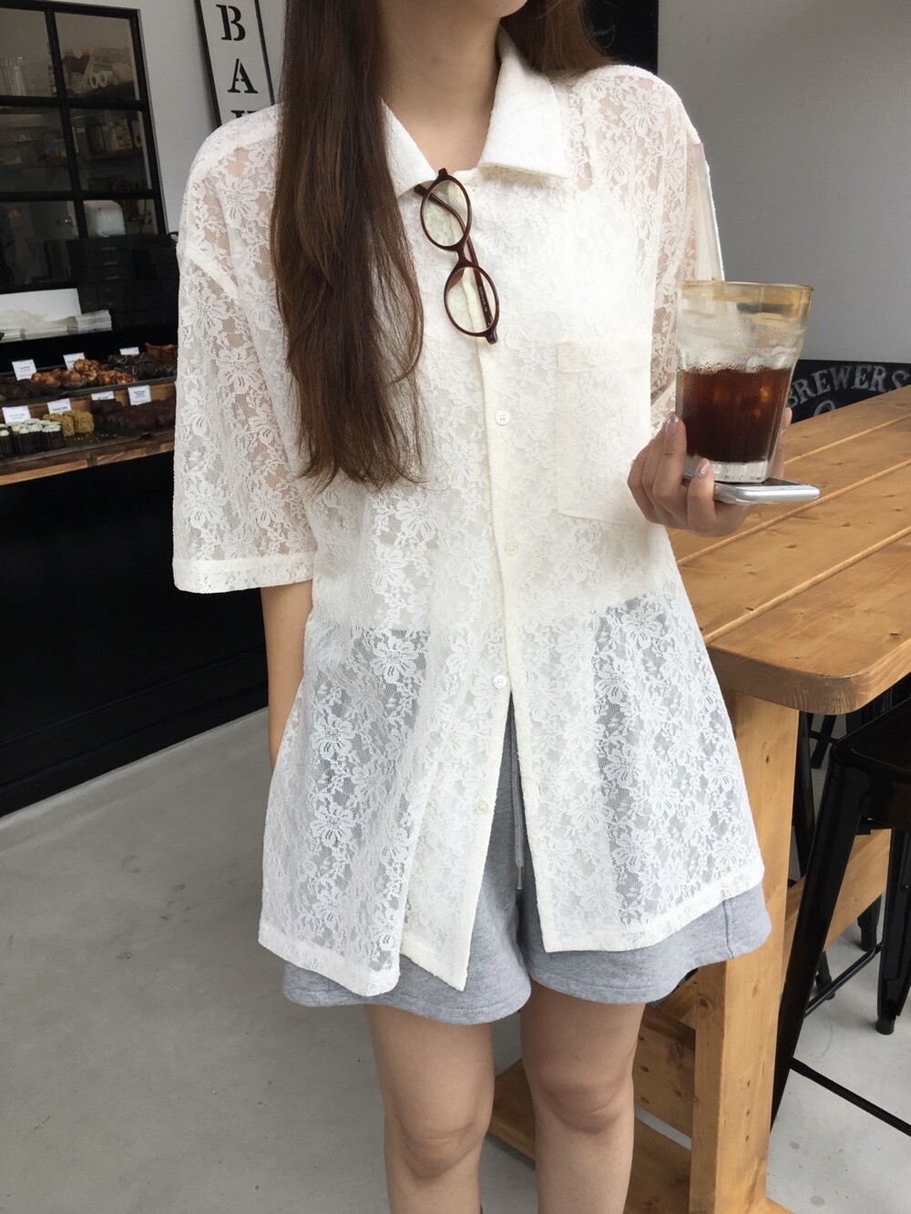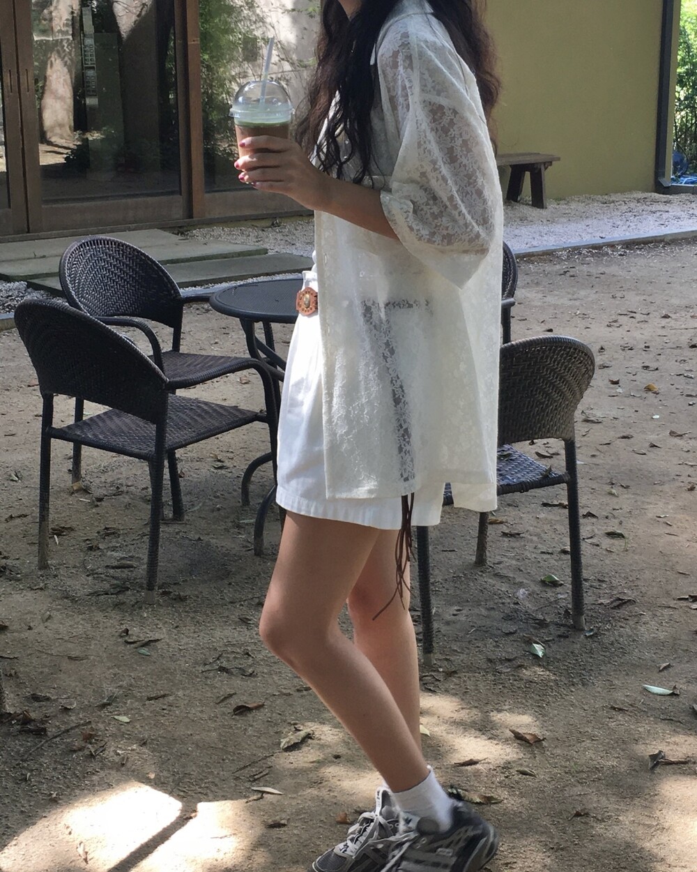 전체적으로 꽃무늬 패턴이 섬세하게 들어간 시스루 스타일의 레이스 원단으로, 통기성이 좋고 가볍습니다. 레이스 특성상 약간의 비침이 있으며, 이너 착용이 필요할 수 있습니다. 단독으로 착용한 피팅컷도 있으니, 참고해주세요!