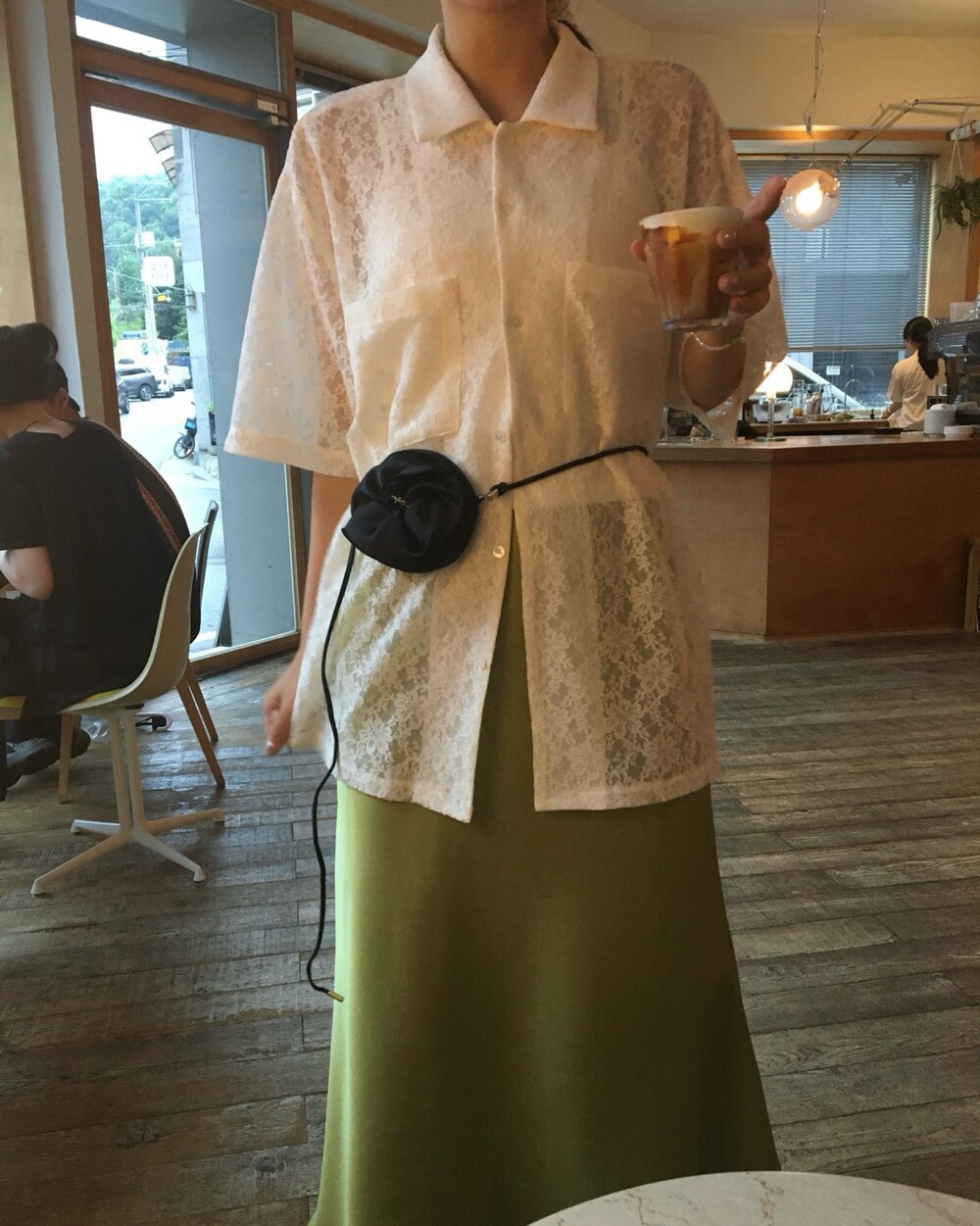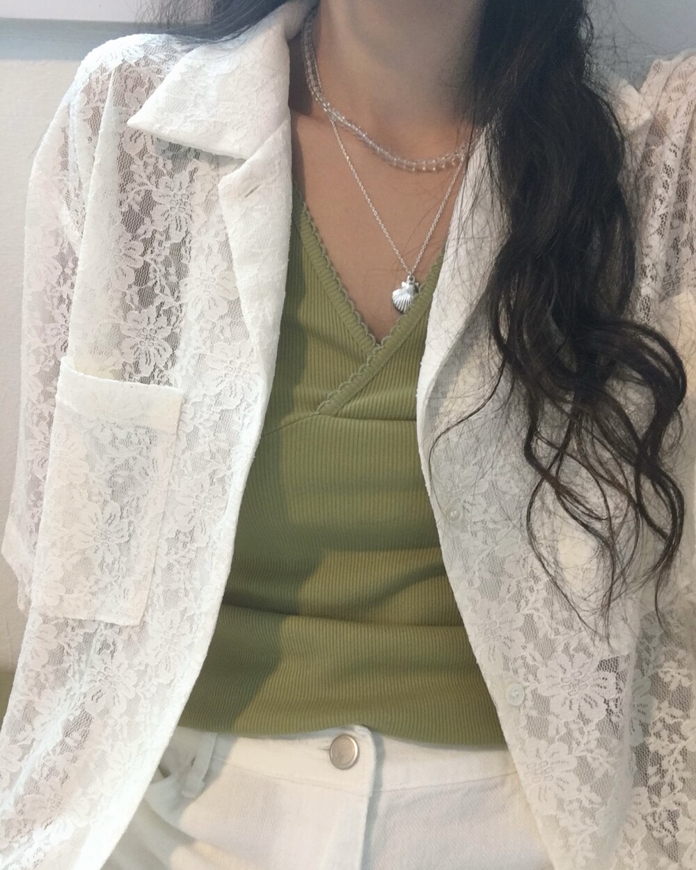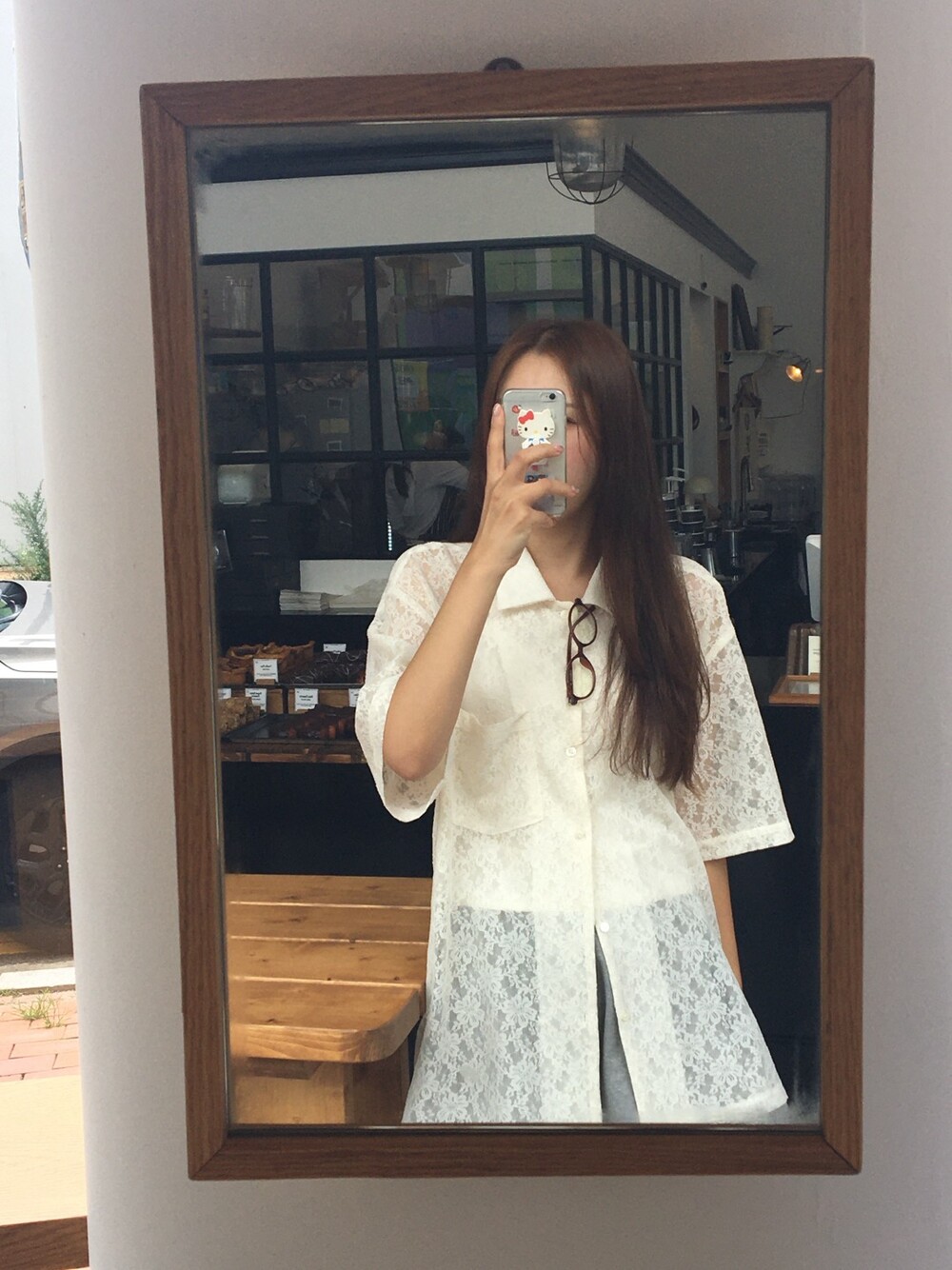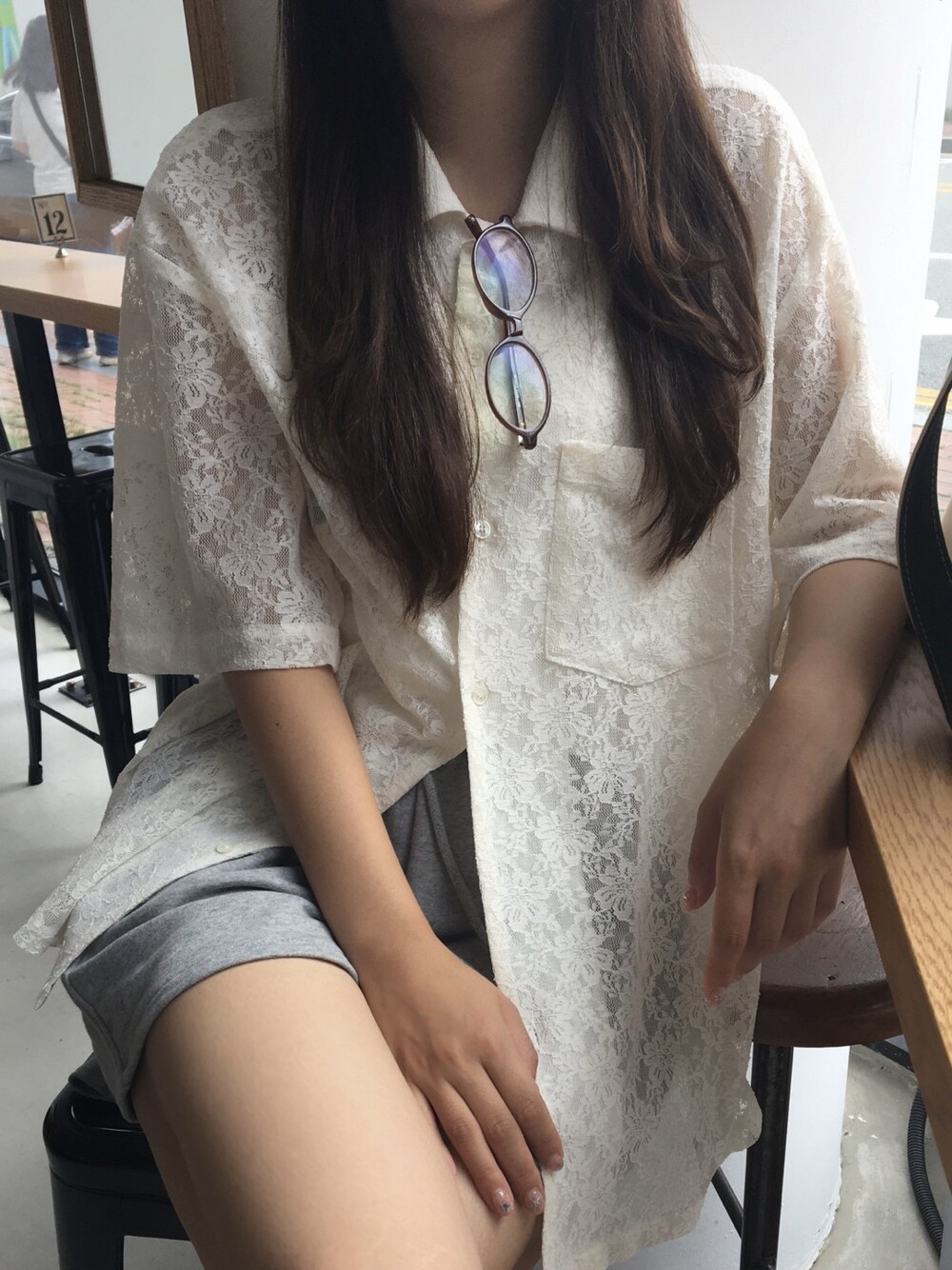 전체적으로 꽃무늬 패턴이 섬세하게 들어간 시스루 스타일의 레이스 원단으로, 통기성이 좋고 가볍습니다. 레이스 특성상 약간의 비침이 있으며, 이너 착용이 필요할 수 있습니다. 단독으로 착용한 피팅컷도 있으니, 참고해주세요!