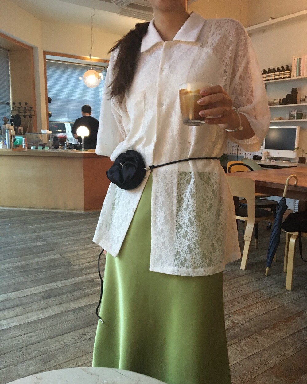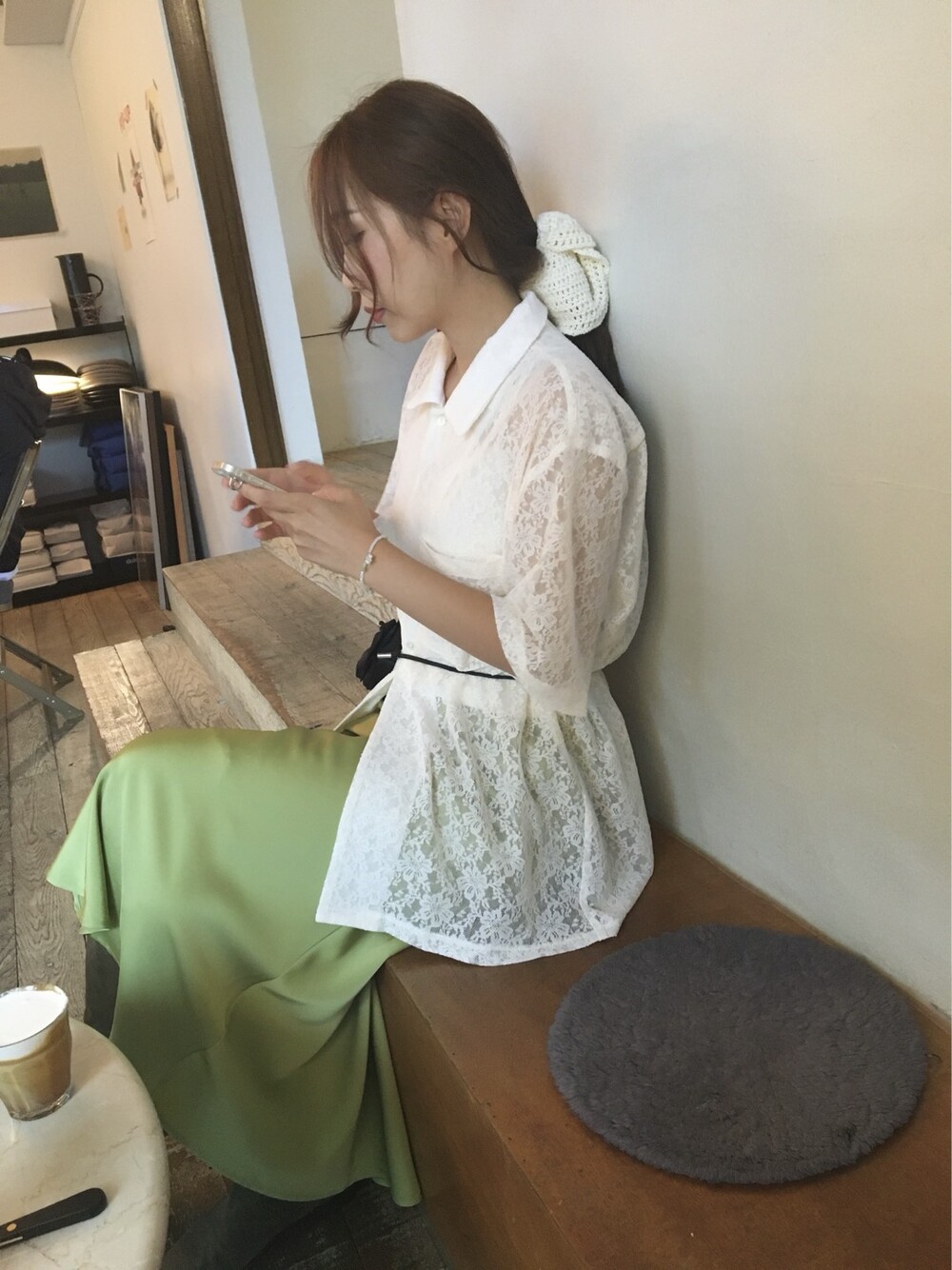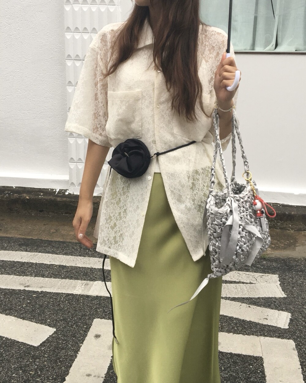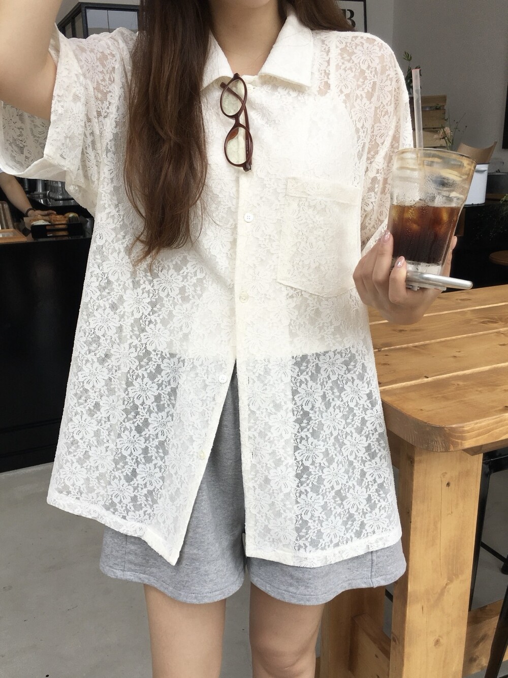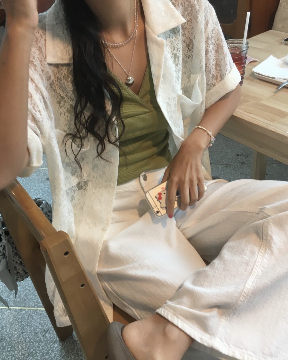 전체적으로 꽃무늬 패턴이 섬세하게 들어간 시스루 스타일의 레이스 원단으로, 통기성이 좋고 가볍습니다. 레이스 특성상 약간의 비침이 있으며, 이너 착용이 필요할 수 있습니다. 단독으로 착용한 피팅컷도 있으니, 참고해주세요!
