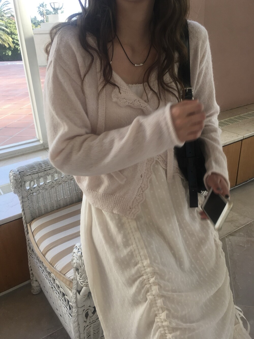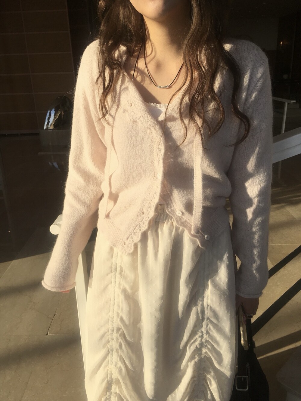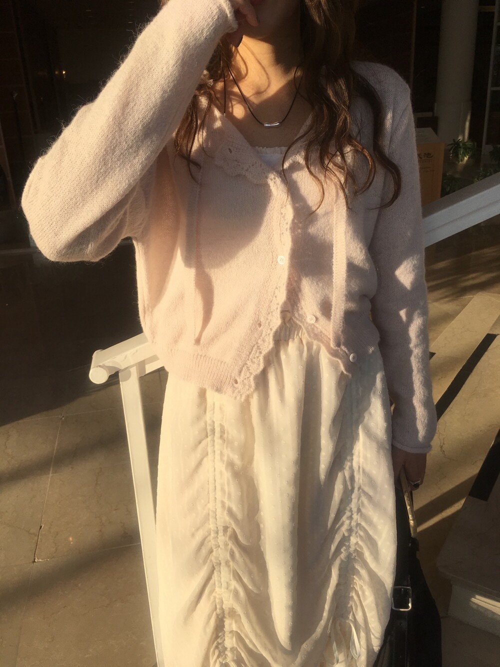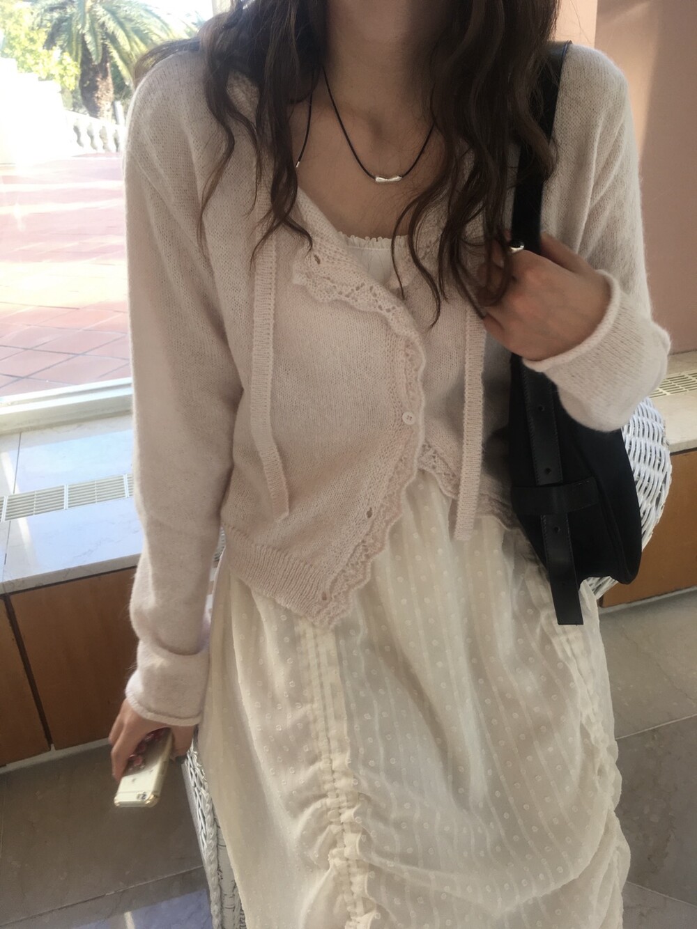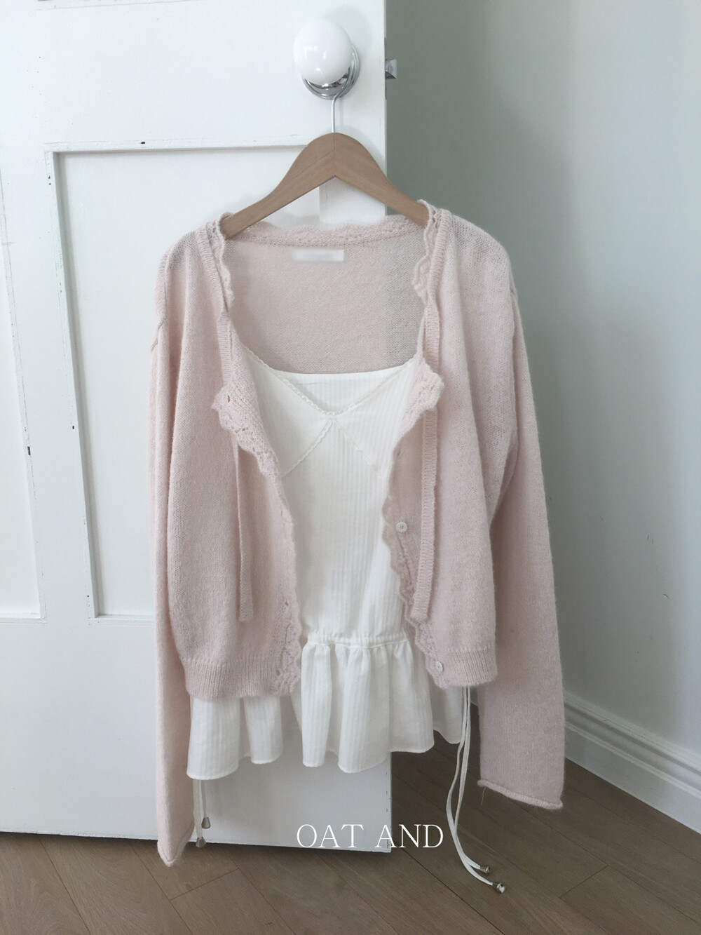 넥라인과 버튼라인을 따라 정교하게 들어간 물결모양으로 사랑스러운 연출이 가능하고, 어깨라인부터 길게 내려오는 동일 소재의 스트랩 디테일 있어, 리본으로 묶어 연출하거나 자연스럽게 늘어뜨려 유니크한 실루엣을 완성할 수 있습니다.