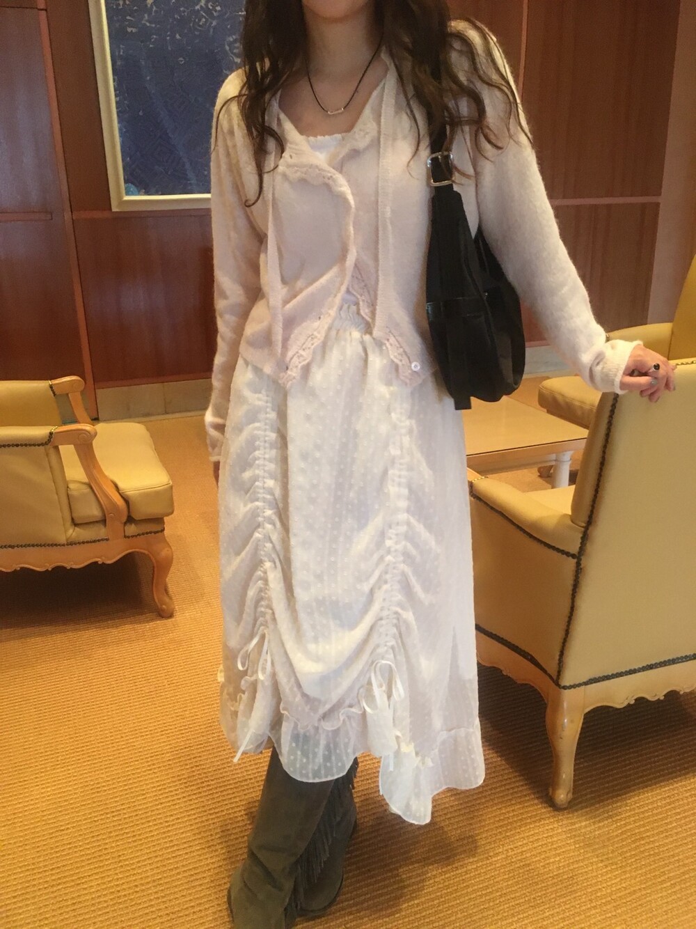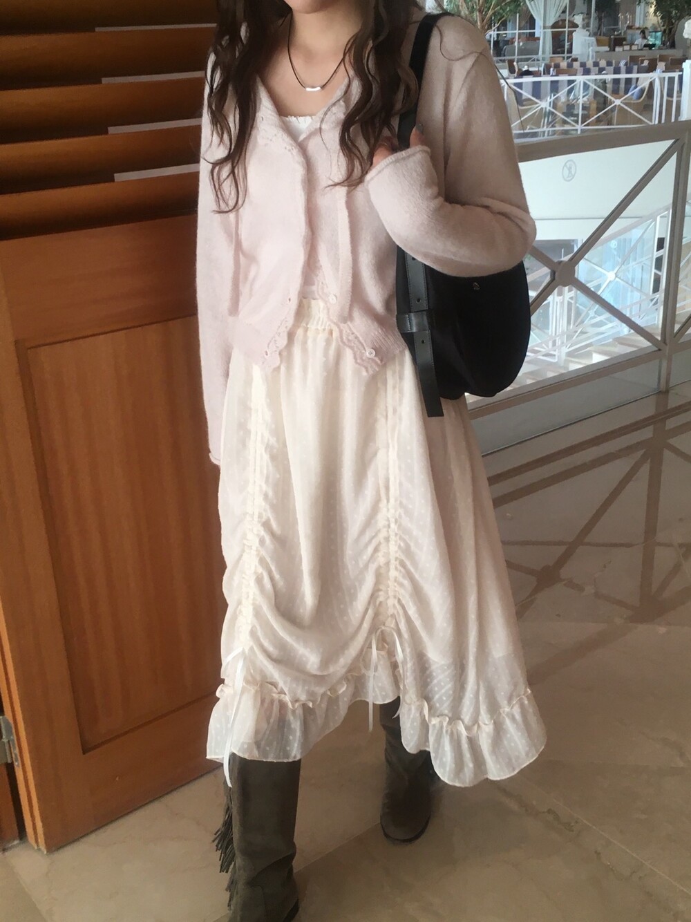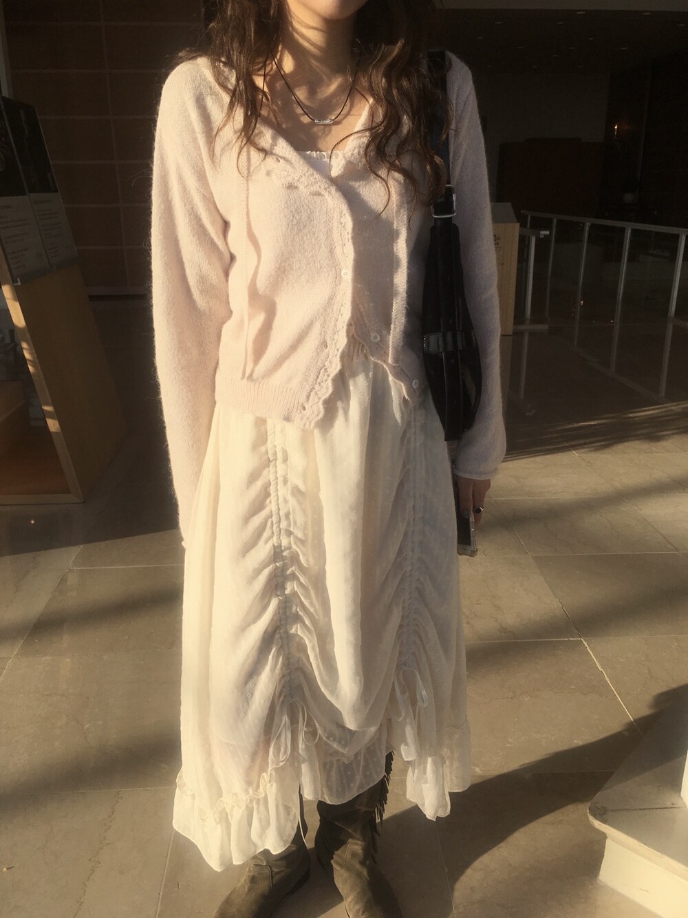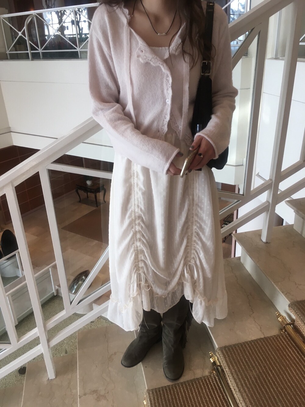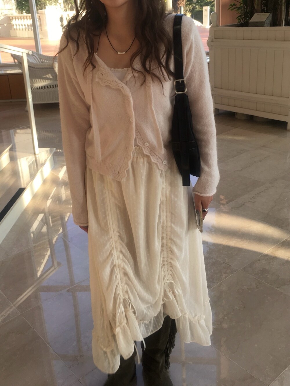 넥라인과 버튼라인을 따라 정교하게 들어간 물결모양으로 사랑스러운 연출이 가능하고, 어깨라인부터 길게 내려오는 동일 소재의 스트랩 디테일 있어, 리본으로 묶어 연출하거나 자연스럽게 늘어뜨려 유니크한 실루엣을 완성할 수 있습니다.
