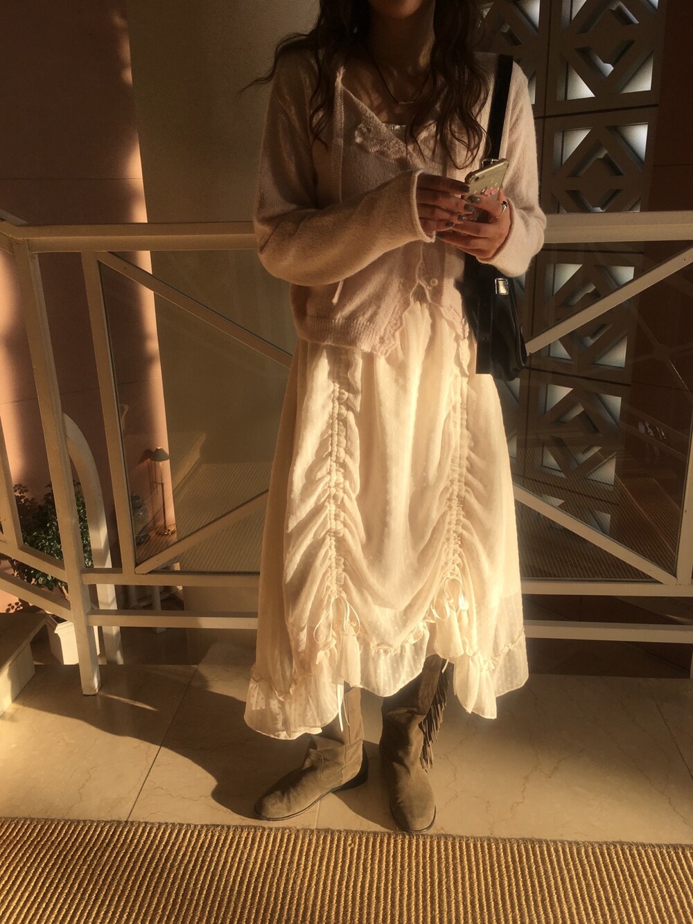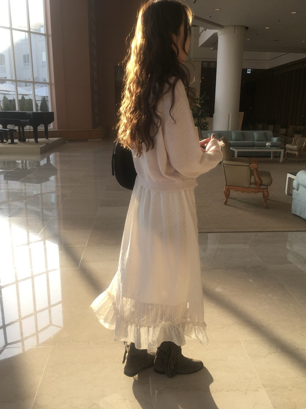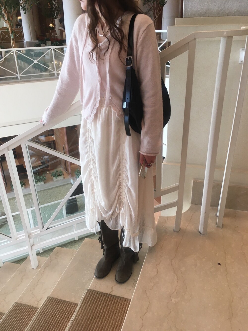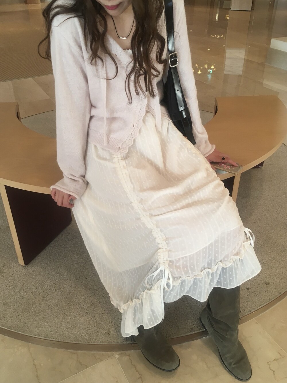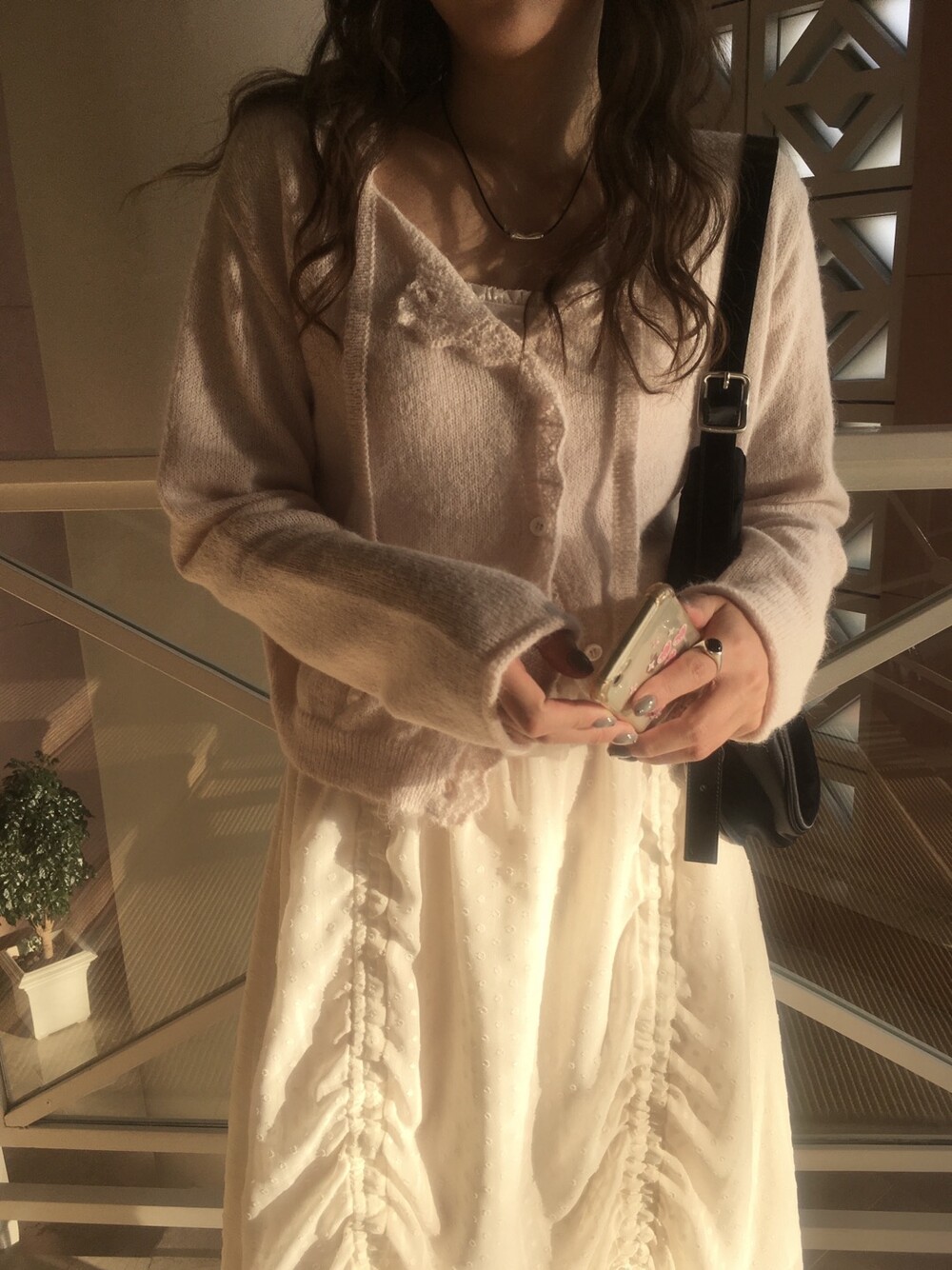 넥라인과 버튼라인을 따라 정교하게 들어간 물결모양으로 사랑스러운 연출이 가능하고, 어깨라인부터 길게 내려오는 동일 소재의 스트랩 디테일 있어, 리본으로 묶어 연출하거나 자연스럽게 늘어뜨려 유니크한 실루엣을 완성할 수 있습니다.