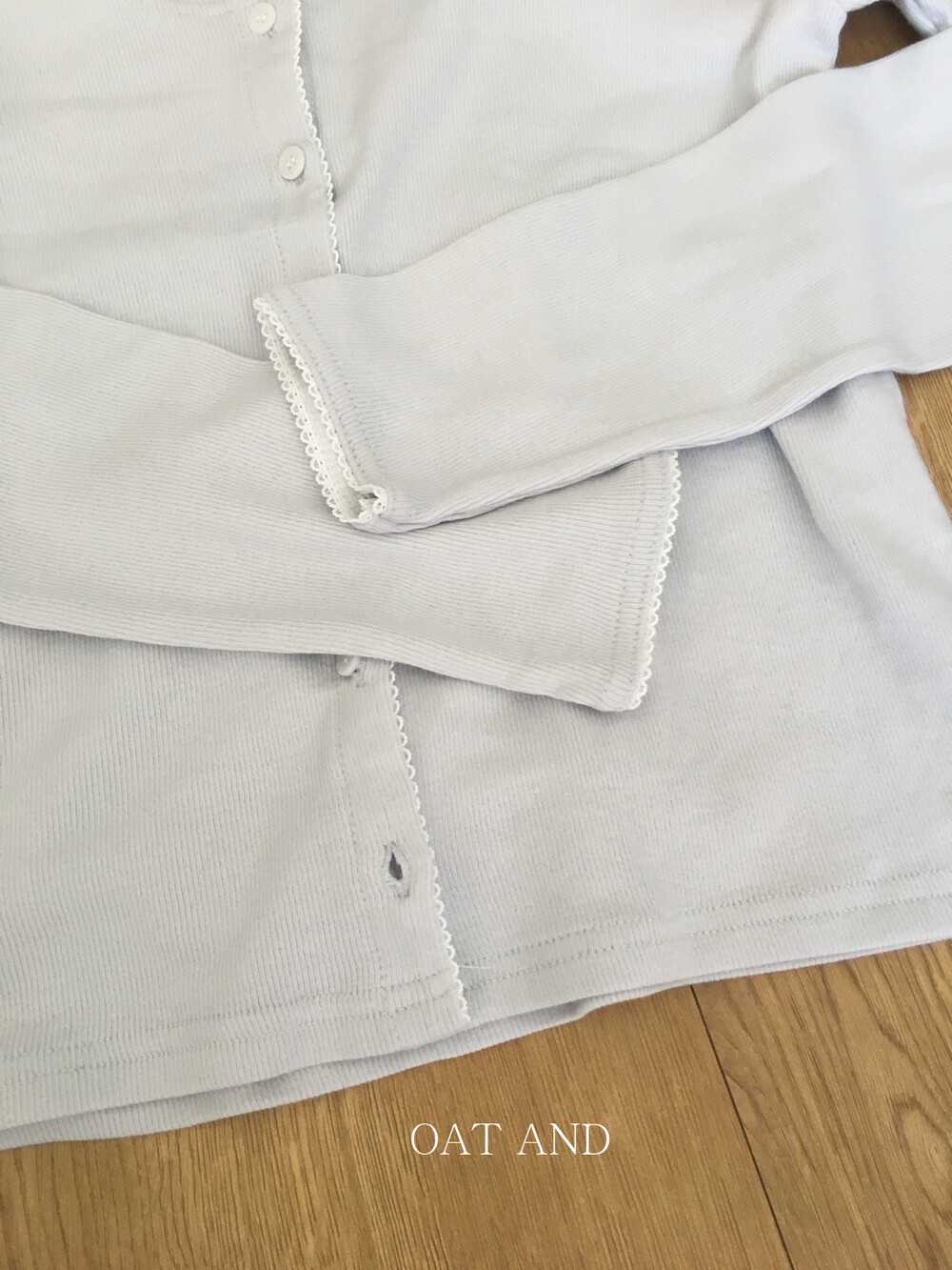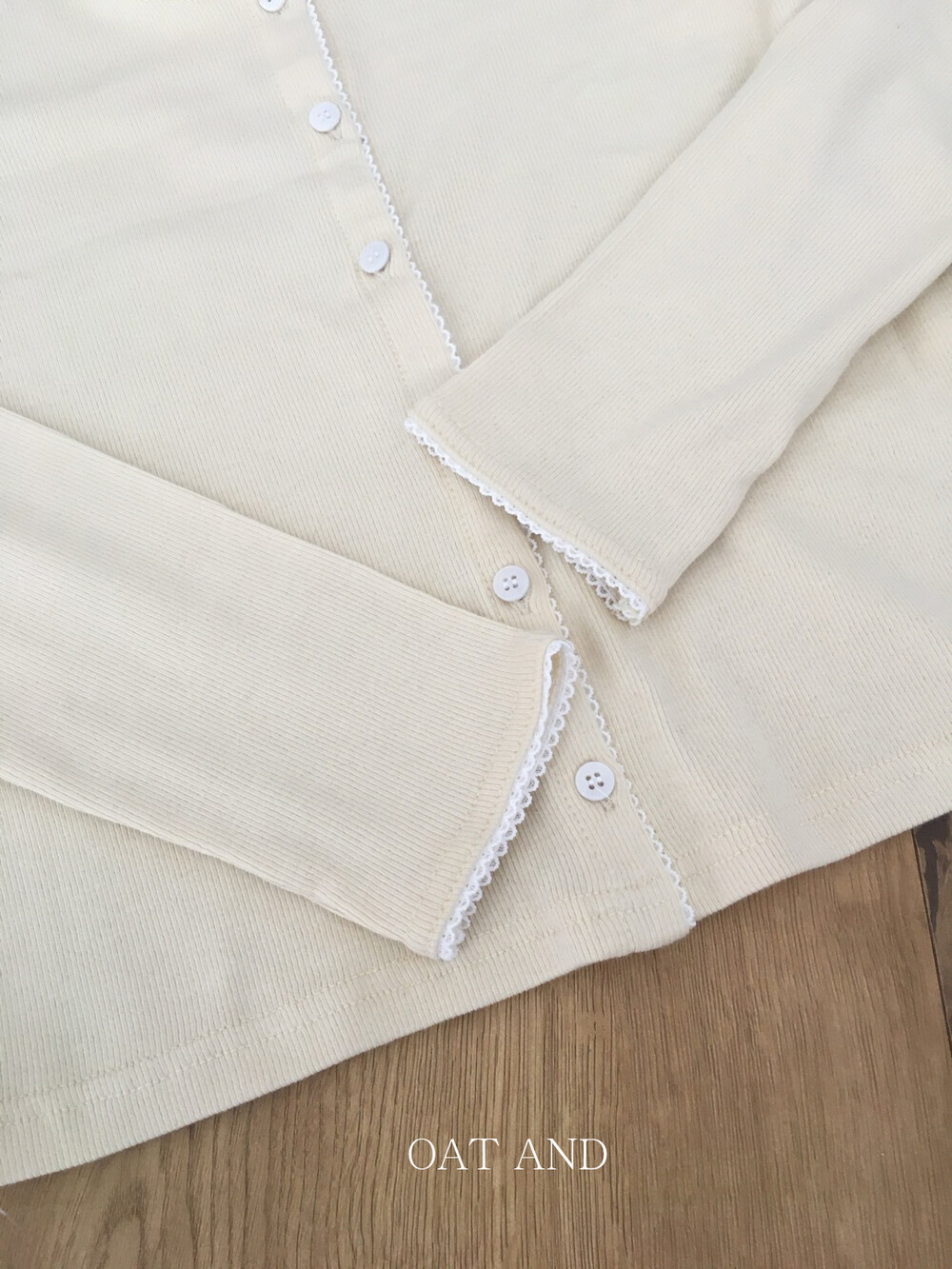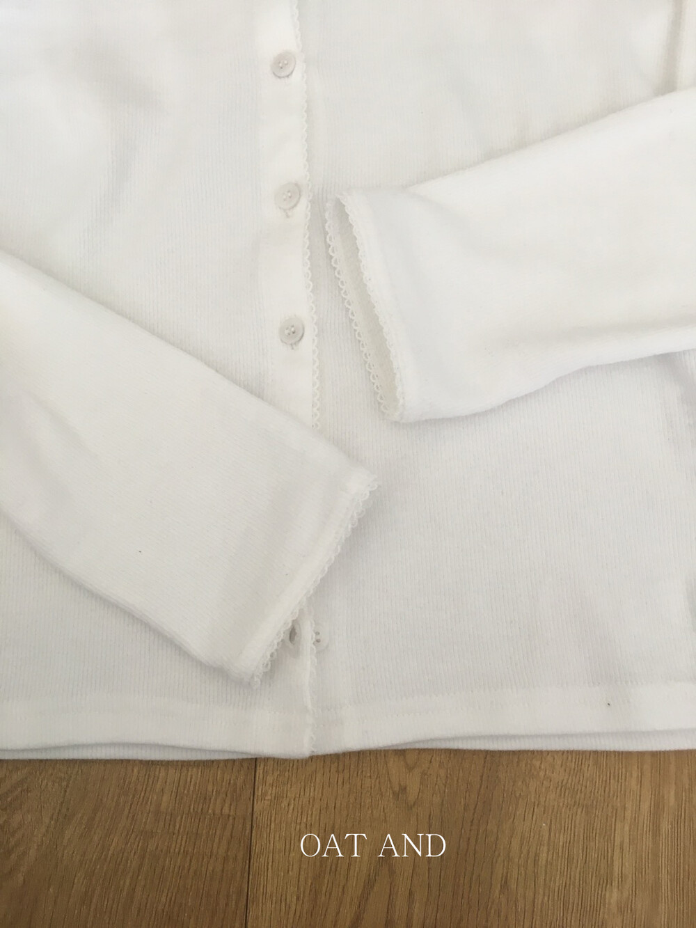 넥라인부터 소매 끝까지 촘촘하게 수놓아진 화이트 레이스 디테일이 포인트랍니다.
