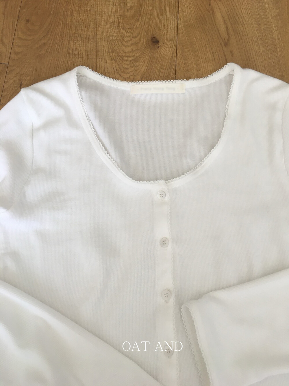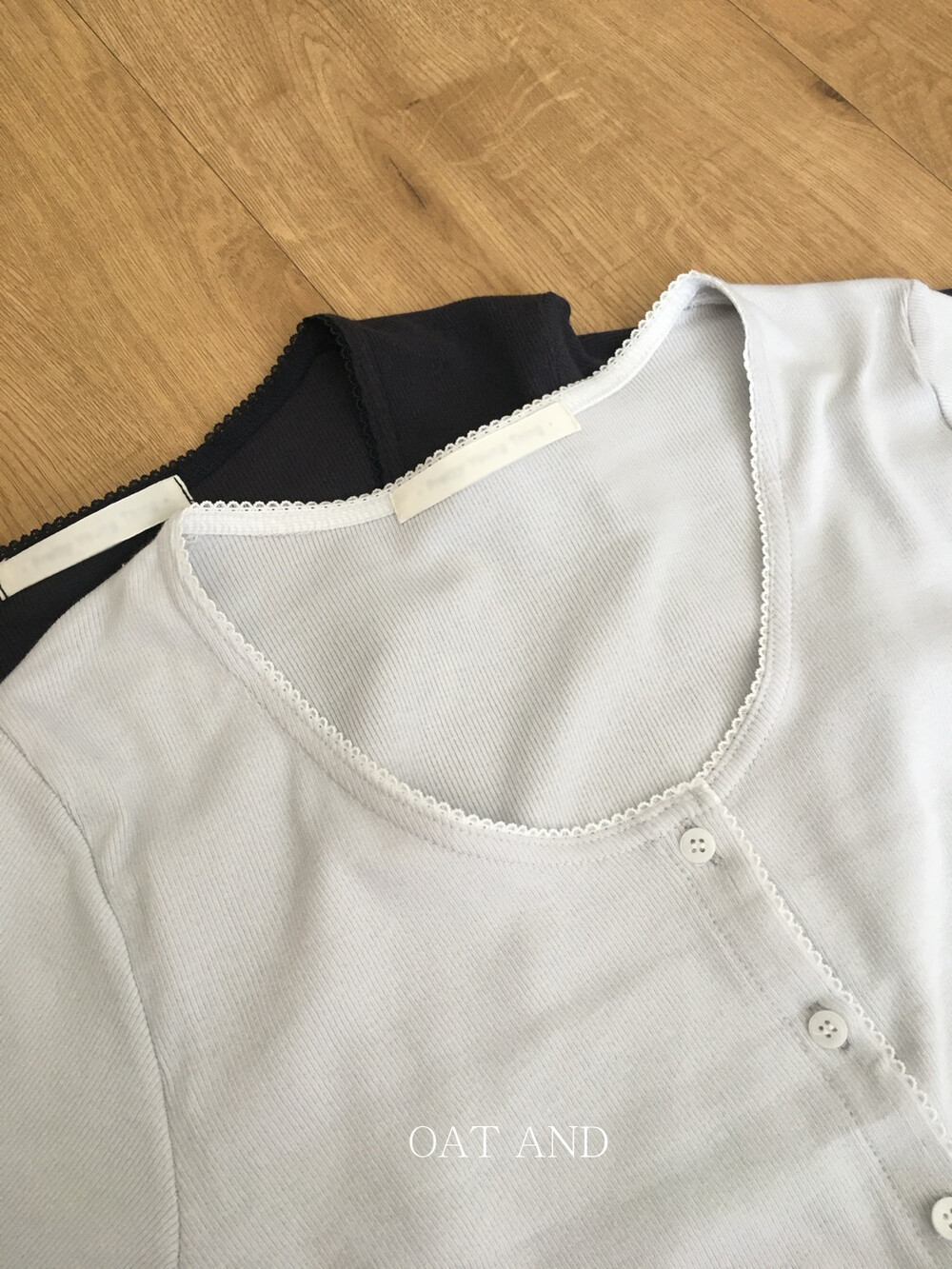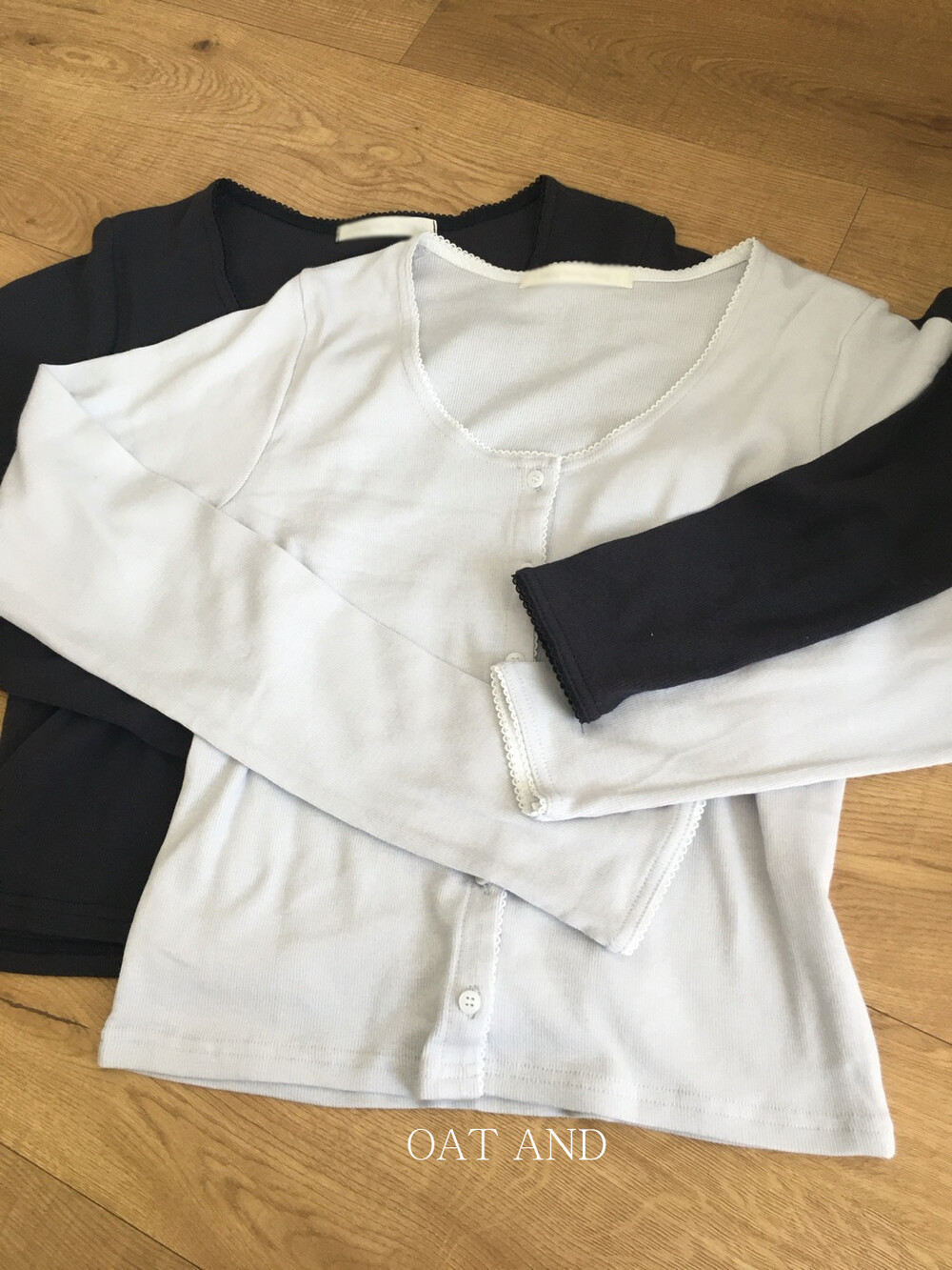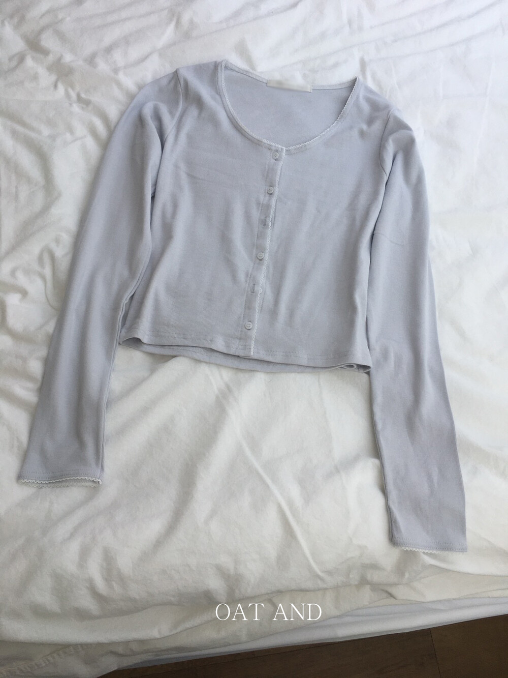 넥라인부터 소매 끝까지 촘촘하게 수놓아진 화이트 레이스 디테일이 포인트랍니다.