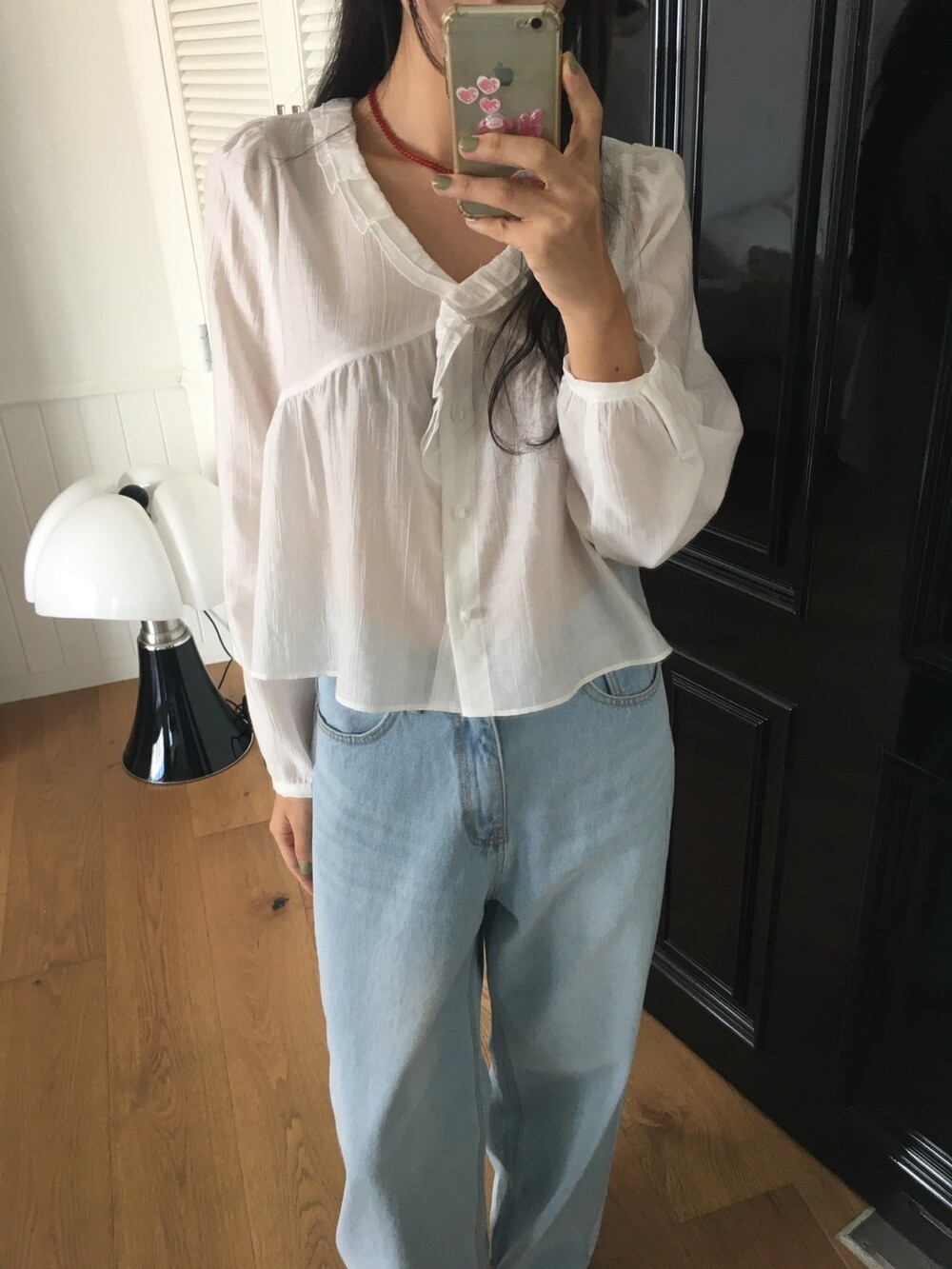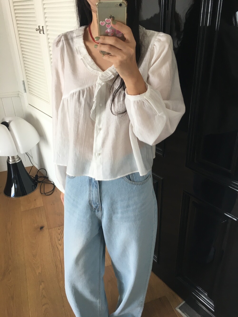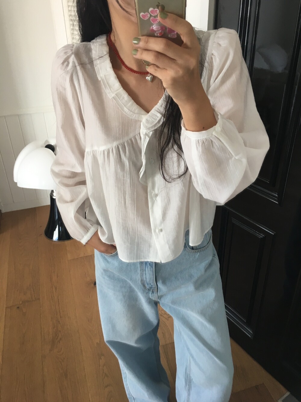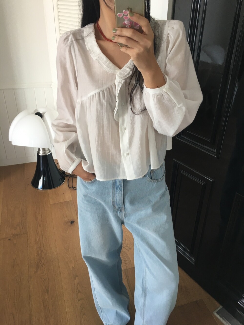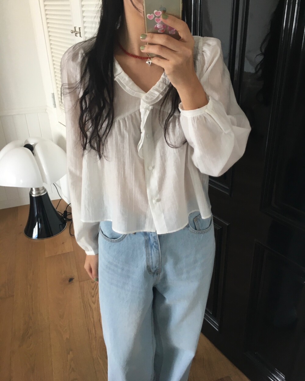 넥라인을 따라 더해진 프릴 디테일이 얼굴선을 부드럽게 만들어주고, 자연스럽게 시선을 위로 끌어줘서 더욱 여리한 느낌을 줘요.