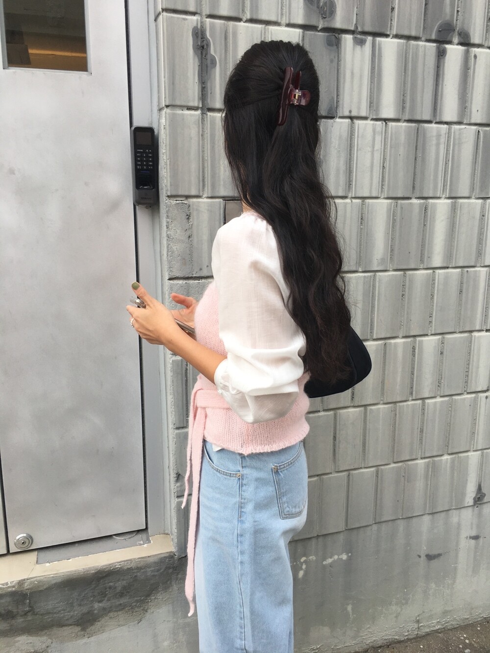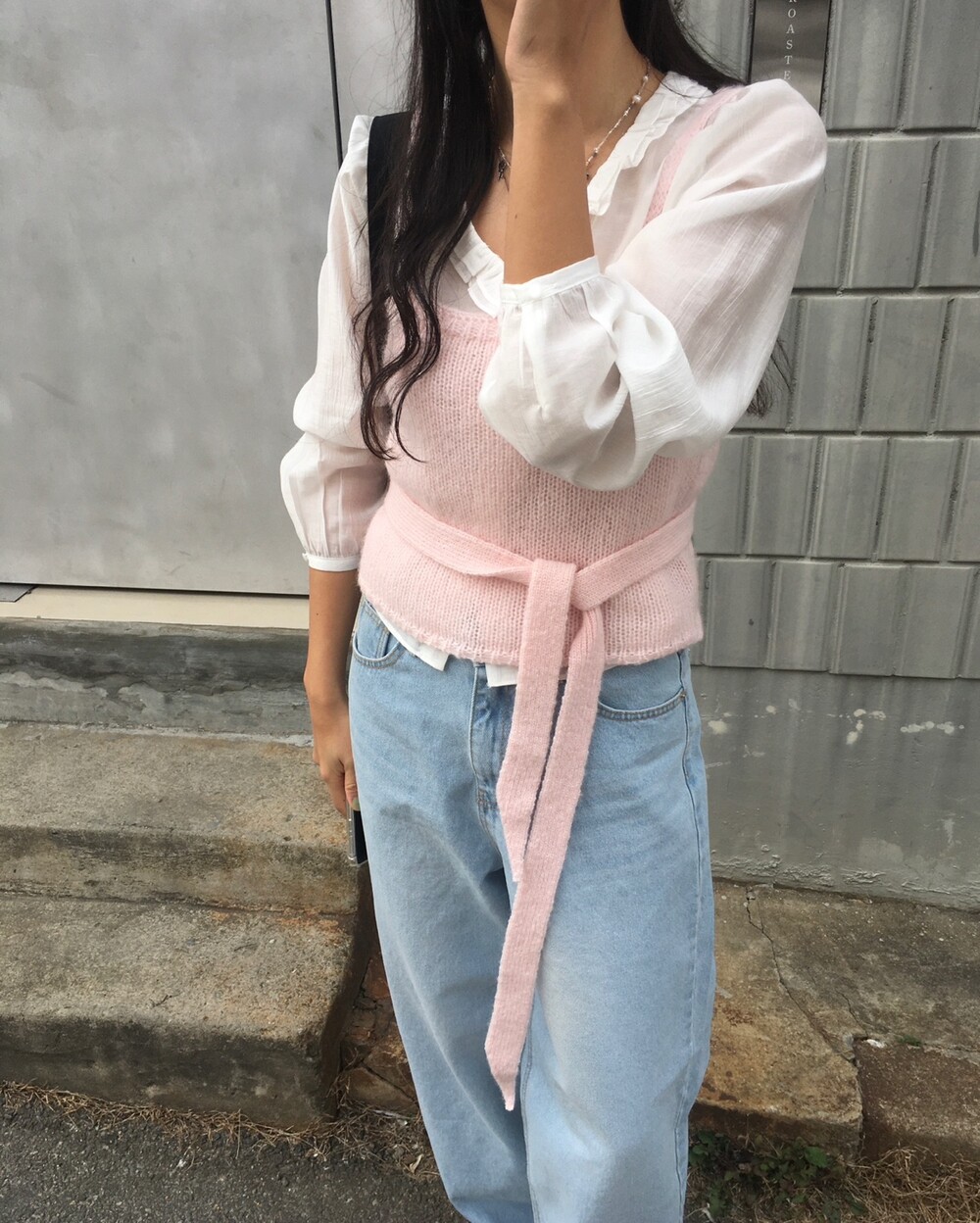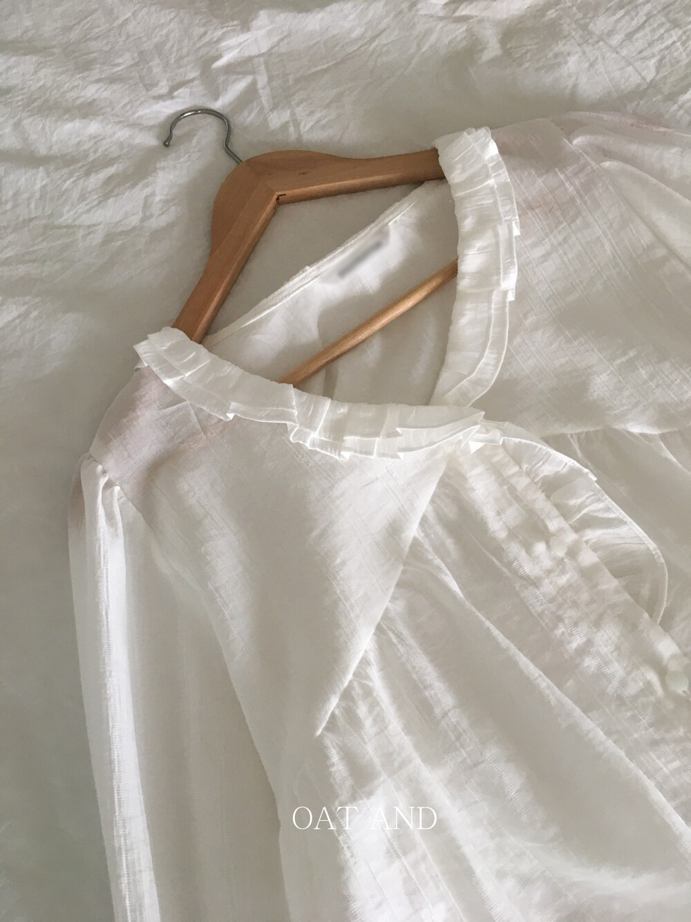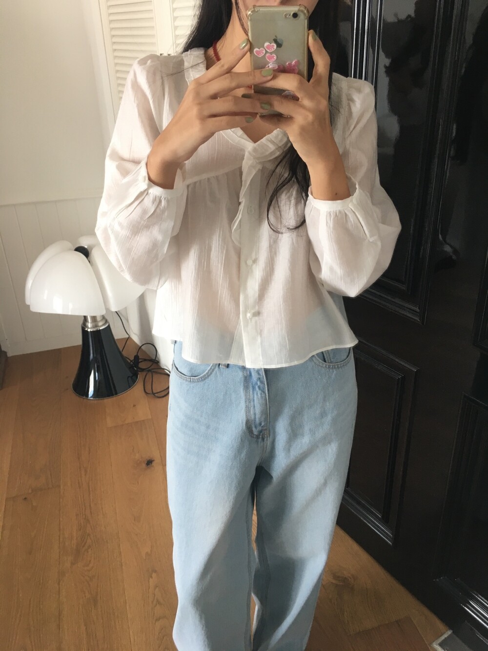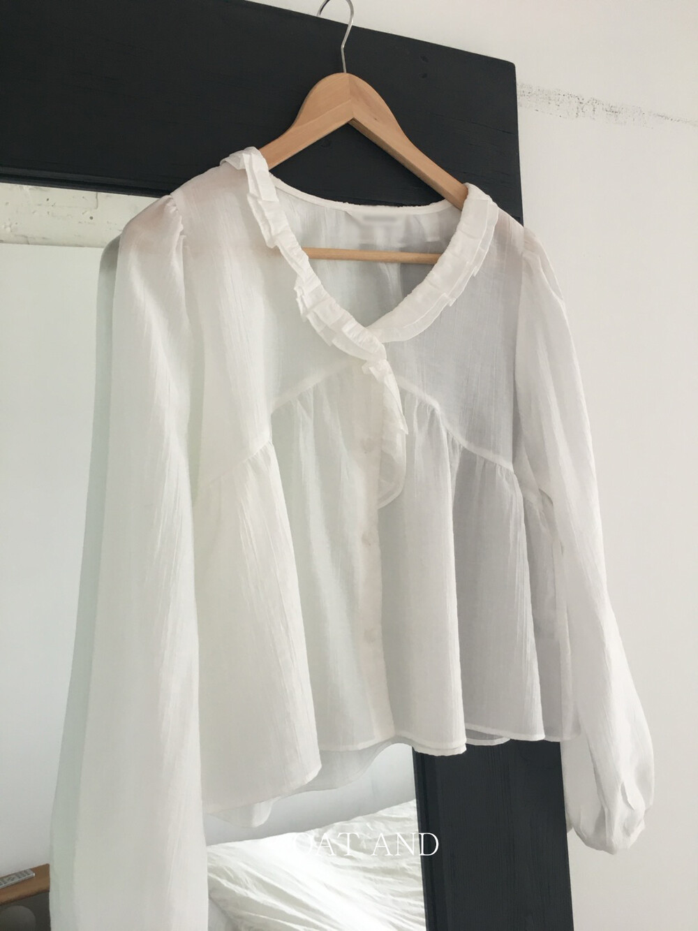 넥라인을 따라 더해진 프릴 디테일이 얼굴선을 부드럽게 만들어주고, 자연스럽게 시선을 위로 끌어줘서 더욱 여리한 느낌을 줘요.