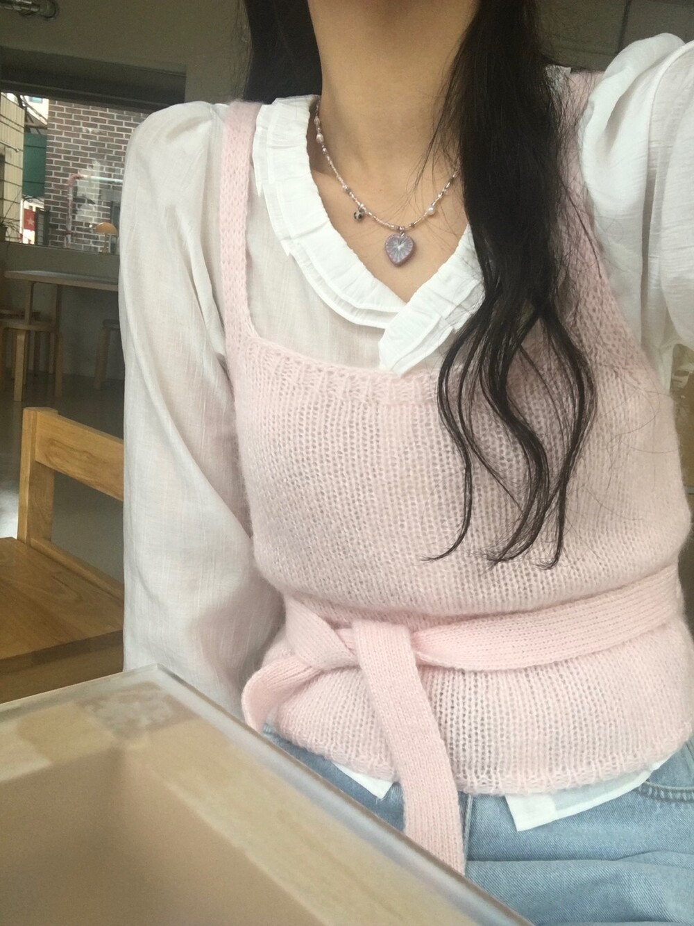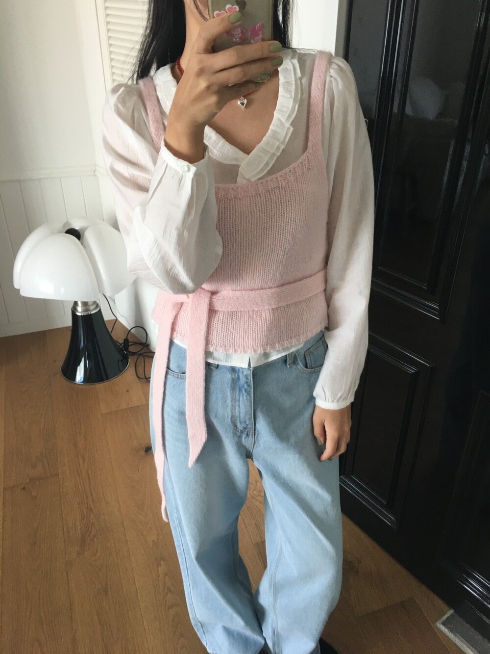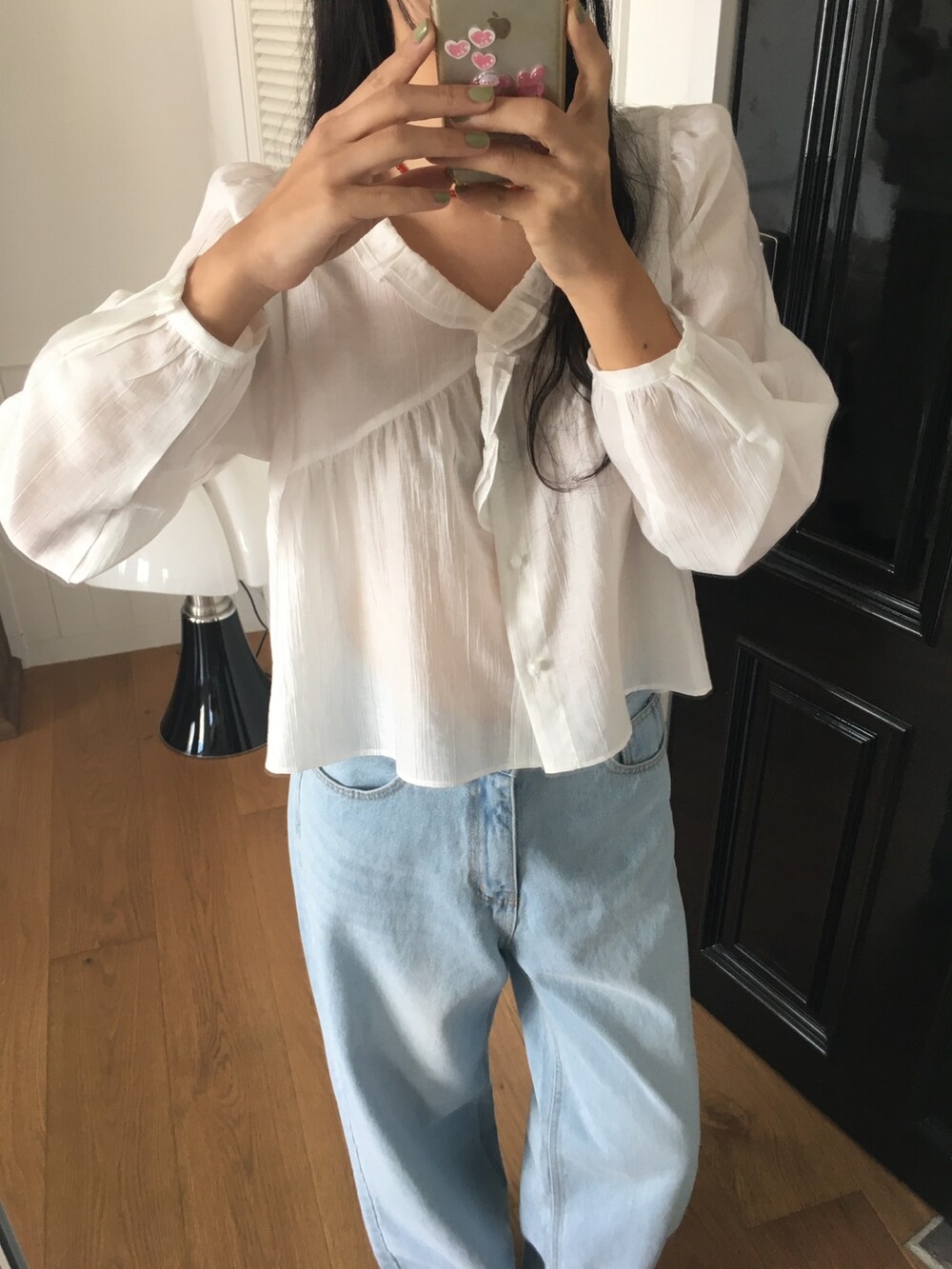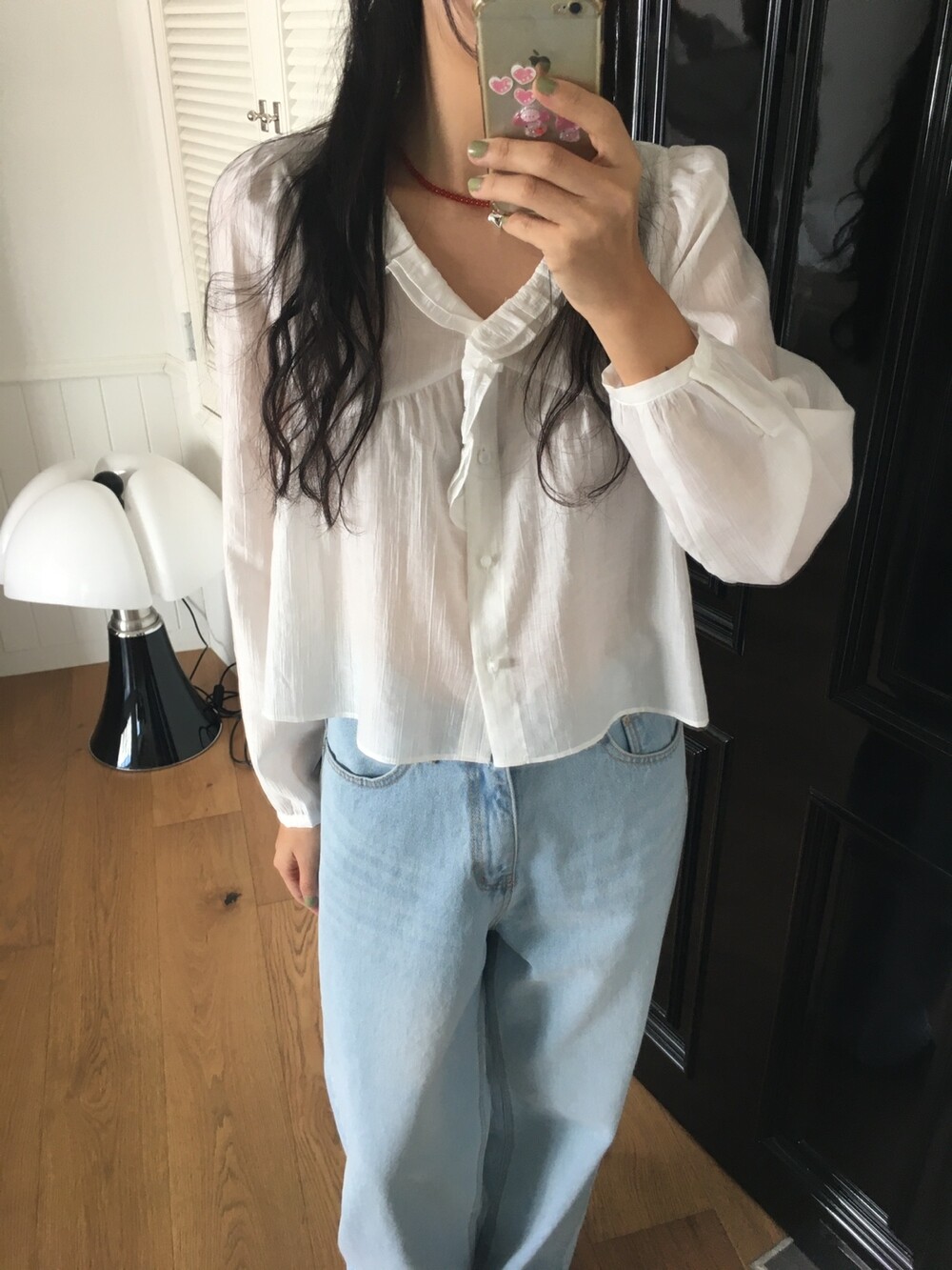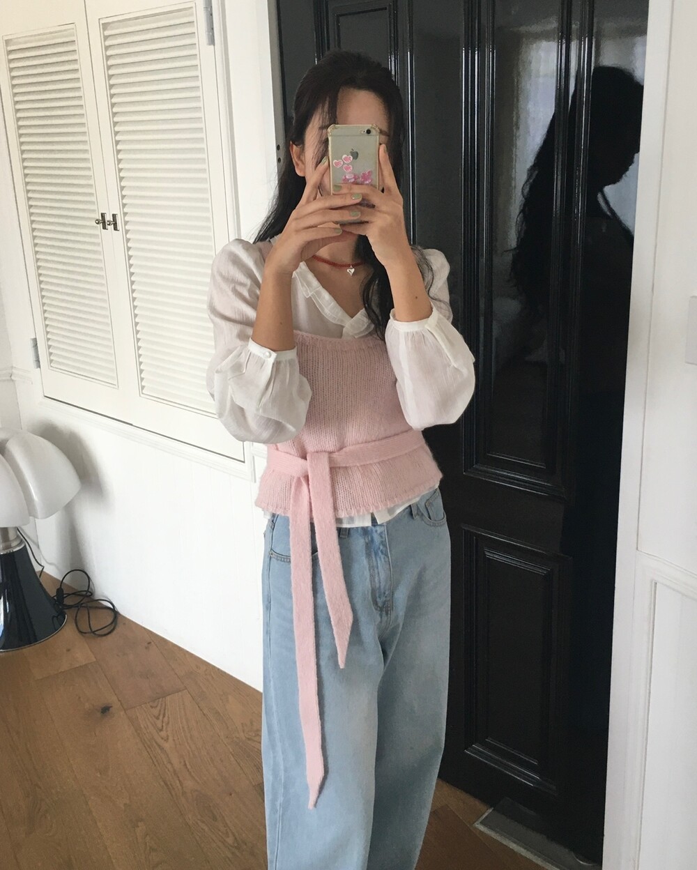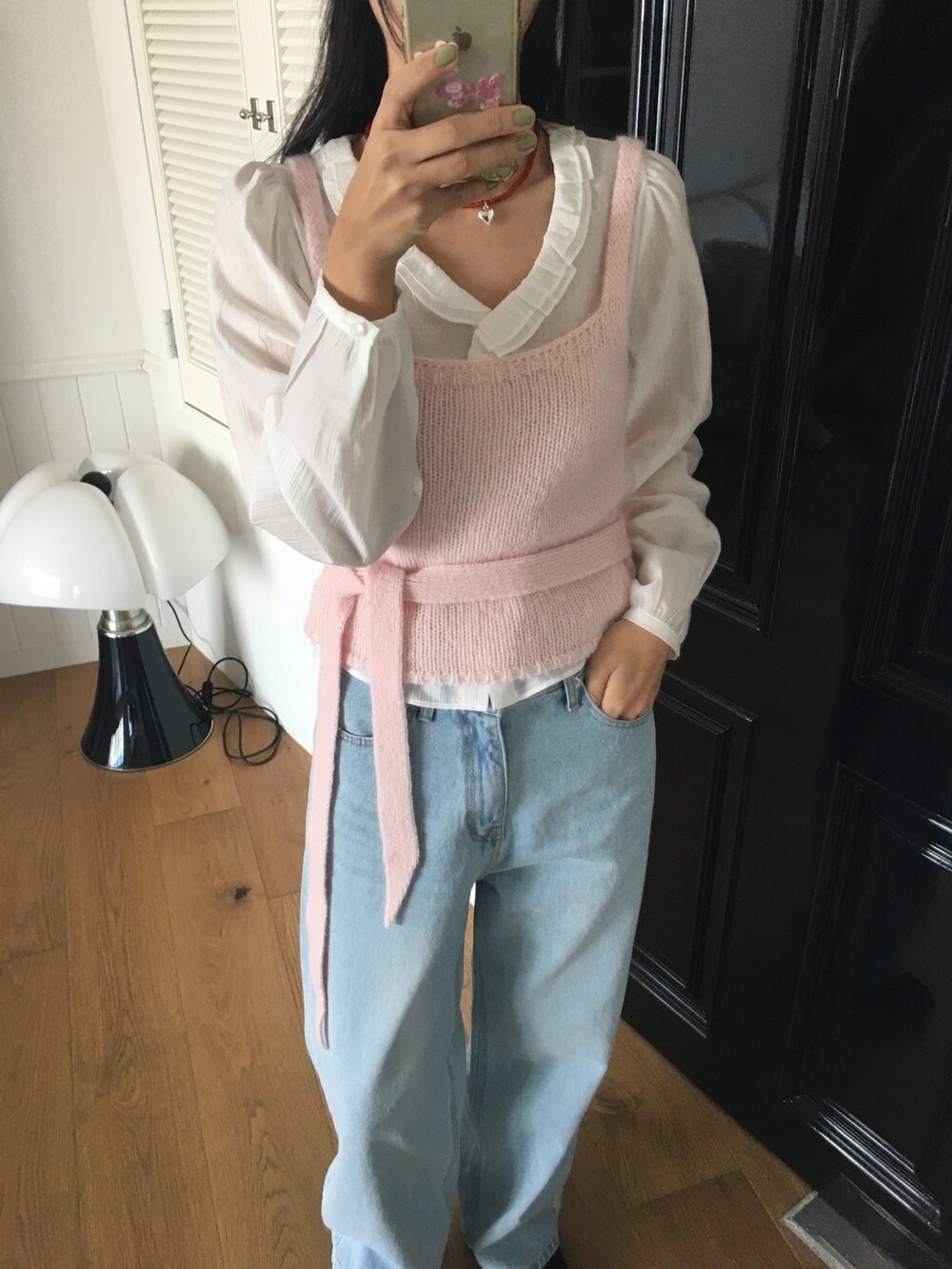 넥라인을 따라 더해진 프릴 디테일이 얼굴선을 부드럽게 만들어주고, 자연스럽게 시선을 위로 끌어줘서 더욱 여리한 느낌을 줘요.