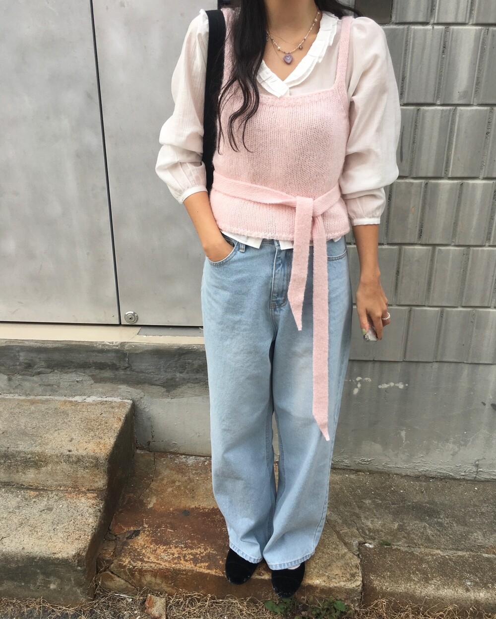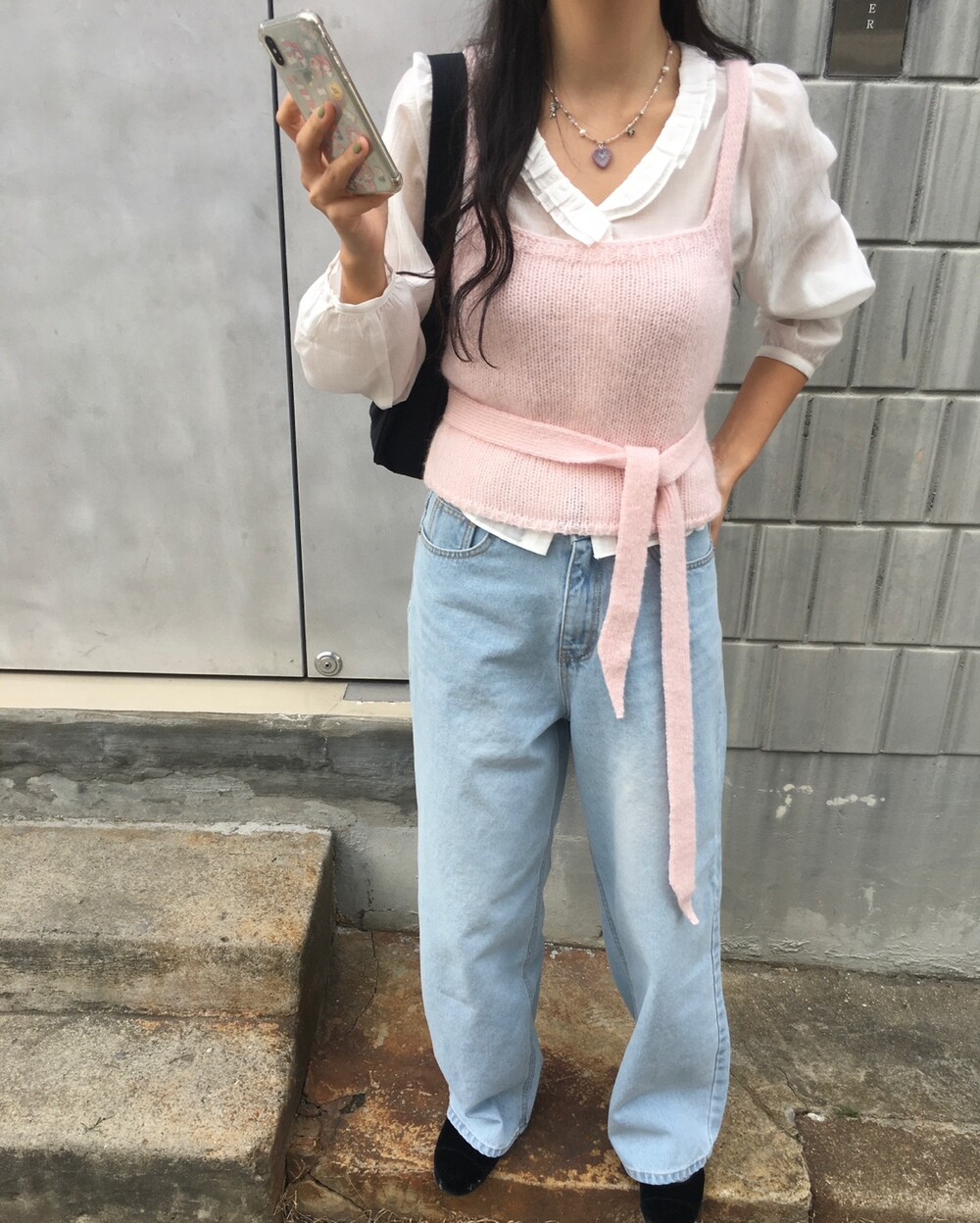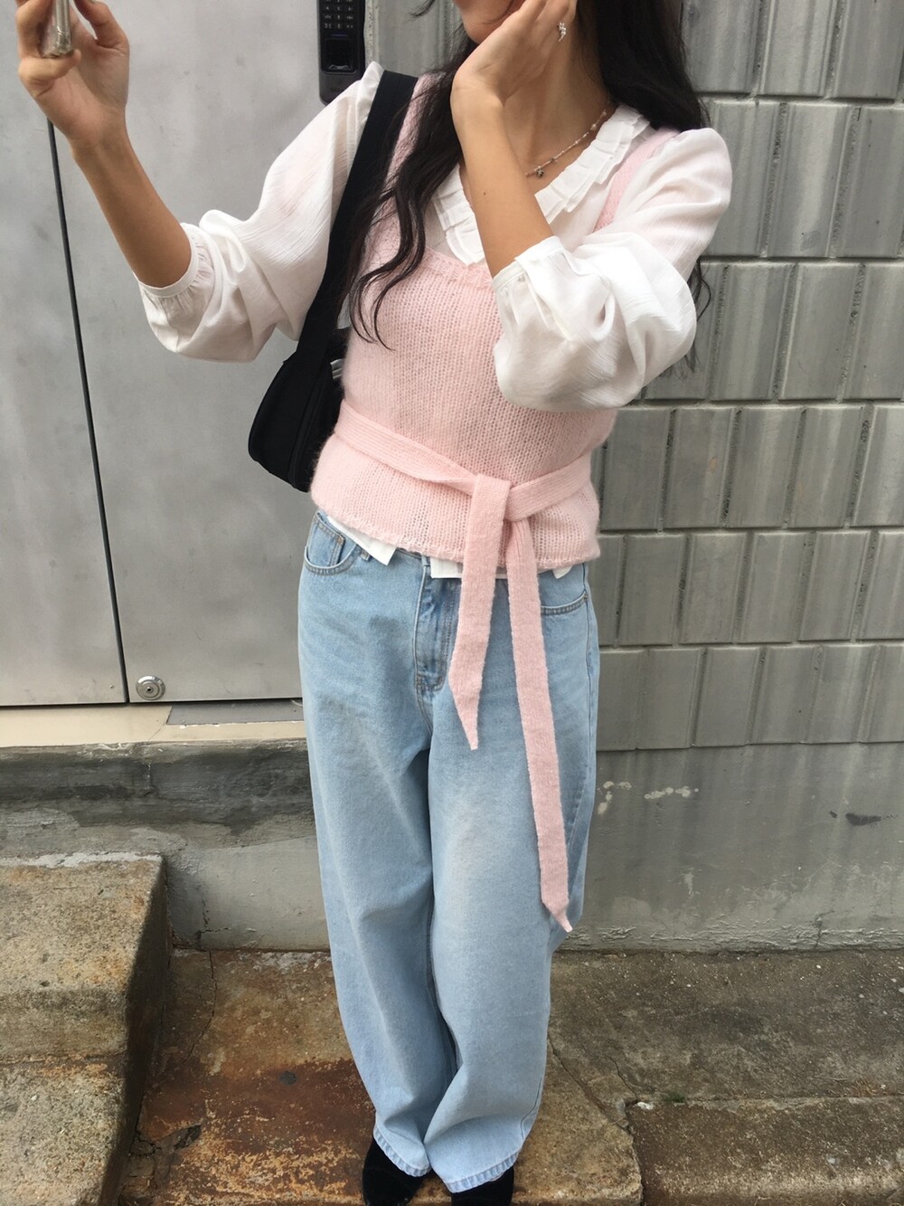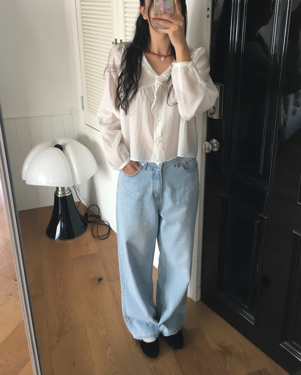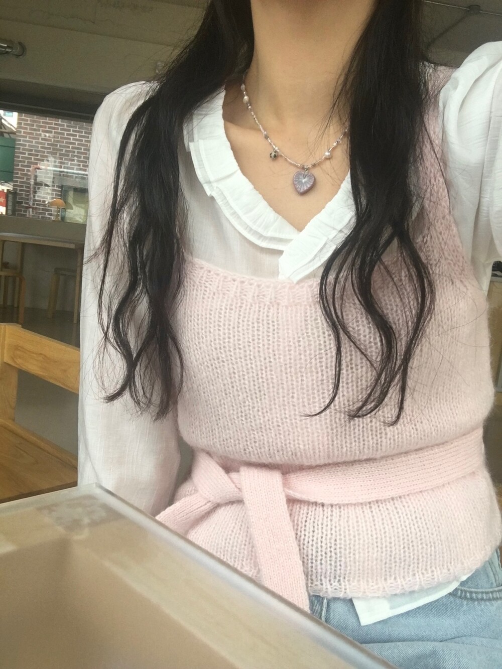 넥라인을 따라 더해진 프릴 디테일이 얼굴선을 부드럽게 만들어주고, 자연스럽게 시선을 위로 끌어줘서 더욱 여리한 느낌을 줘요.