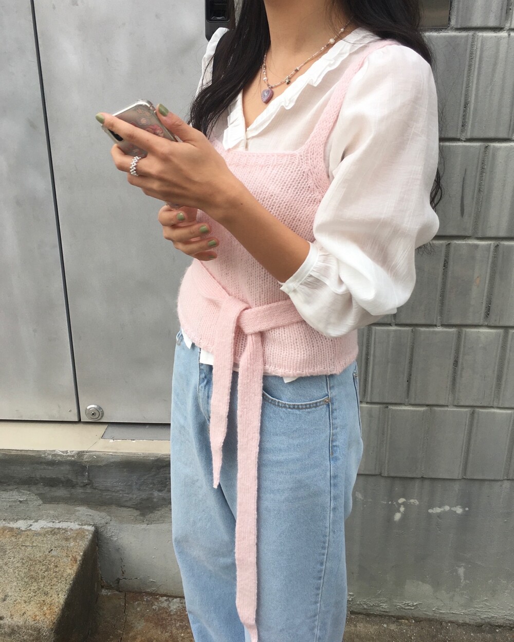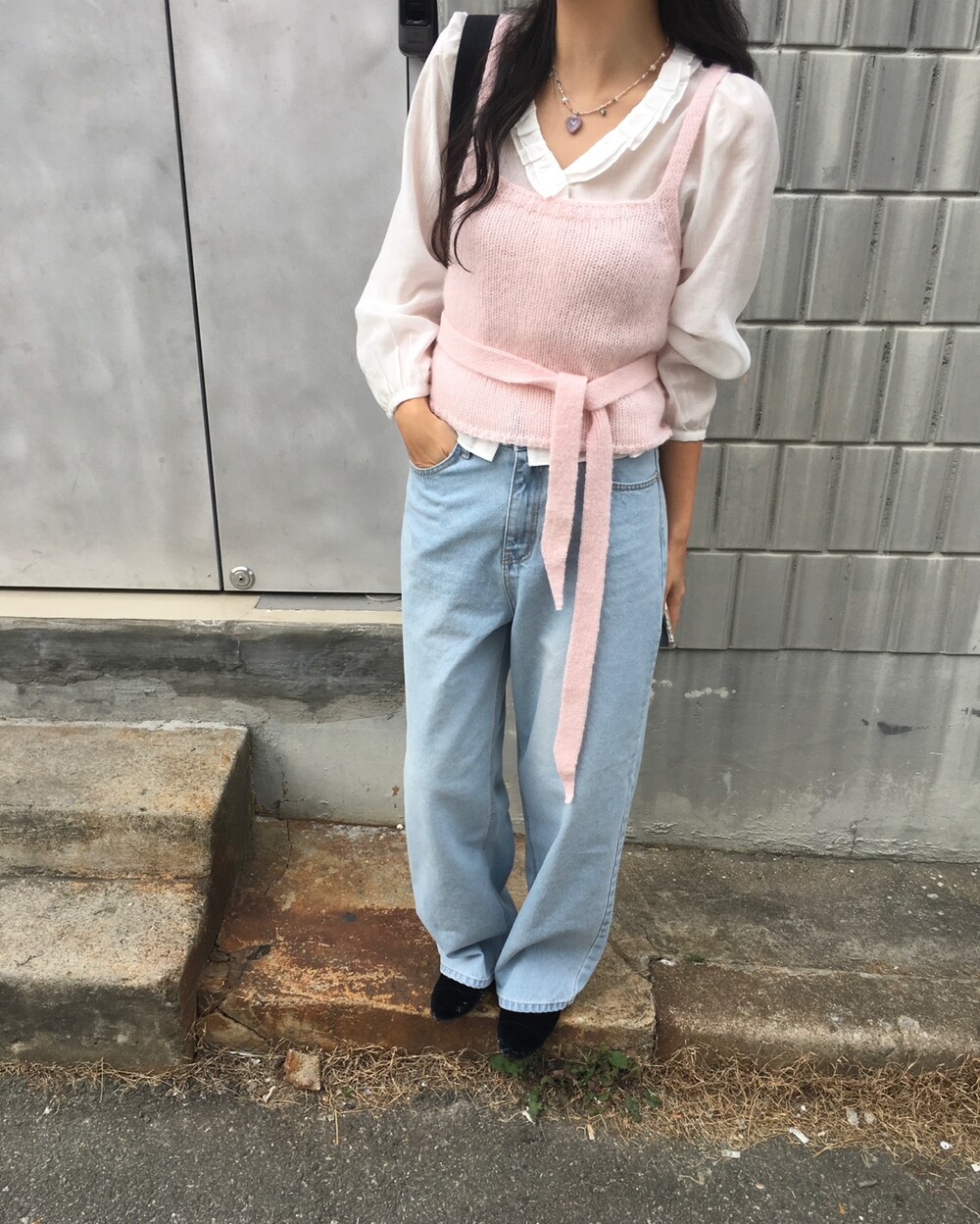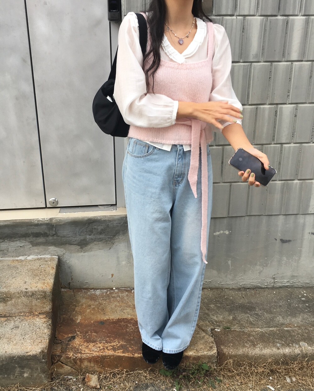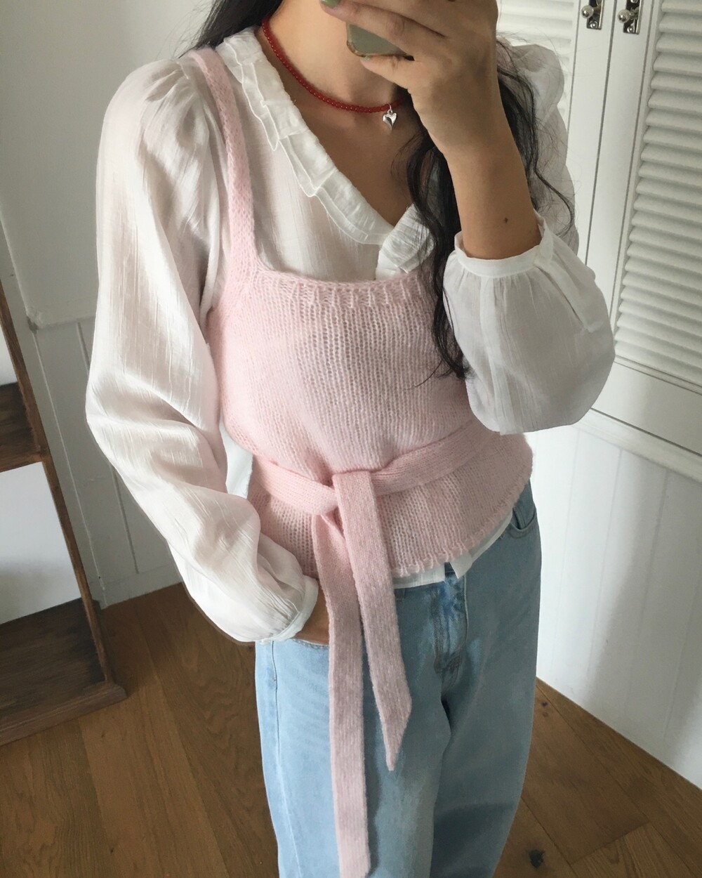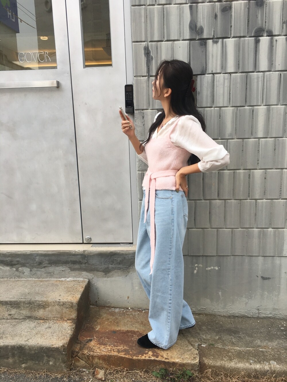 넥라인을 따라 더해진 프릴 디테일이 얼굴선을 부드럽게 만들어주고, 자연스럽게 시선을 위로 끌어줘서 더욱 여리한 느낌을 줘요.