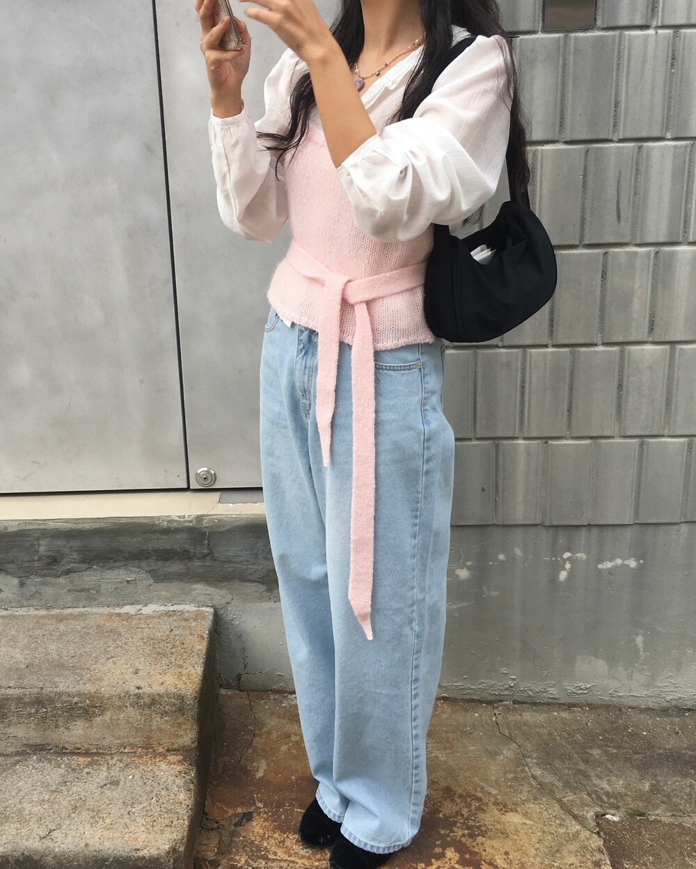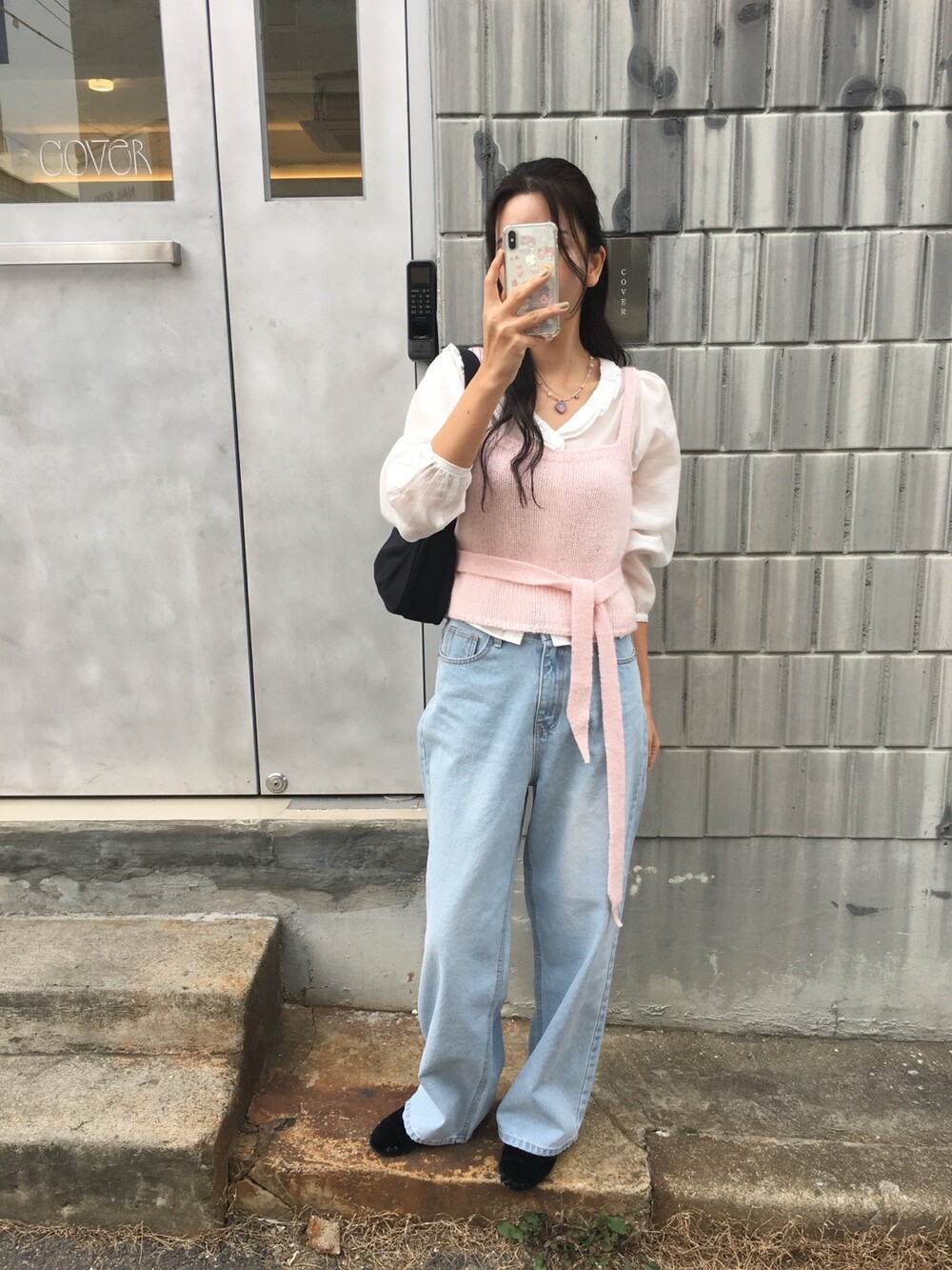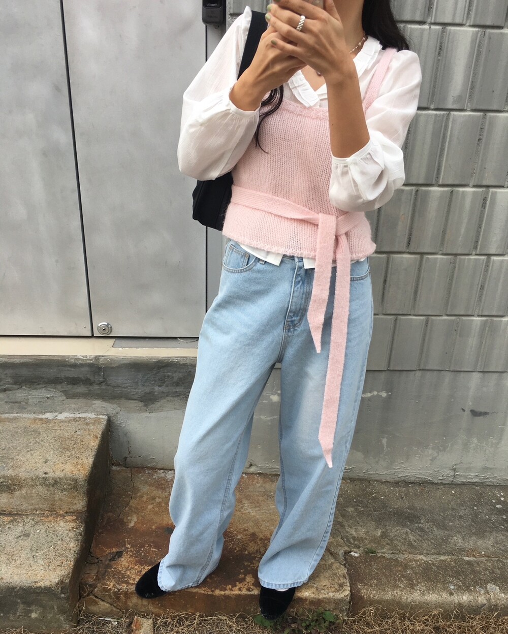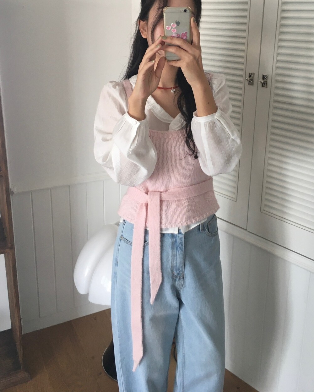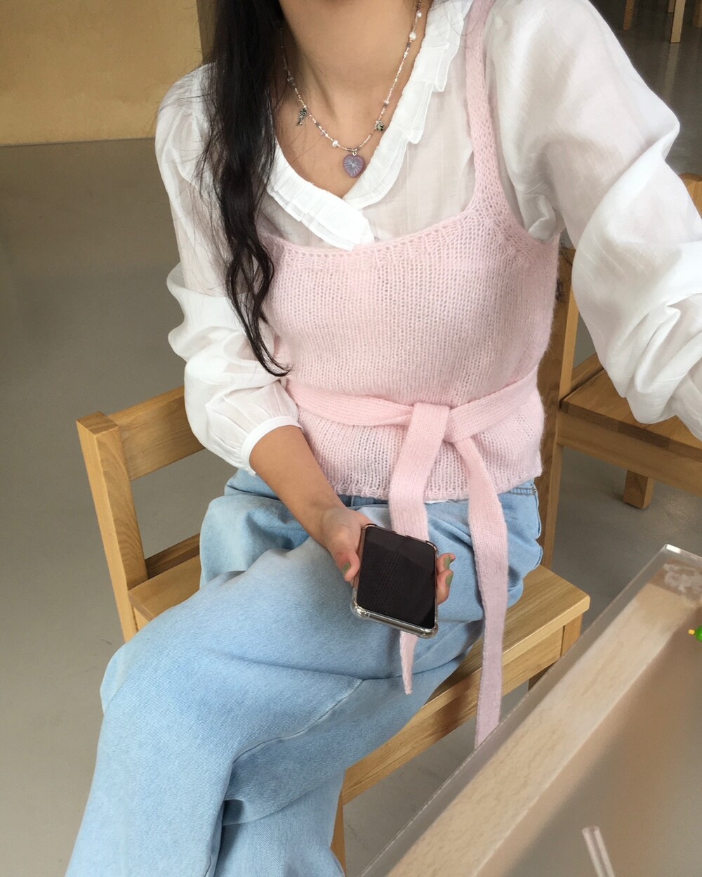 넥라인을 따라 더해진 프릴 디테일이 얼굴선을 부드럽게 만들어주고, 자연스럽게 시선을 위로 끌어줘서 더욱 여리한 느낌을 줘요.