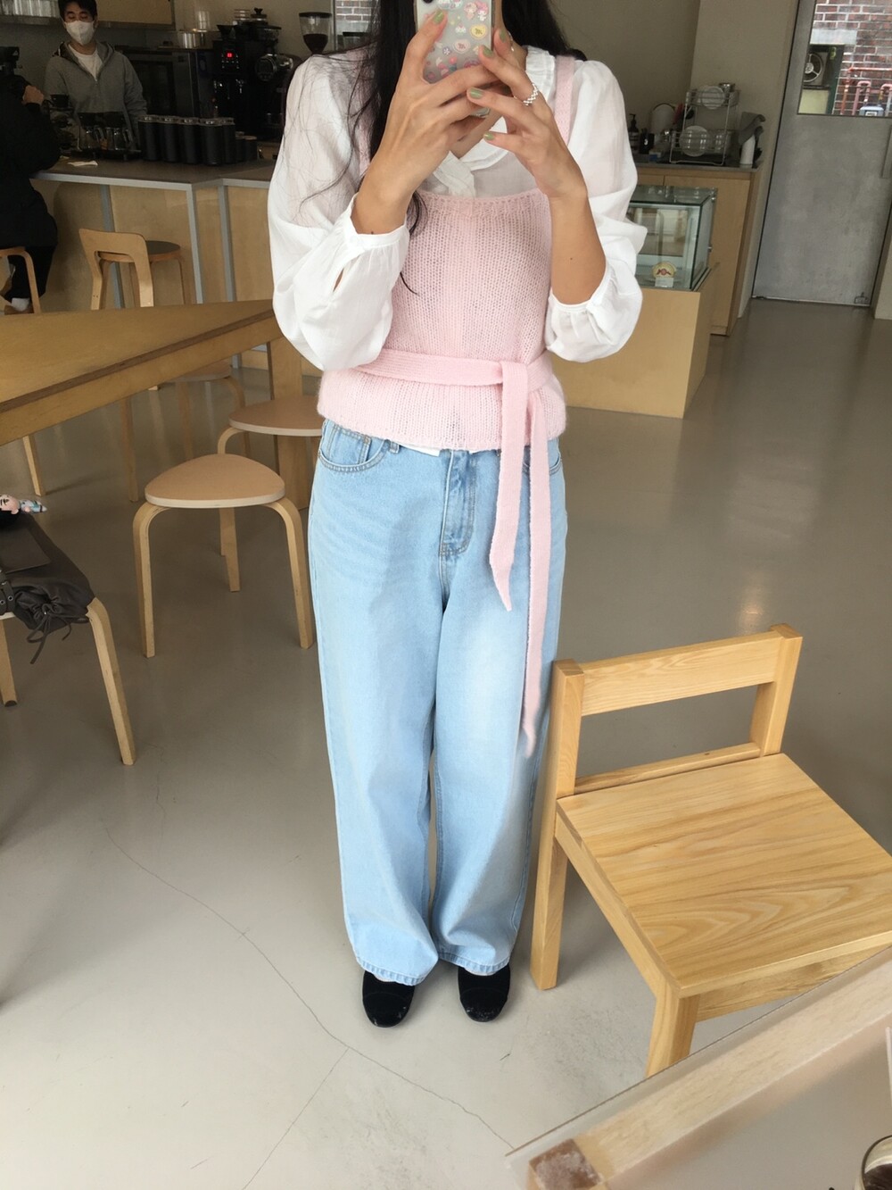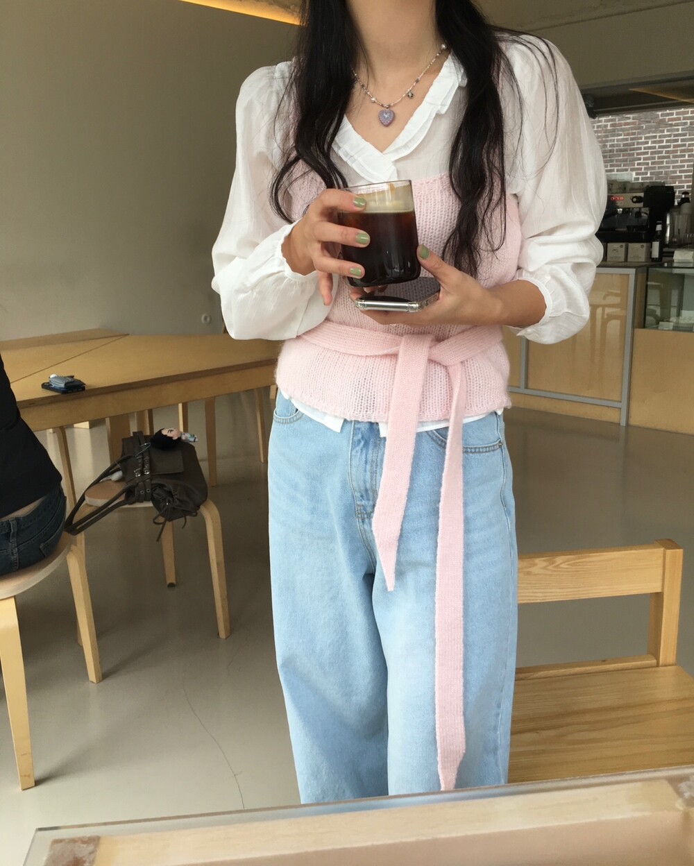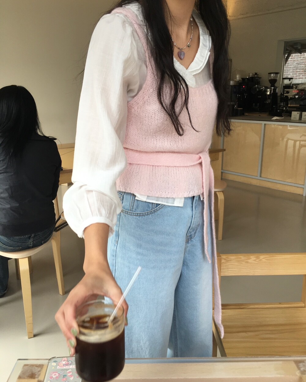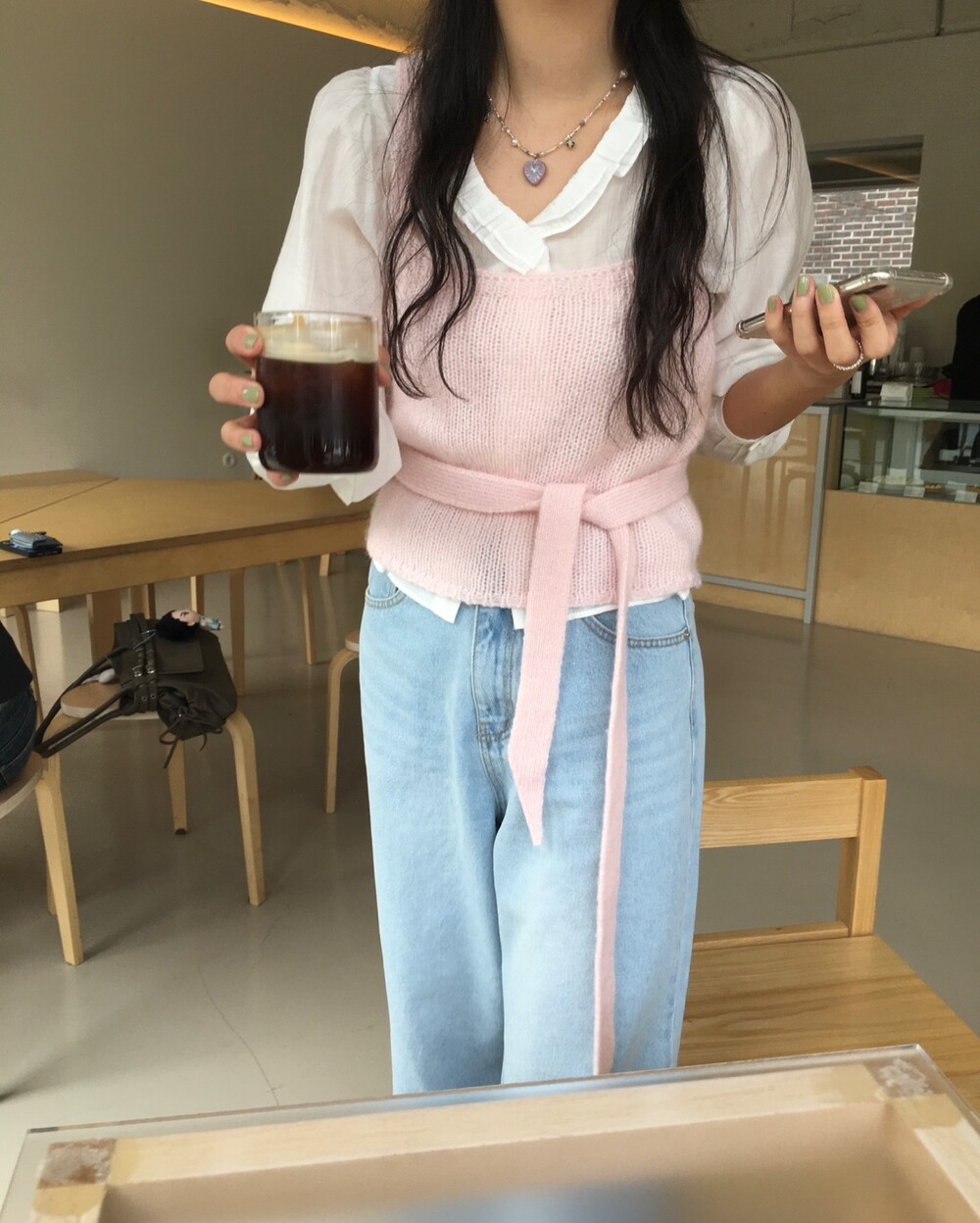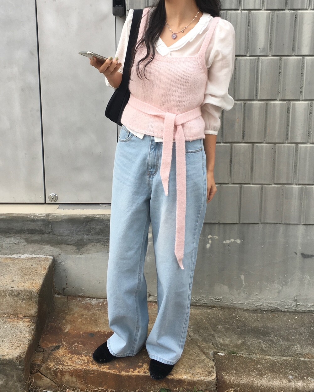 넥라인을 따라 더해진 프릴 디테일이 얼굴선을 부드럽게 만들어주고, 자연스럽게 시선을 위로 끌어줘서 더욱 여리한 느낌을 줘요.