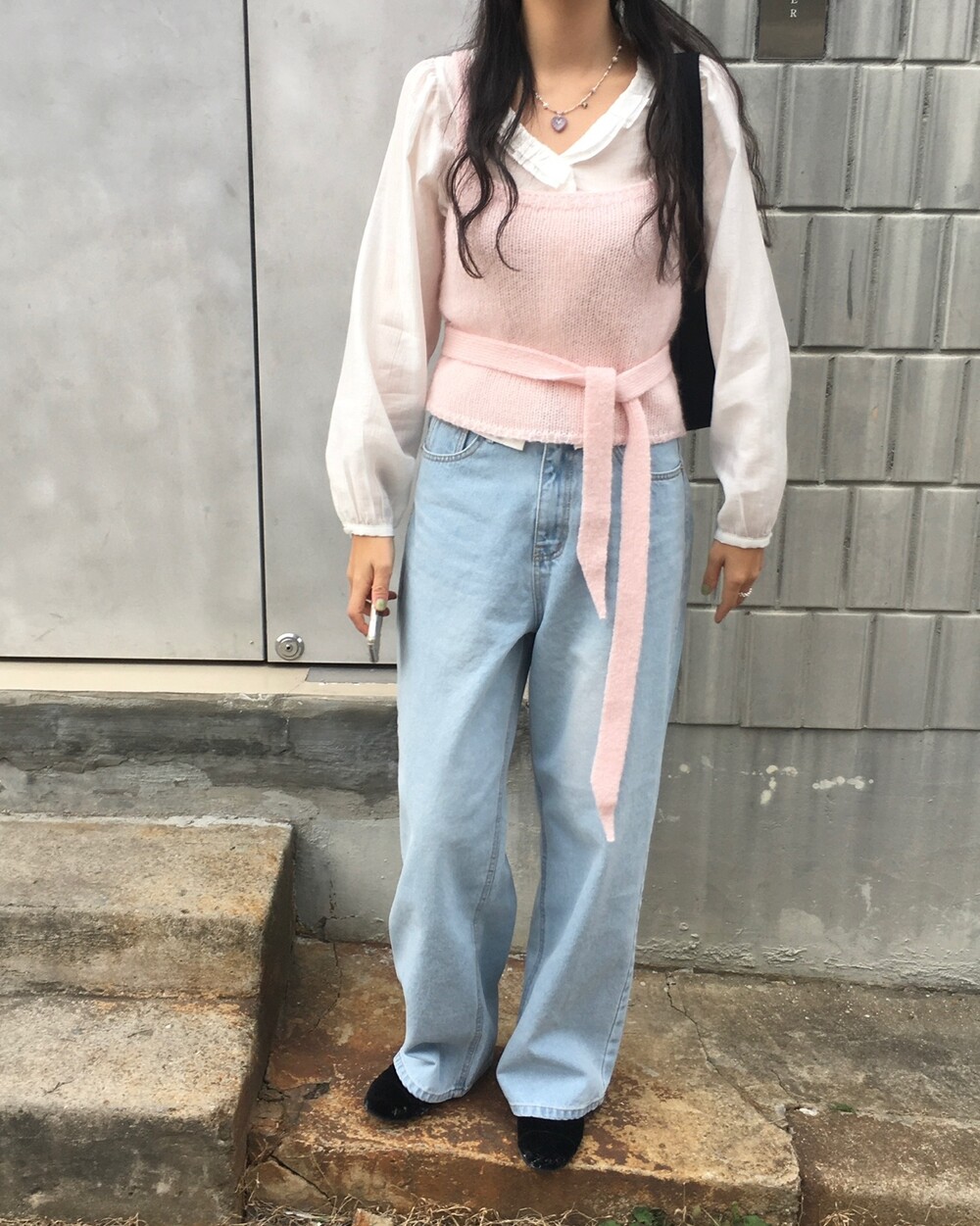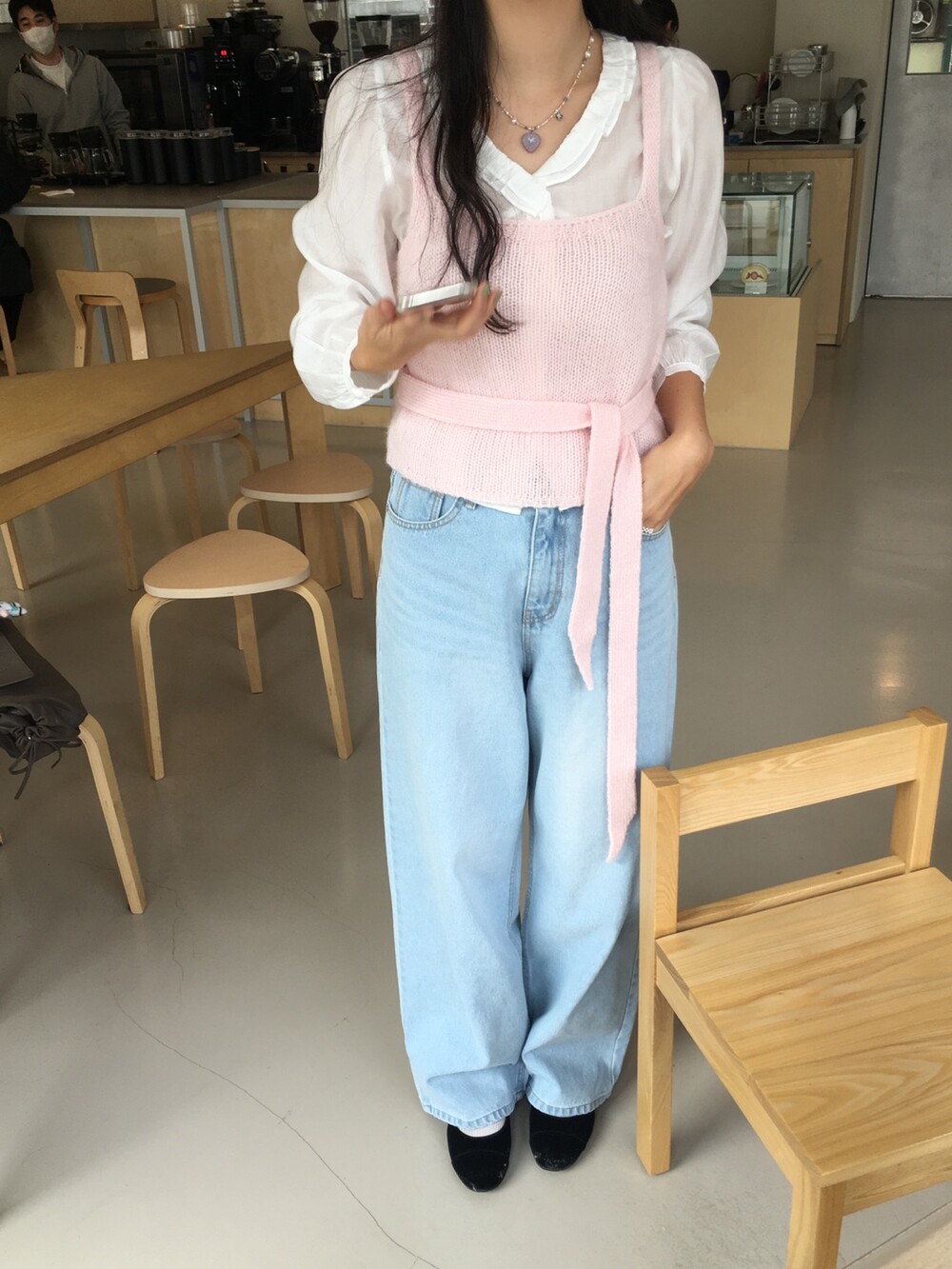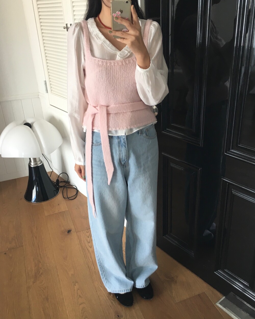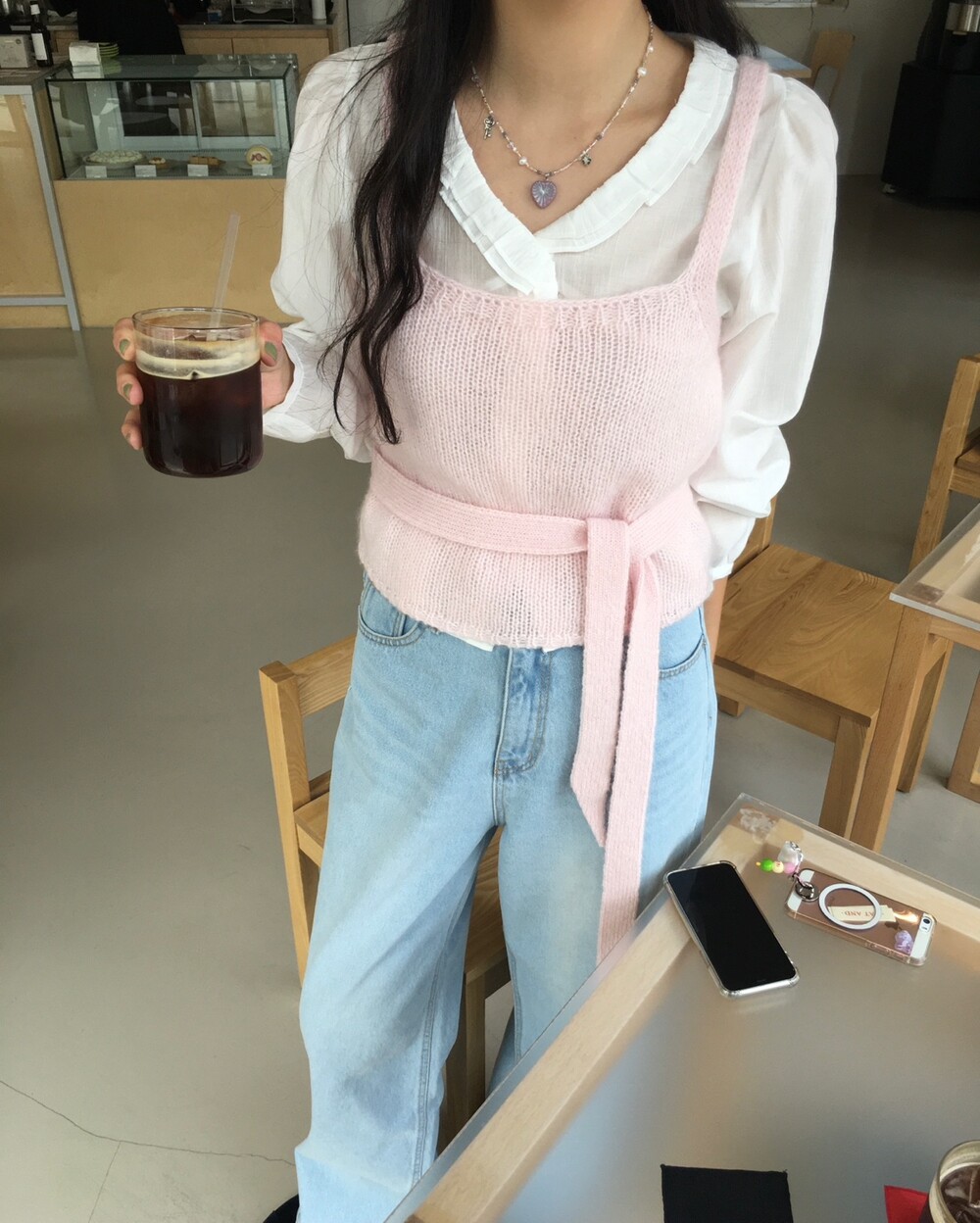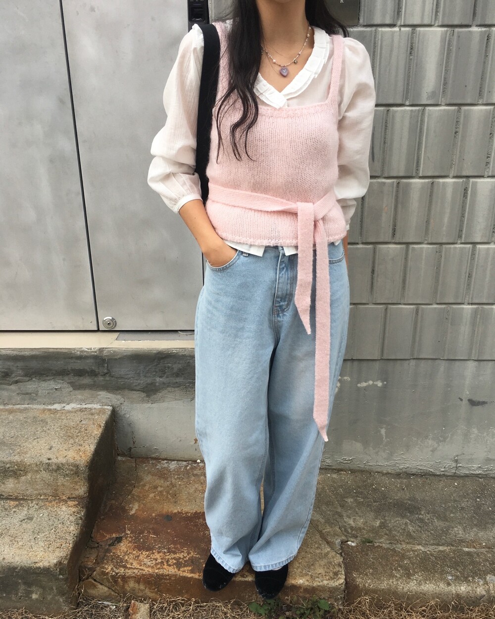 넥라인을 따라 더해진 프릴 디테일이 얼굴선을 부드럽게 만들어주고, 자연스럽게 시선을 위로 끌어줘서 더욱 여리한 느낌을 줘요.