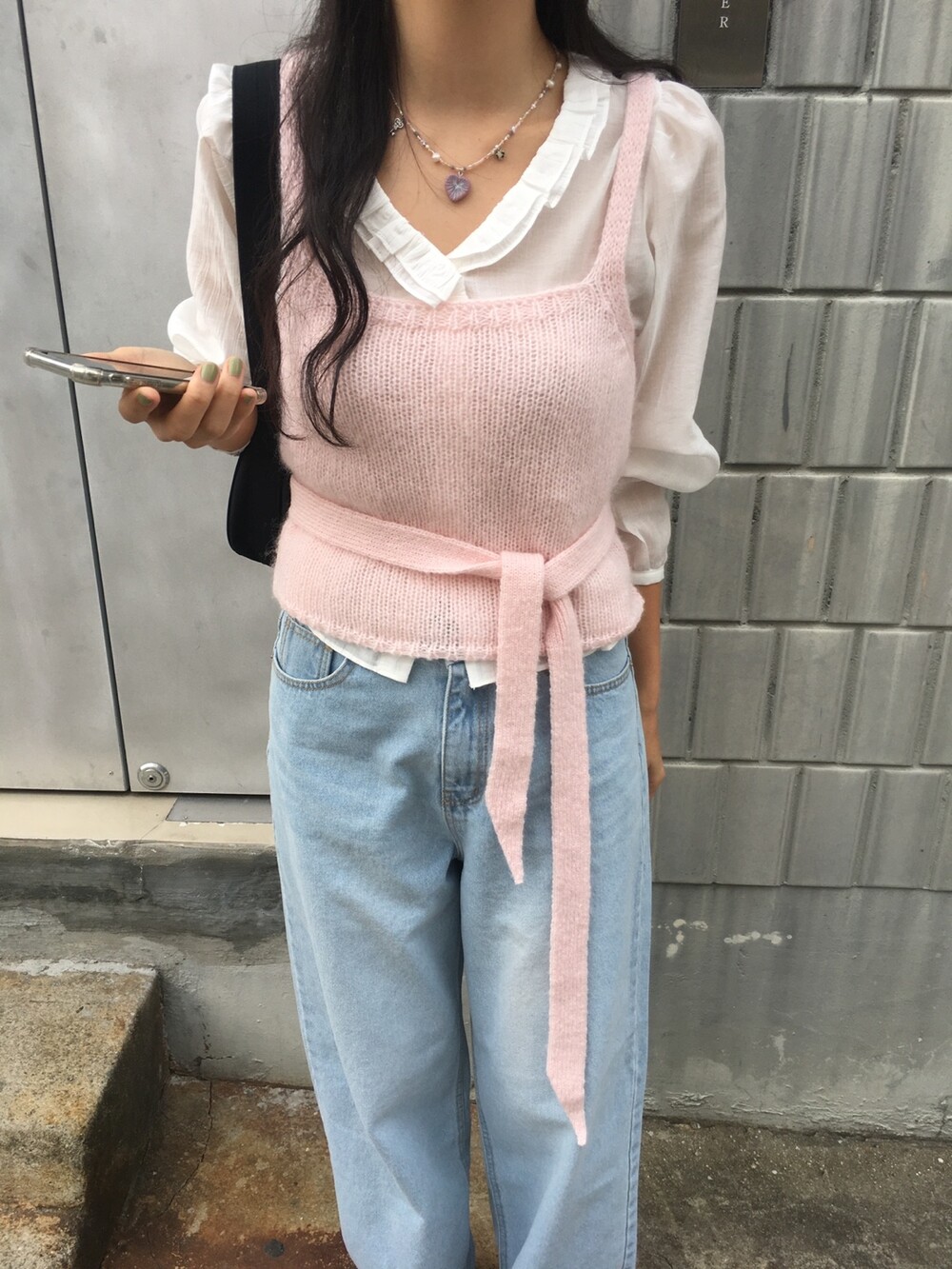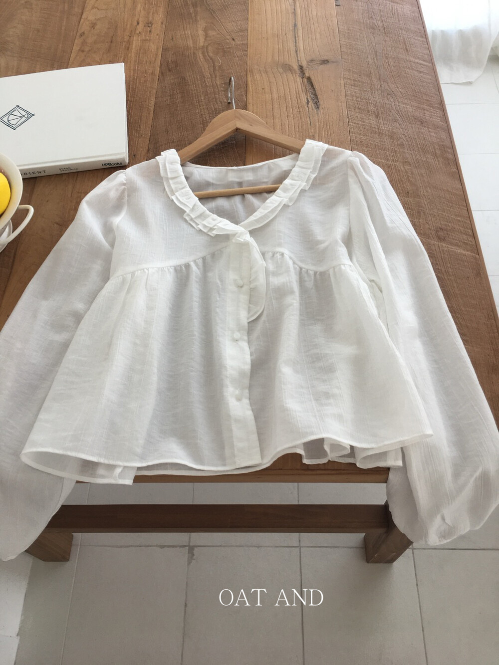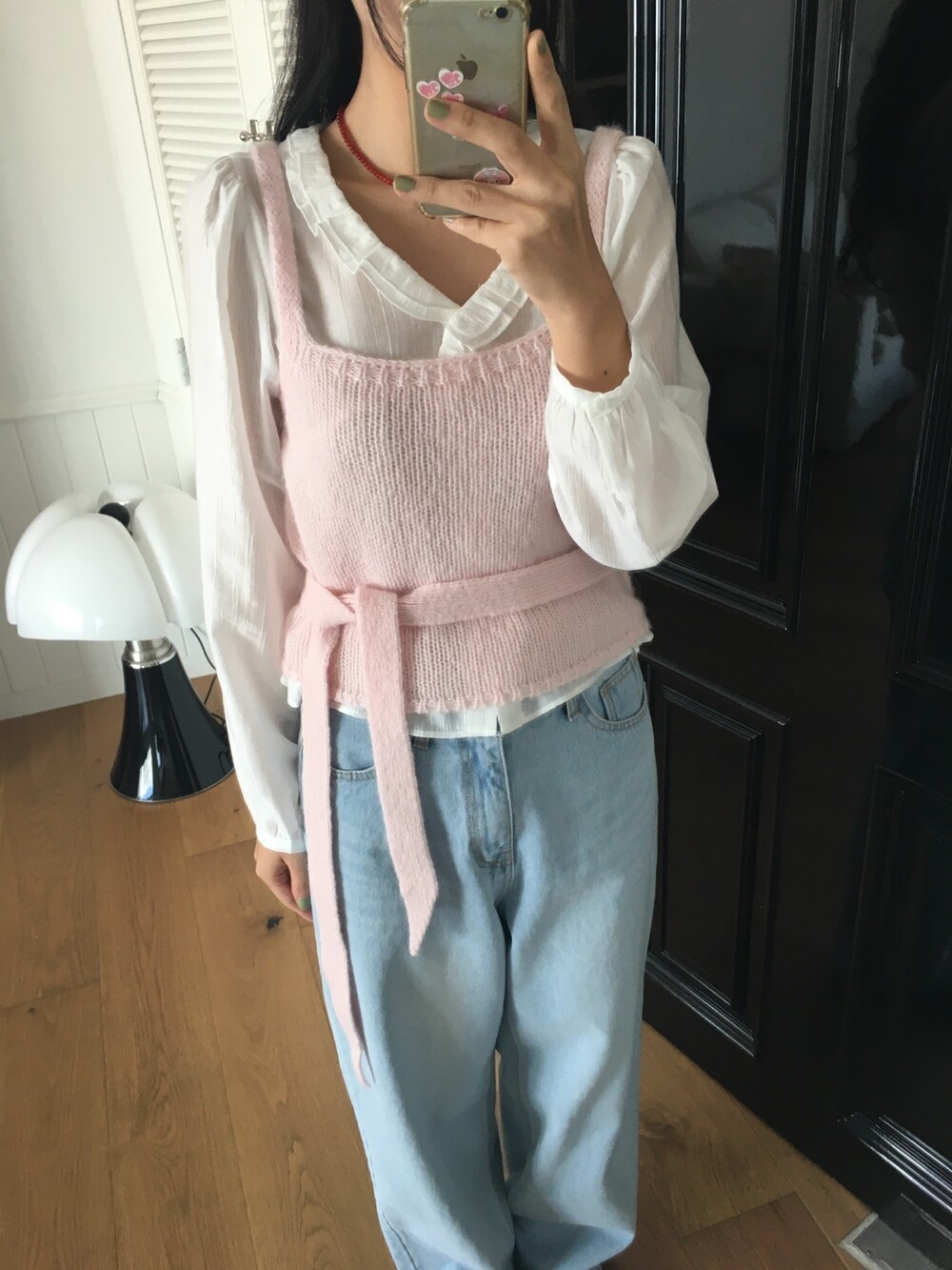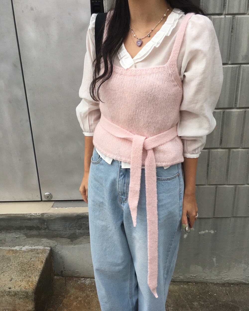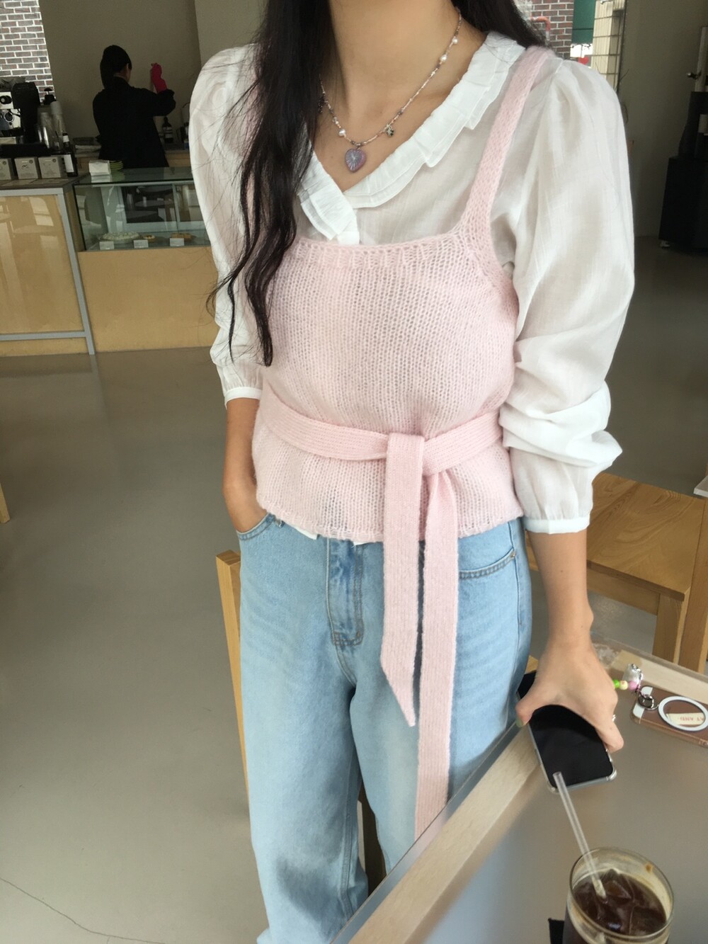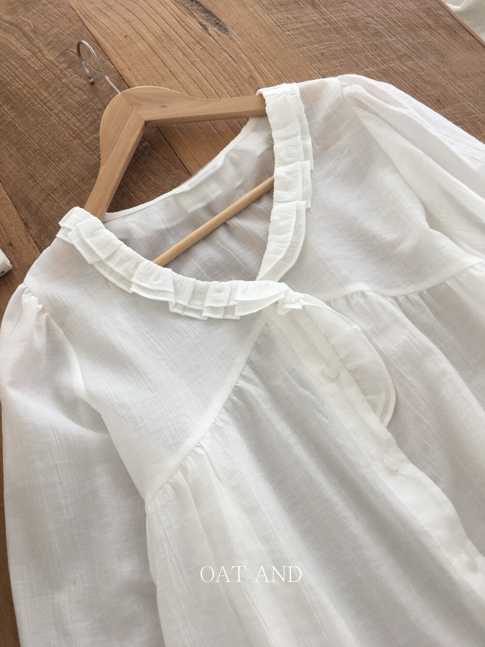 넥라인을 따라 더해진 프릴 디테일이 얼굴선을 부드럽게 만들어주고, 자연스럽게 시선을 위로 끌어줘서 더욱 여리한 느낌을 줘요.