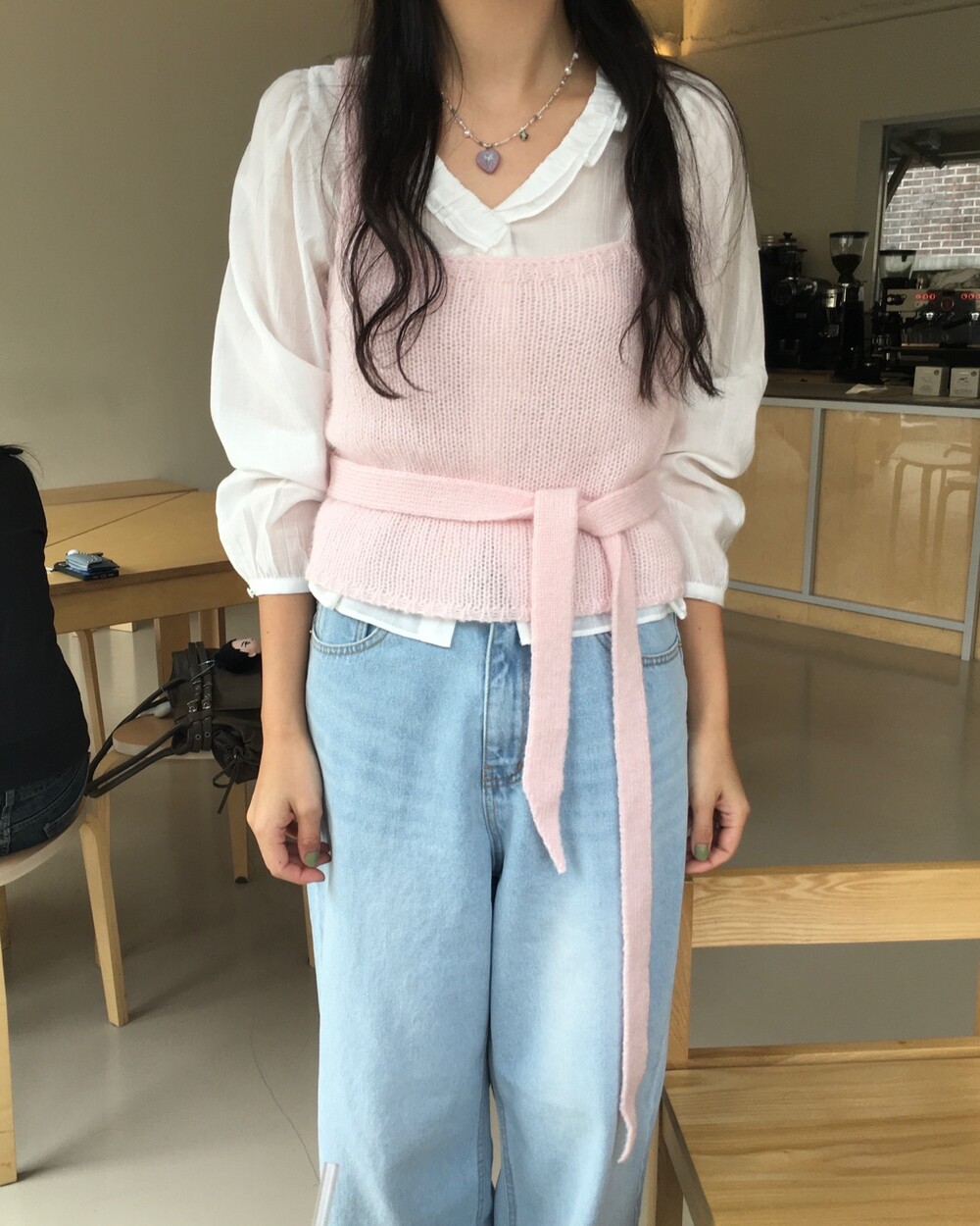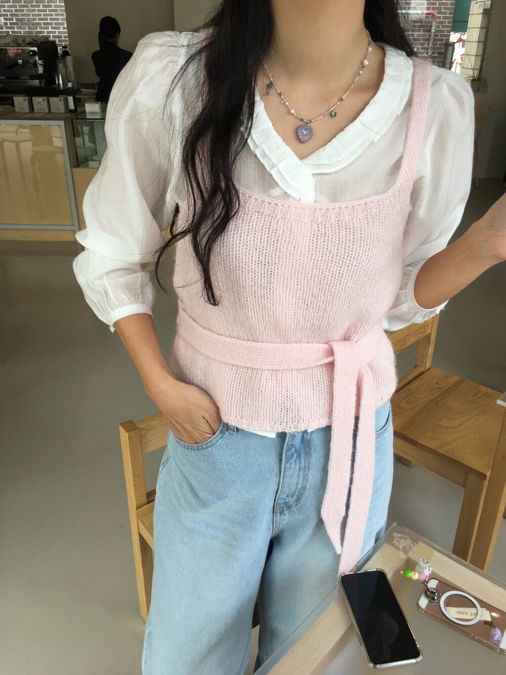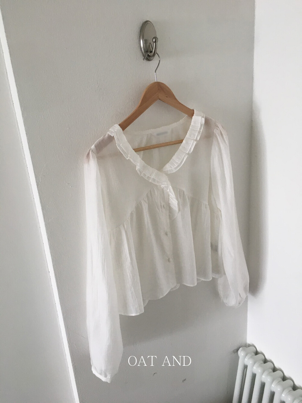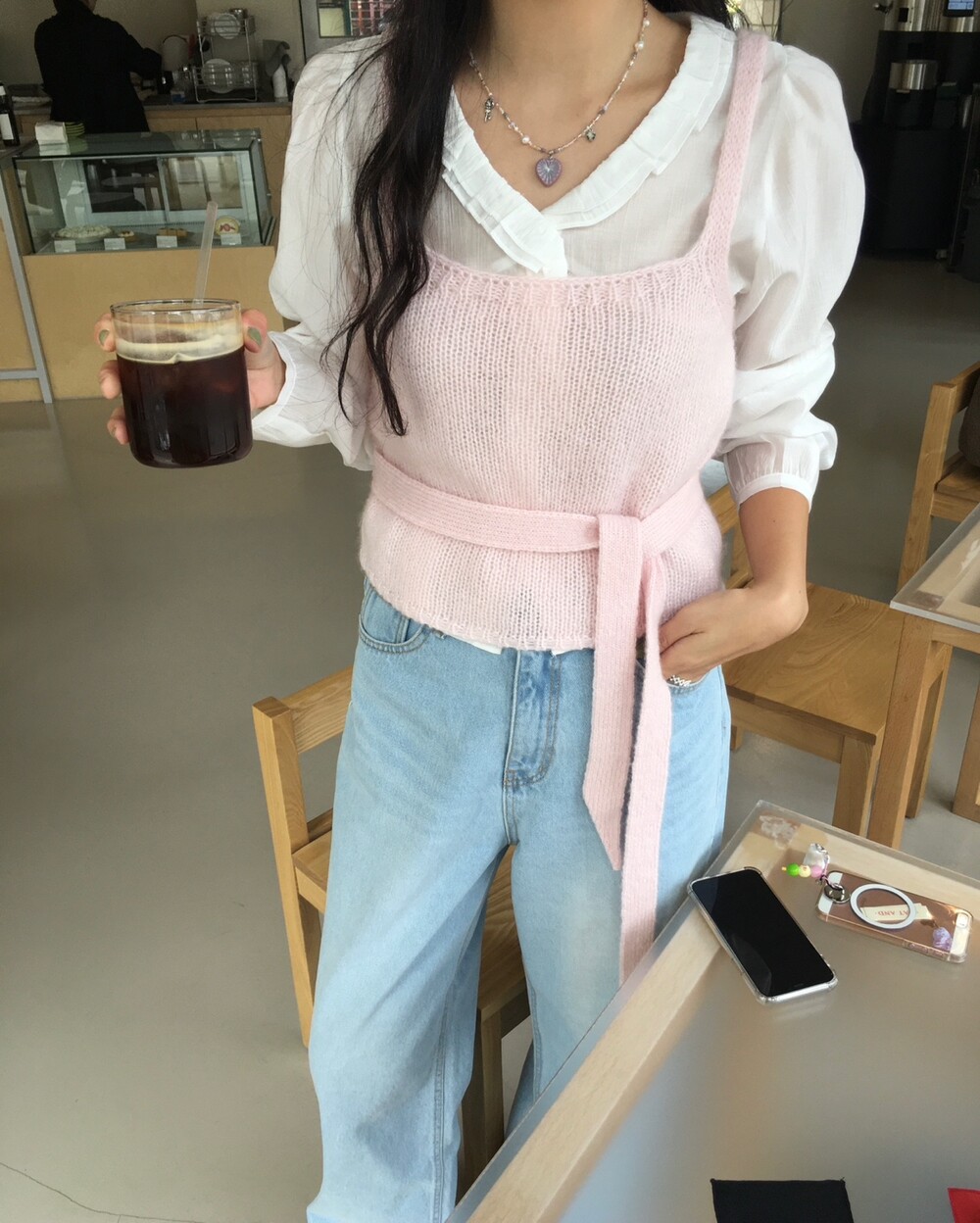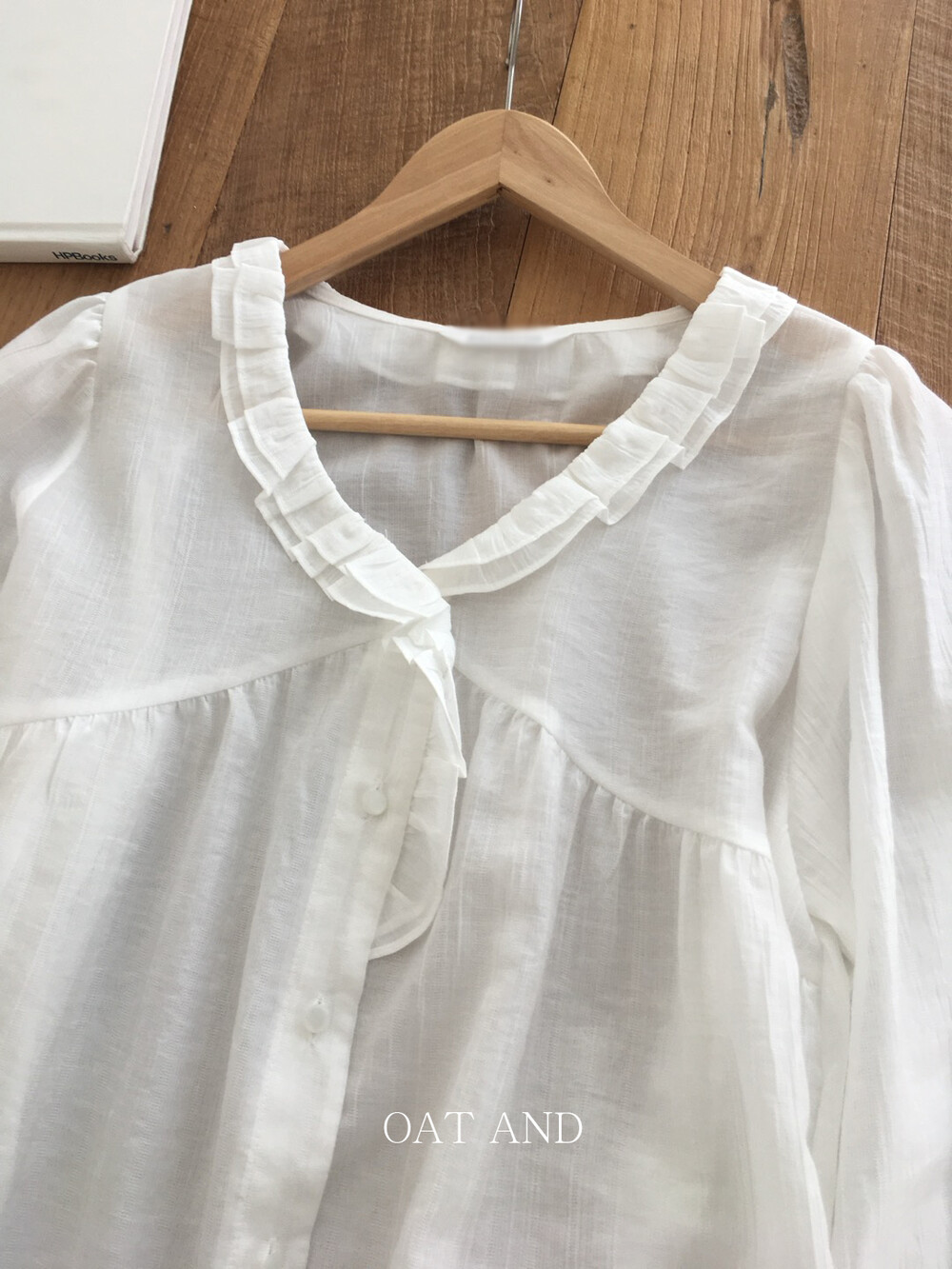 넥라인을 따라 더해진 프릴 디테일이 얼굴선을 부드럽게 만들어주고, 자연스럽게 시선을 위로 끌어줘서 더욱 여리한 느낌을 줘요.
