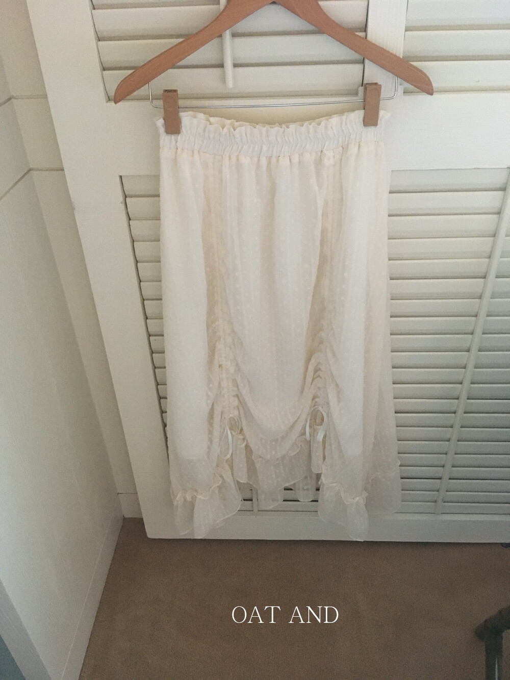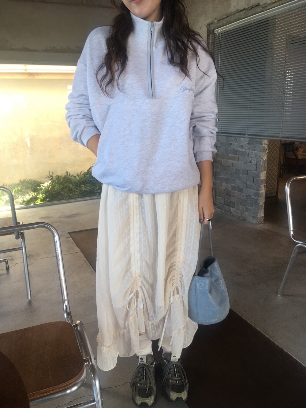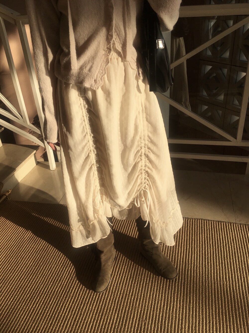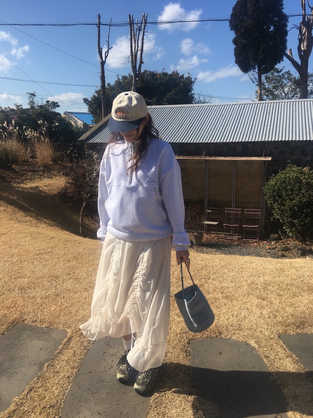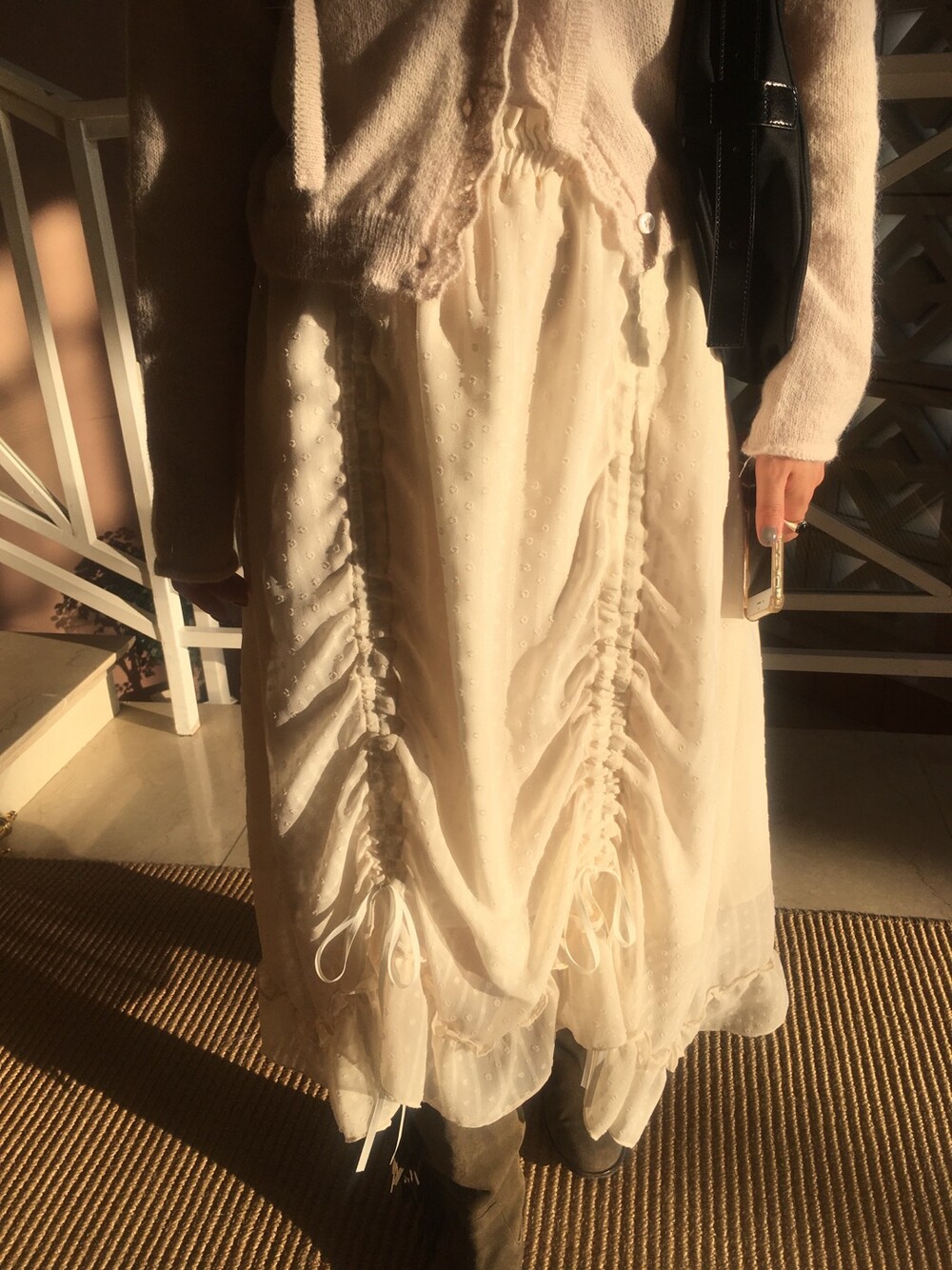 밋밋할 수 있는 아이보리 스커트에 쉬폰 소재로 은은한 고급스러움을 더해주고, 입체감이 느껴진답니다.