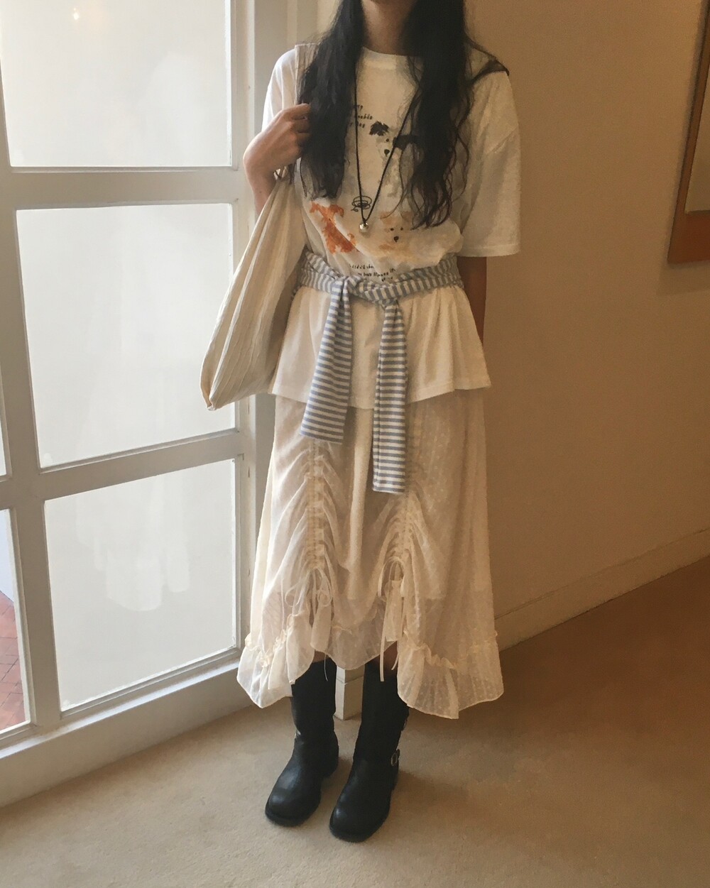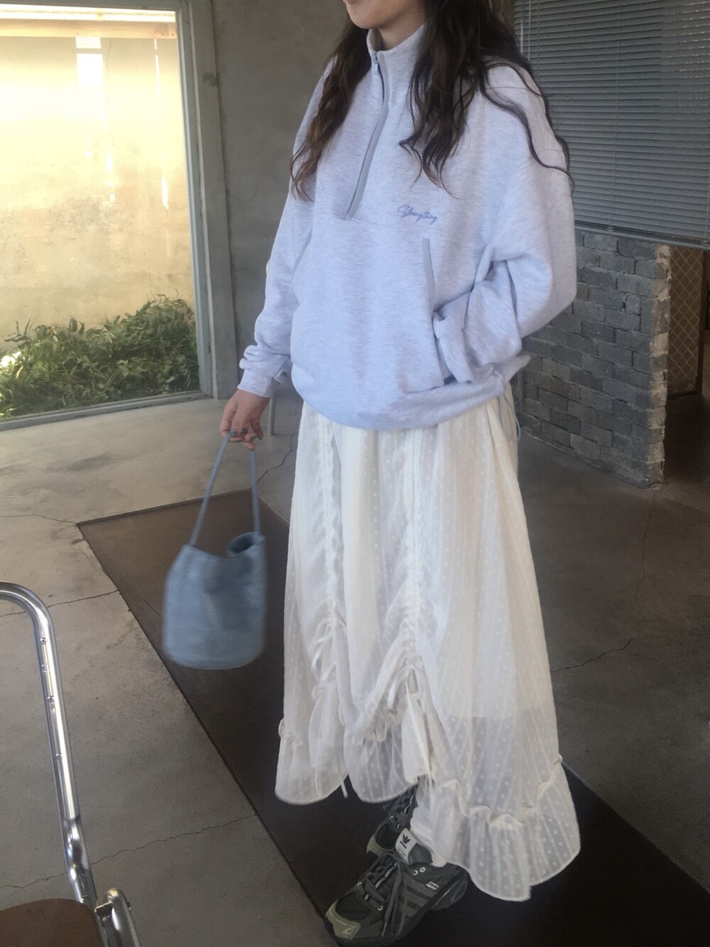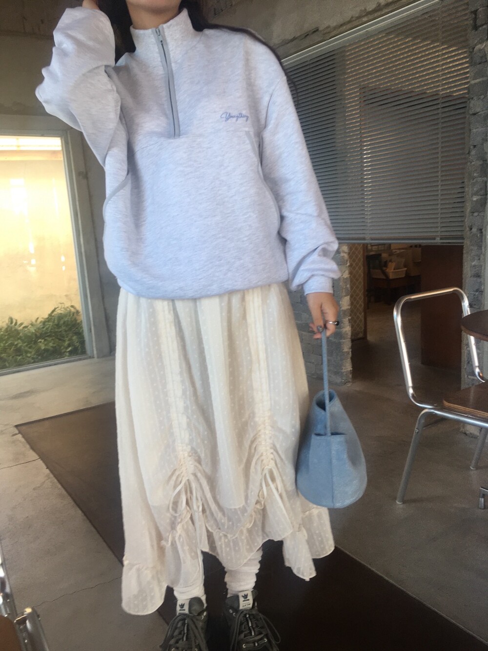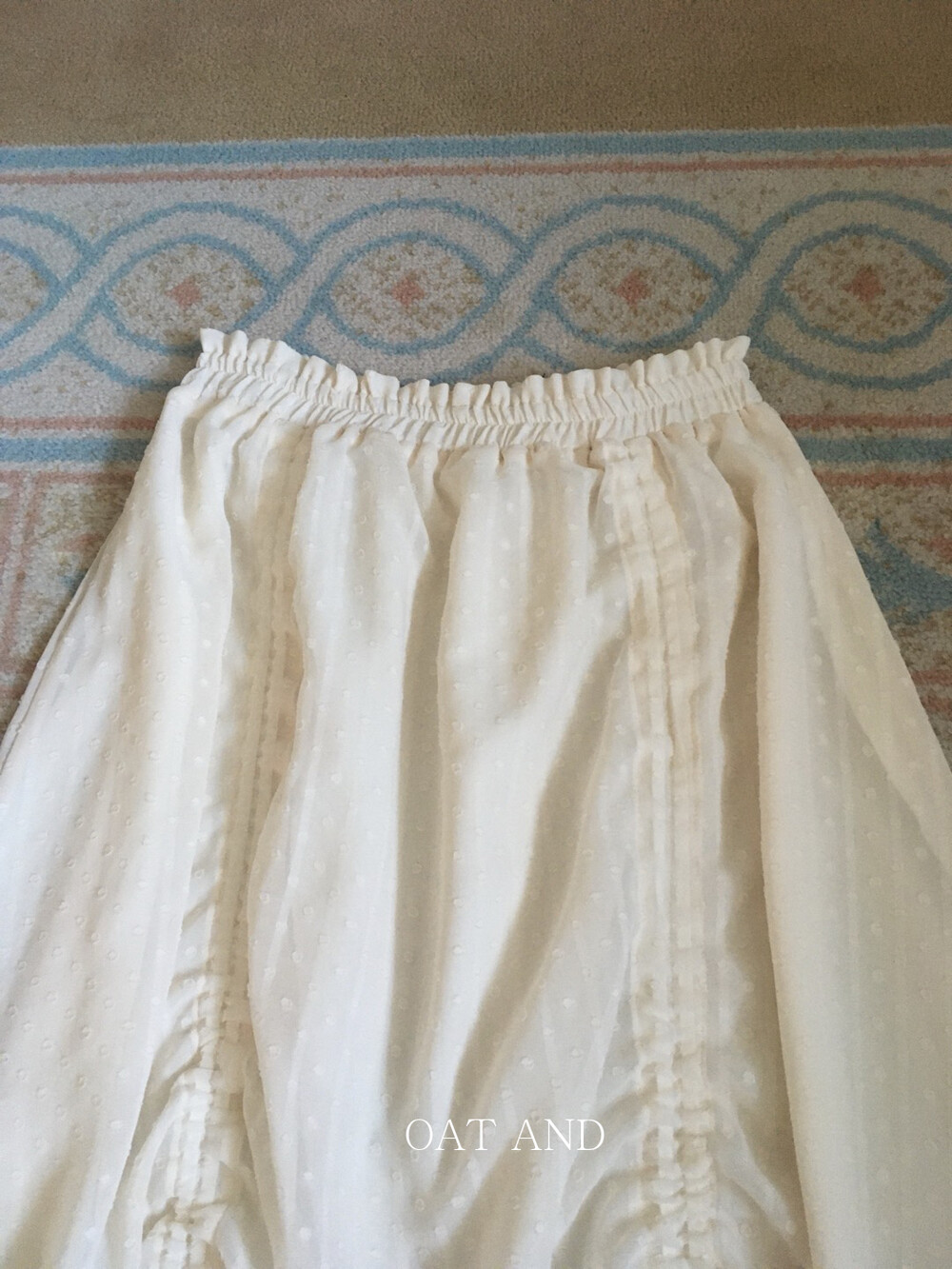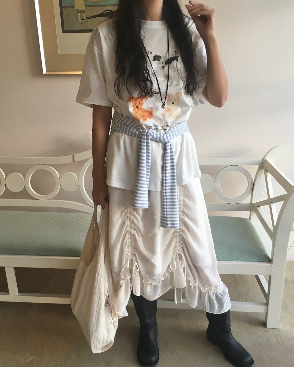 밋밋할 수 있는 아이보리 스커트에 쉬폰 소재로 은은한 고급스러움을 더해주고, 입체감이 느껴진답니다.