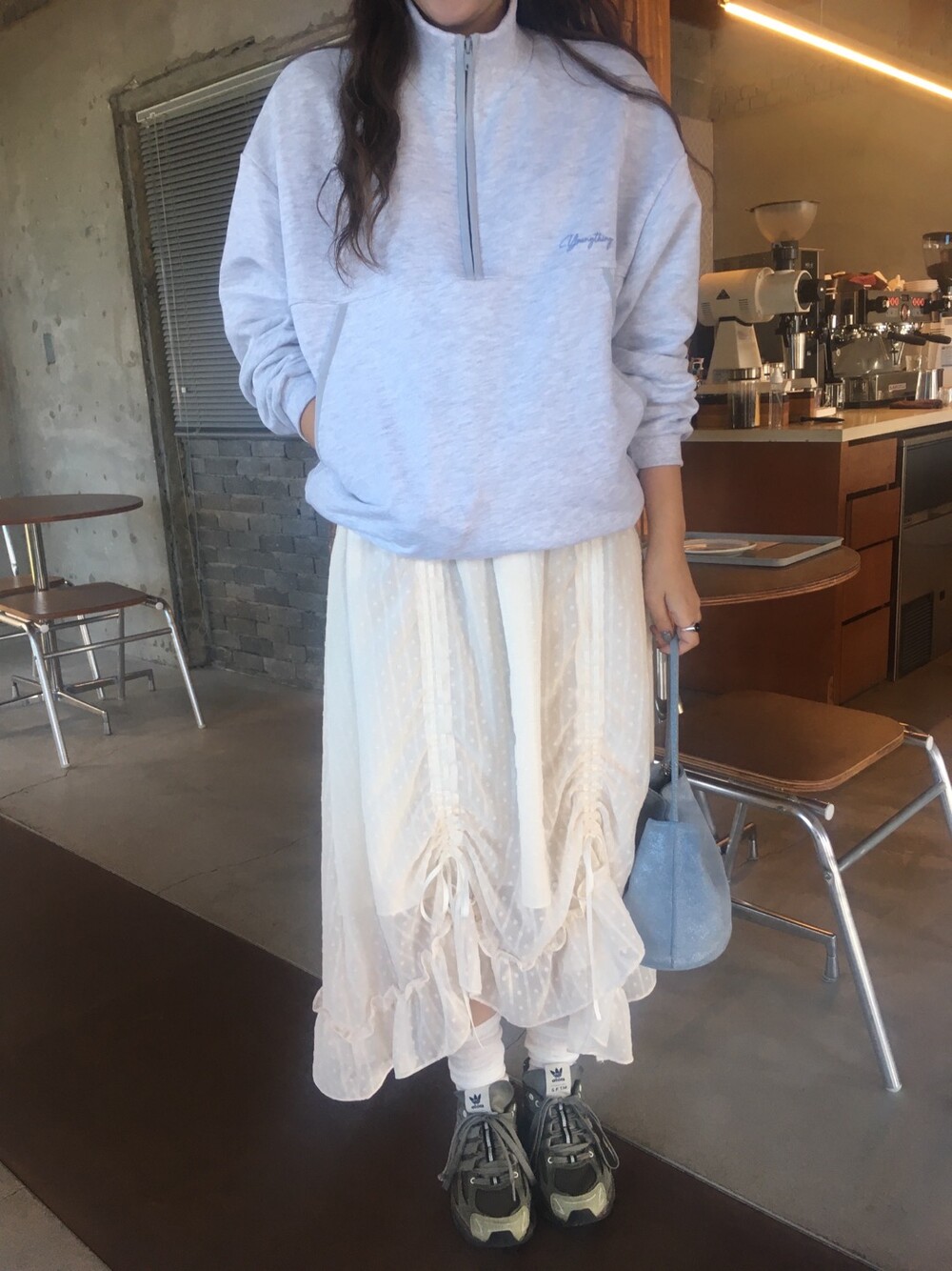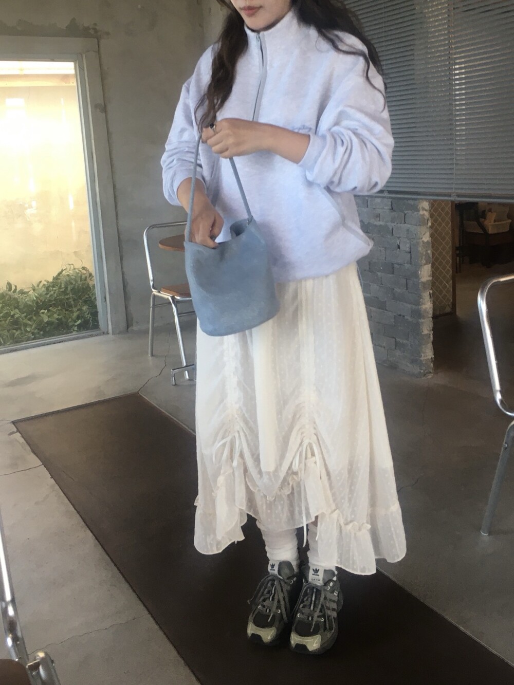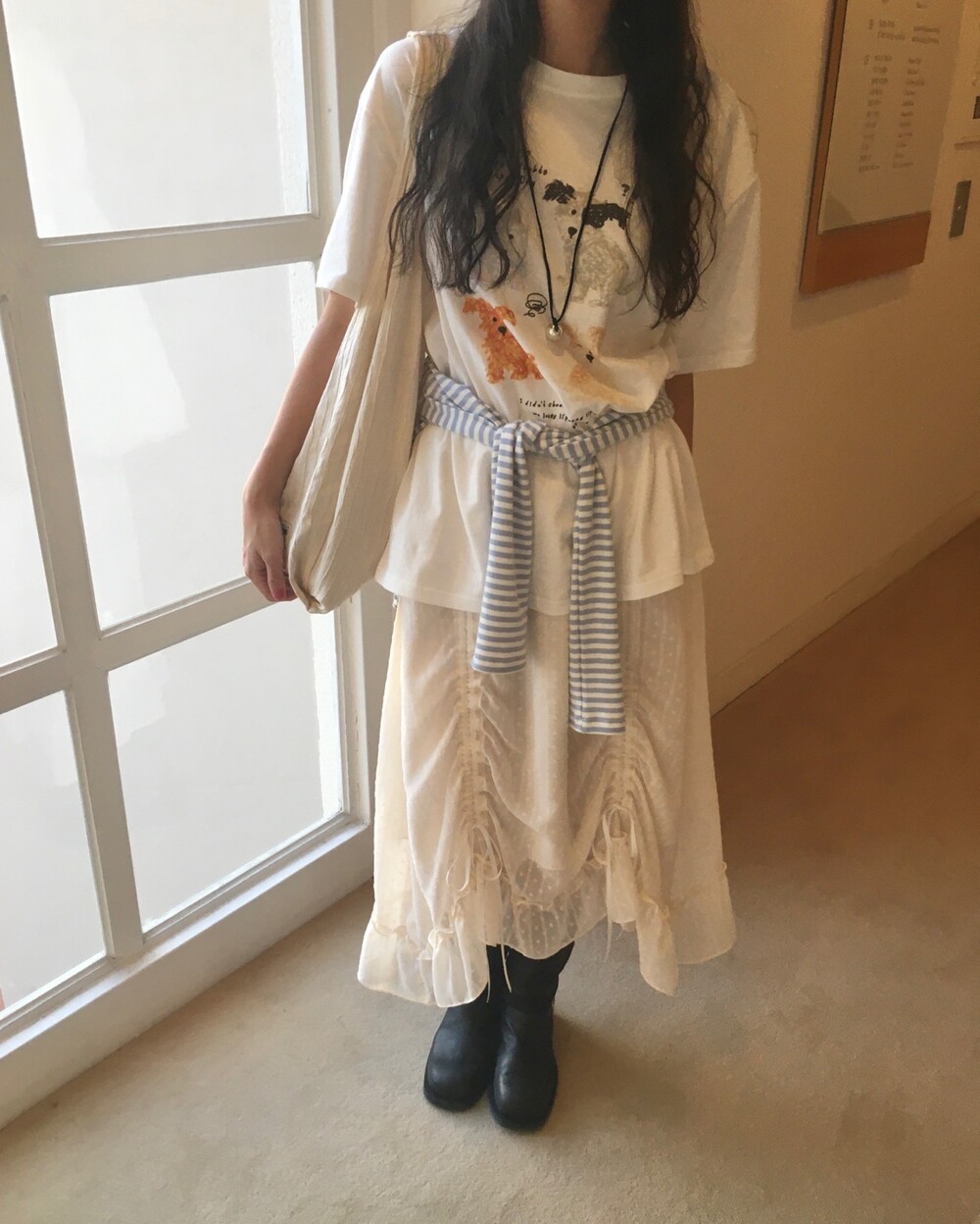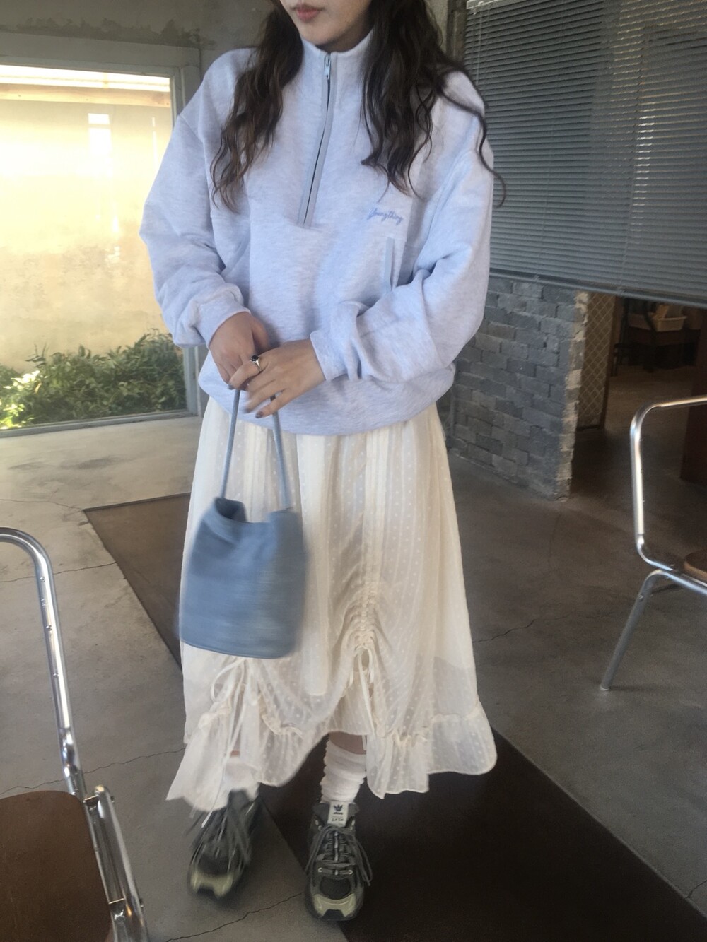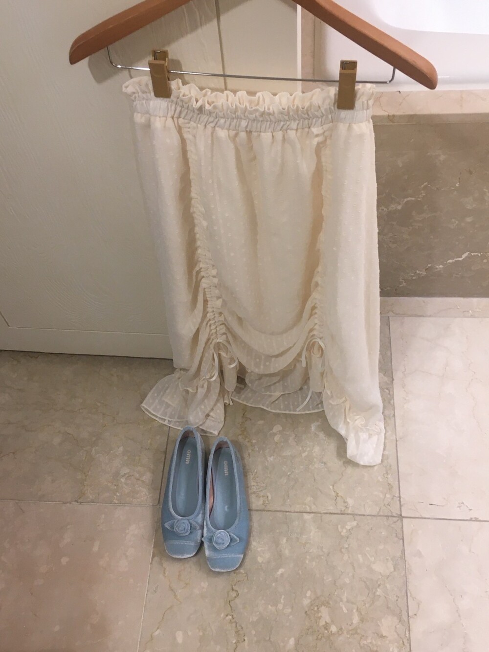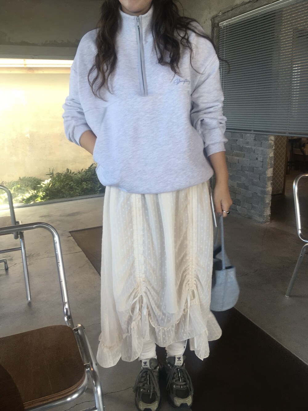 밋밋할 수 있는 아이보리 스커트에 쉬폰 소재로 은은한 고급스러움을 더해주고, 입체감이 느껴진답니다.