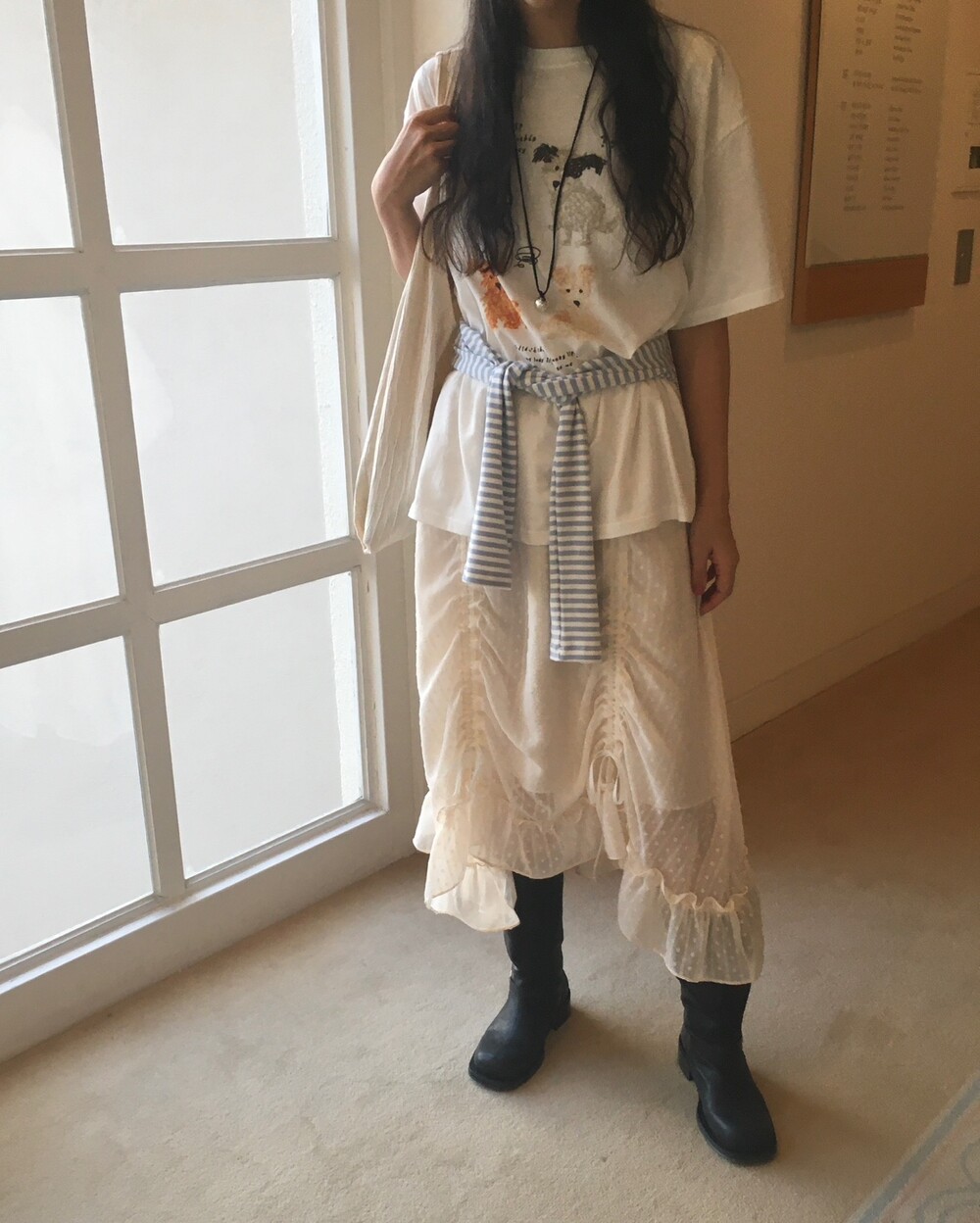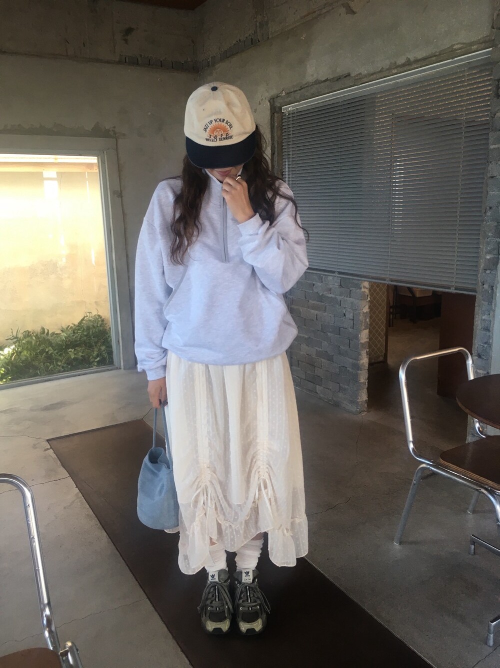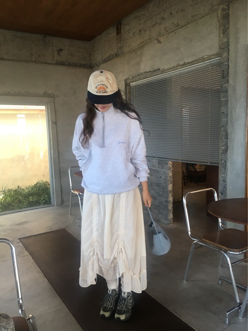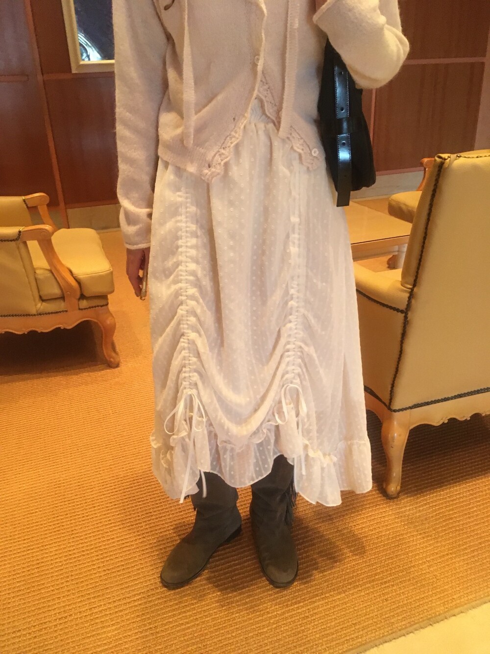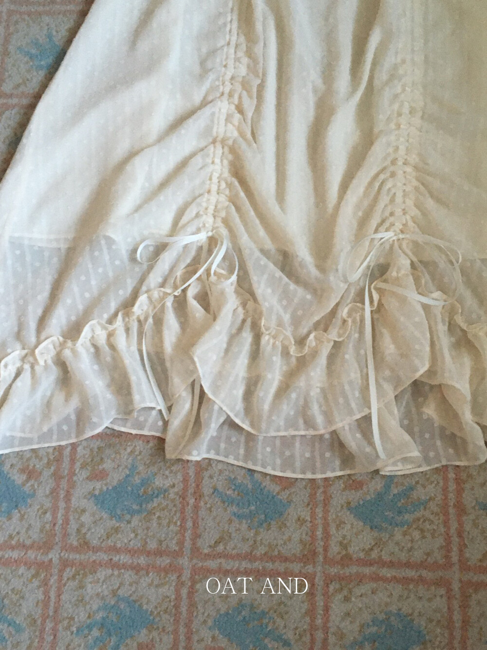 밋밋할 수 있는 아이보리 스커트에 쉬폰 소재로 은은한 고급스러움을 더해주고, 입체감이 느껴진답니다.