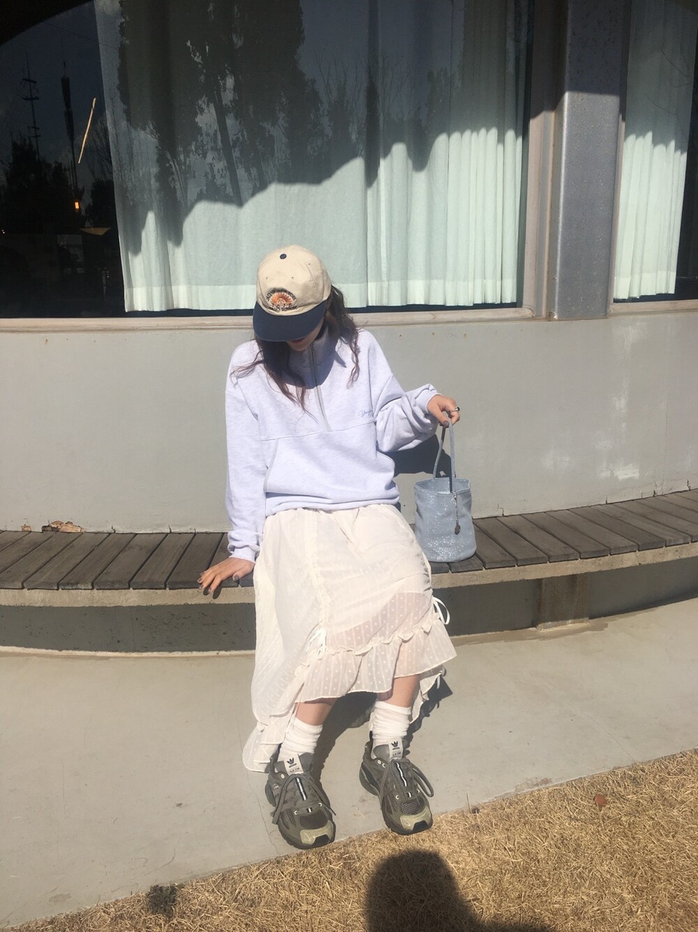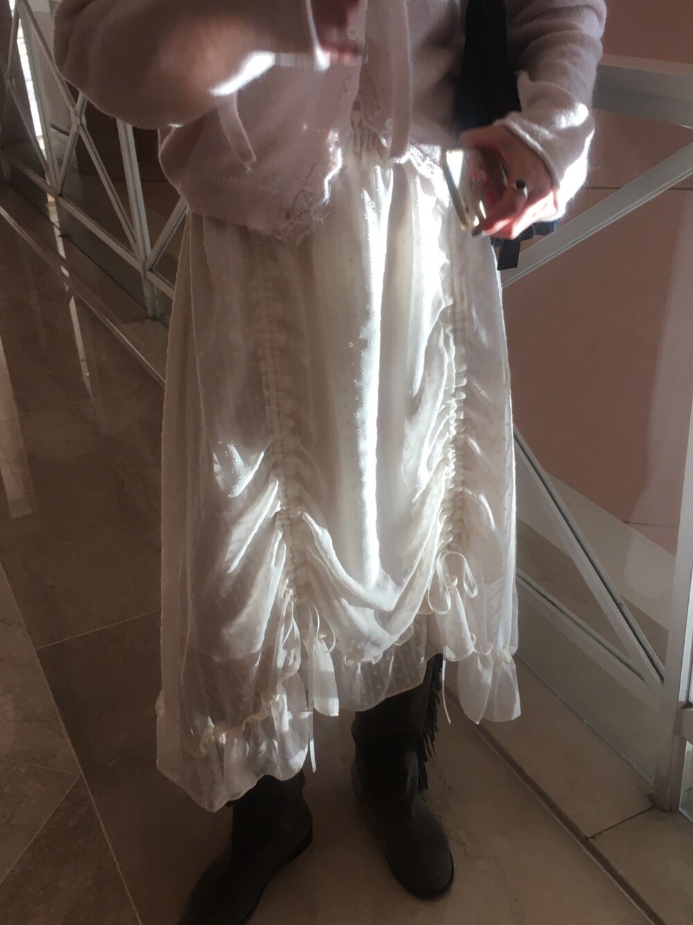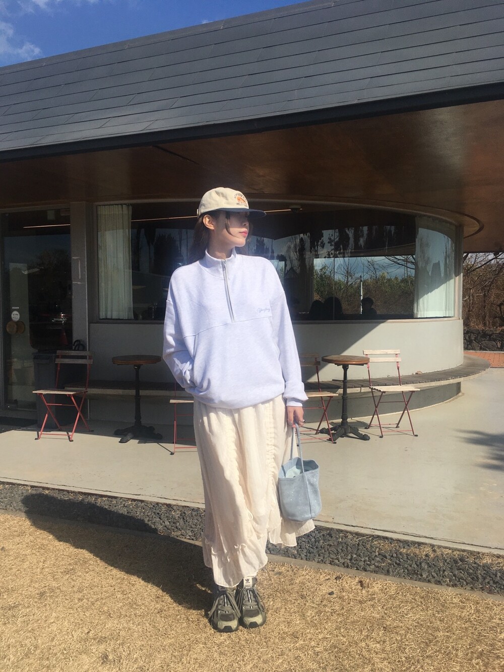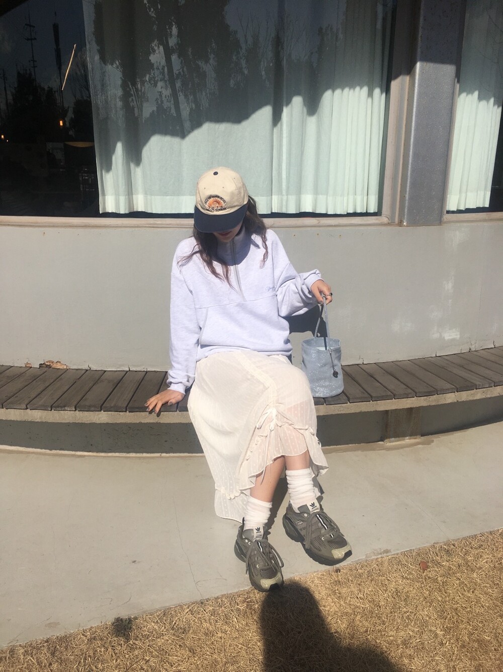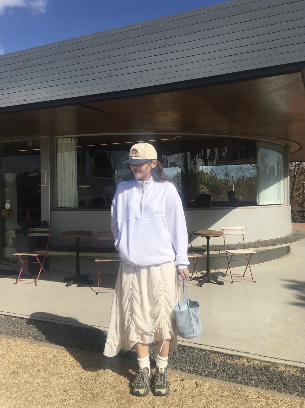 밋밋할 수 있는 아이보리 스커트에 쉬폰 소재로 은은한 고급스러움을 더해주고, 입체감이 느껴진답니다.