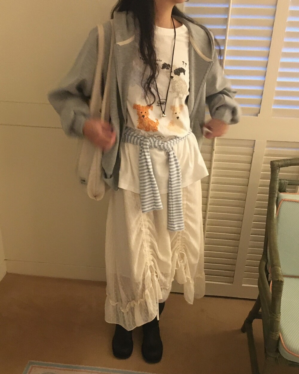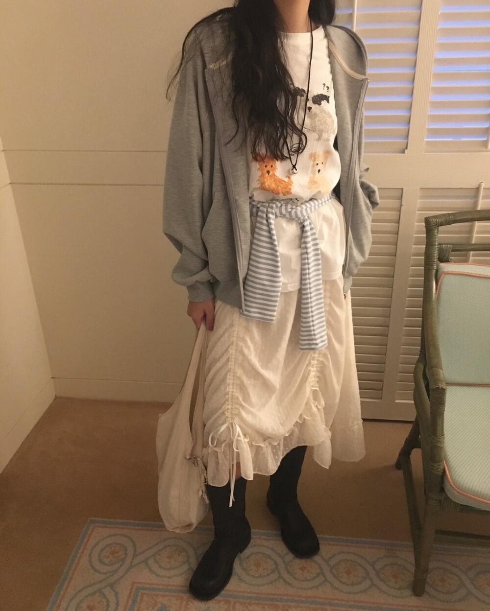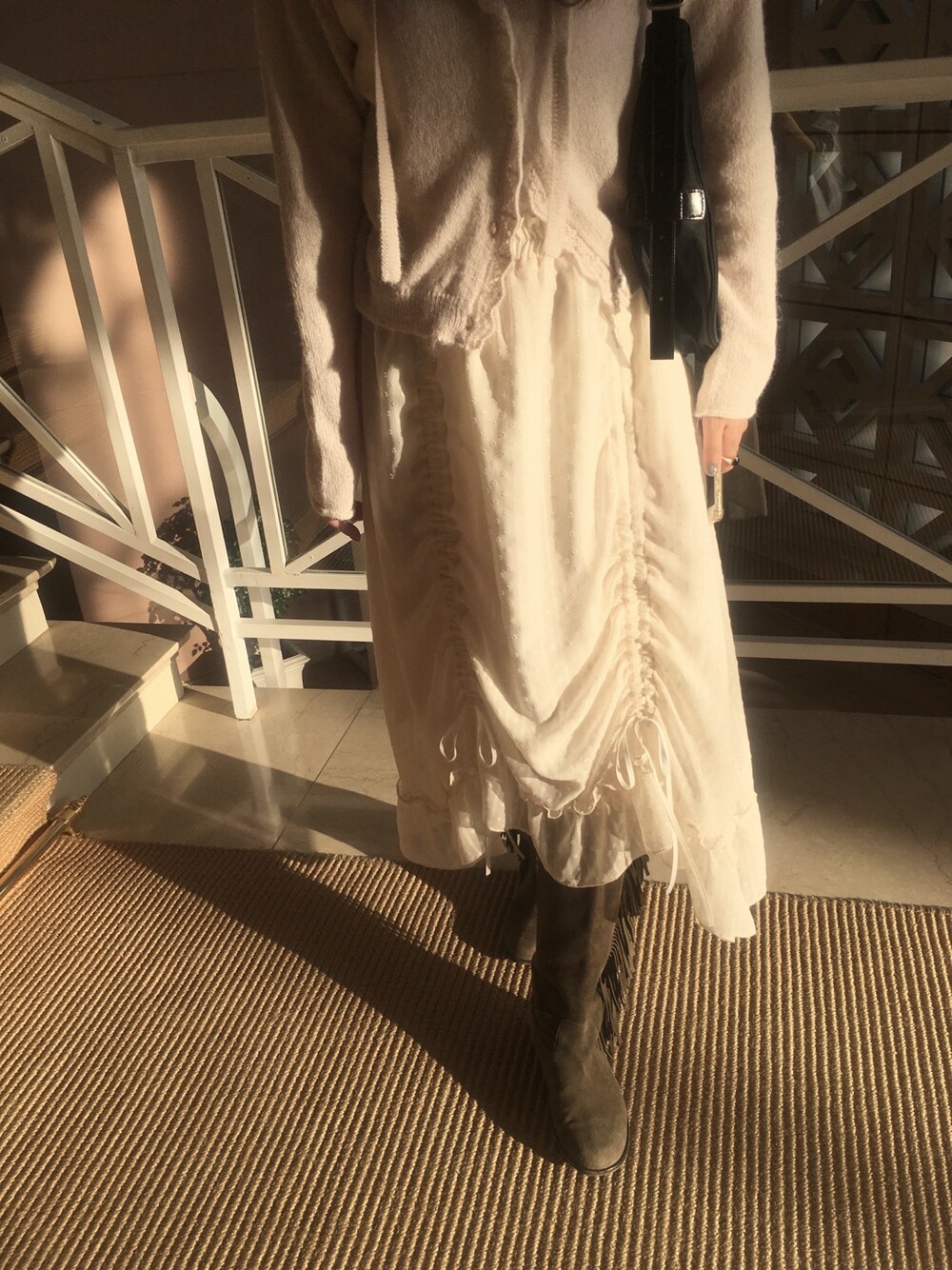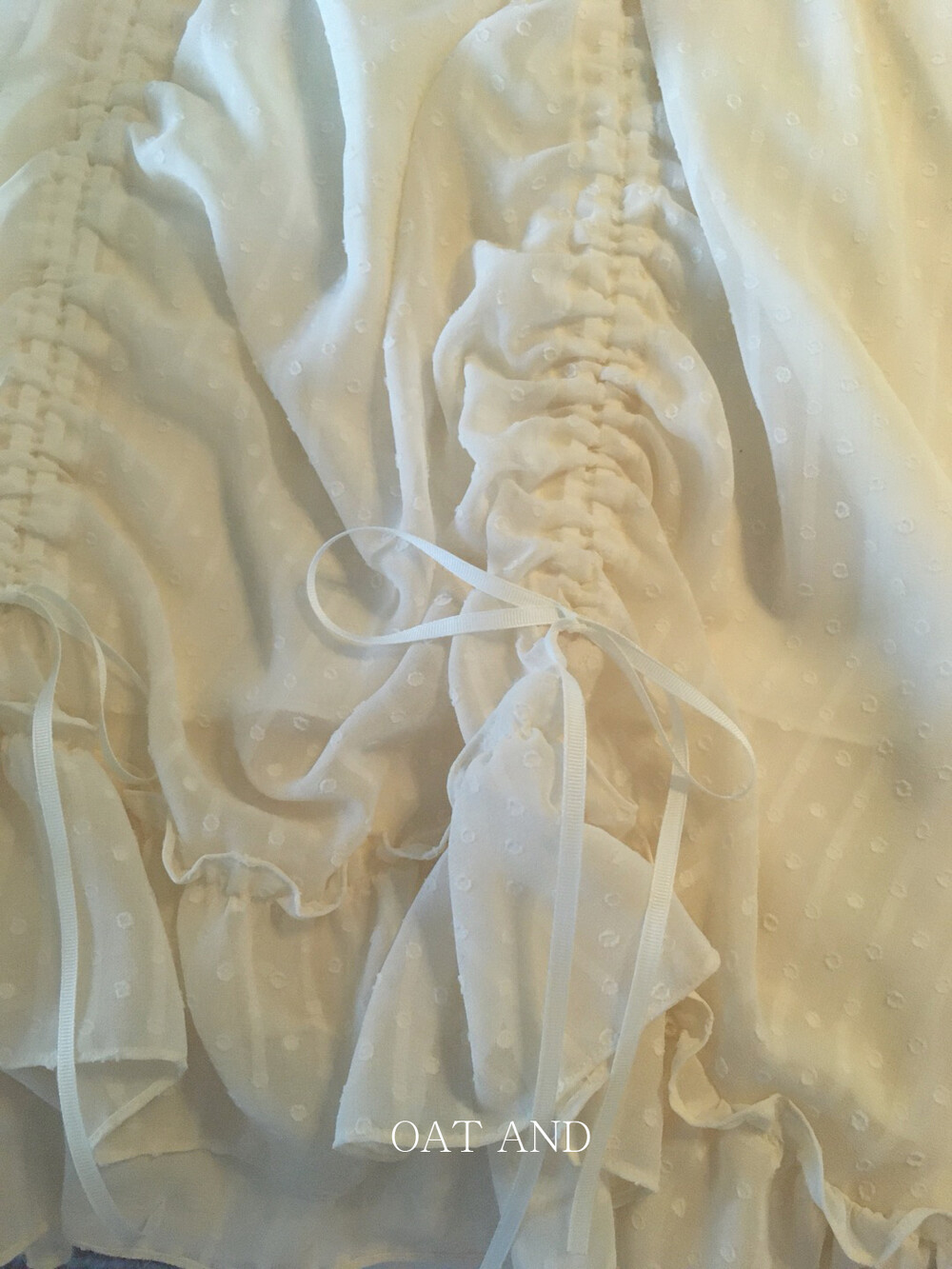롱한 기장감에 세로로 들어간 스트링을 조여 자연스러운 셔링 주름을 만들고, 스트링 끝의 리본 장식이 사랑스러운 분위기를 더해줍니다.