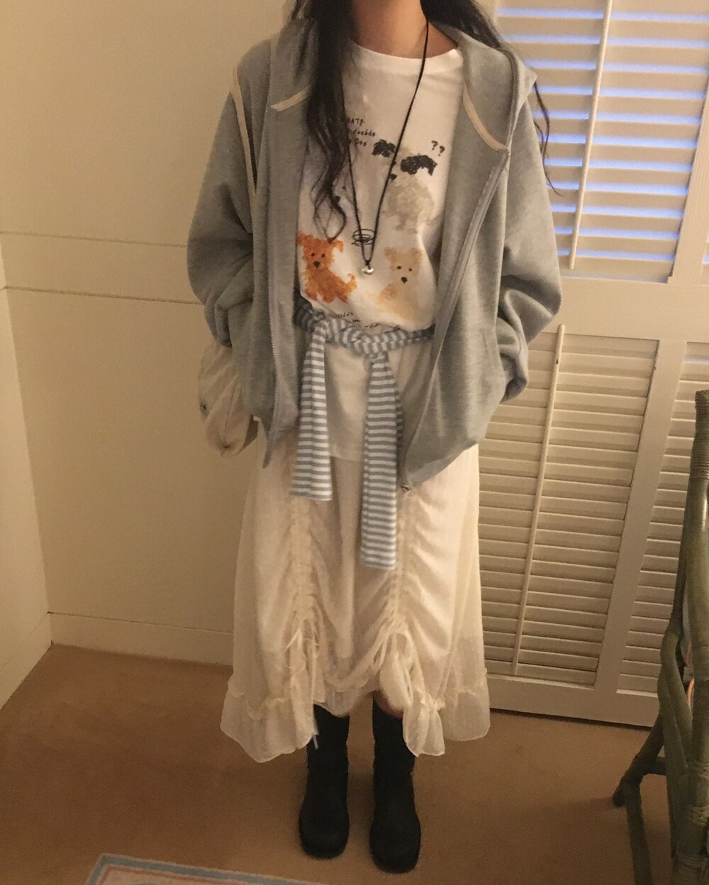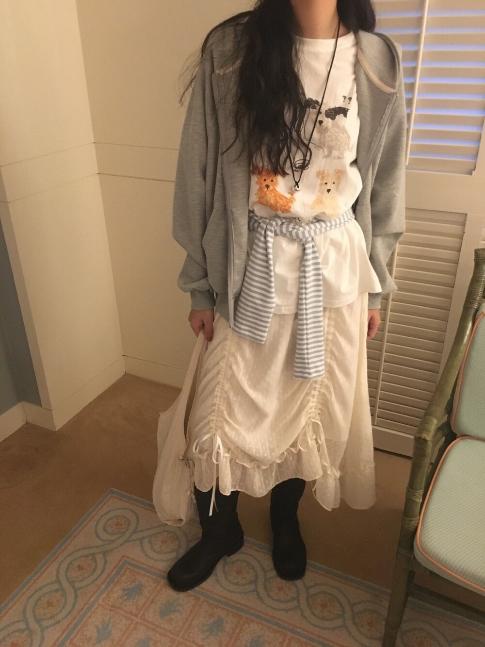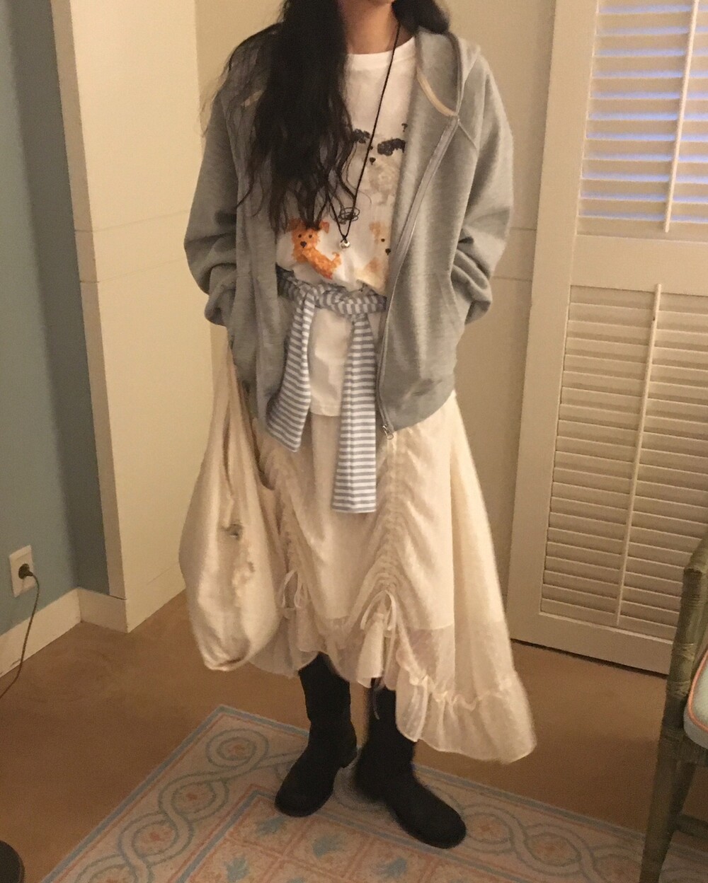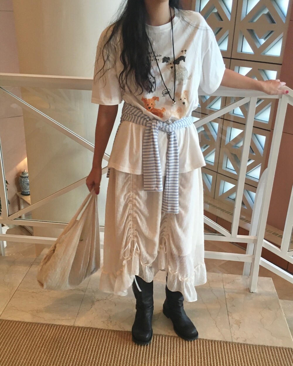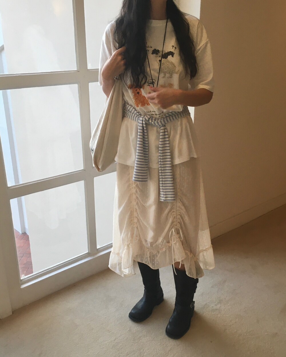 롱한 기장감에 세로로 들어간 스트링을 조여 자연스러운 셔링 주름을 만들고, 스트링 끝의 리본 장식이 사랑스러운 분위기를 더해줍니다.