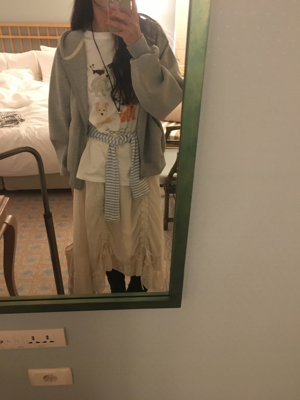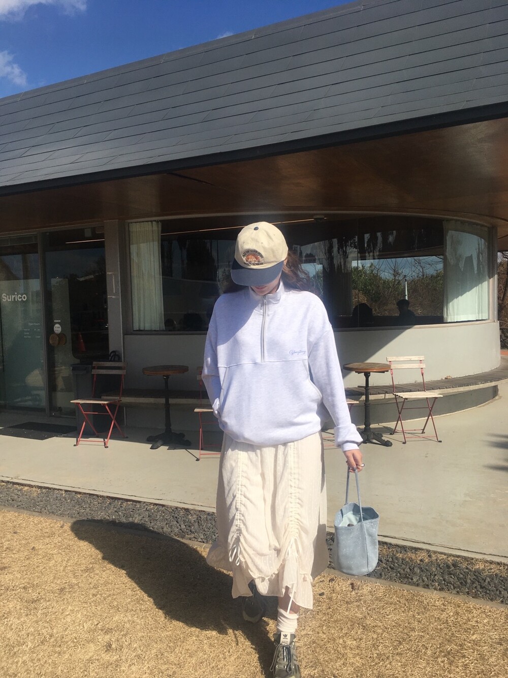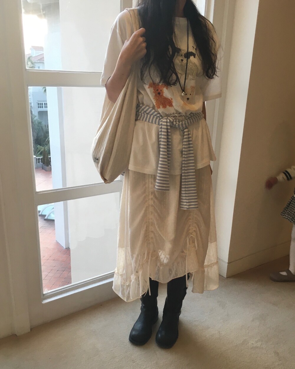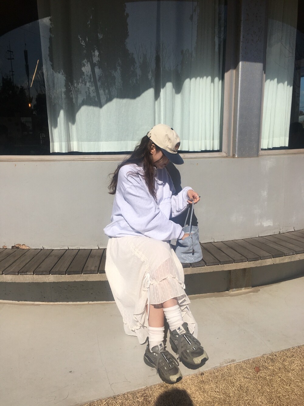 롱한 기장감에 세로로 들어간 스트링을 조여 자연스러운 셔링 주름을 만들고, 스트링 끝의 리본 장식이 사랑스러운 분위기를 더해줍니다.