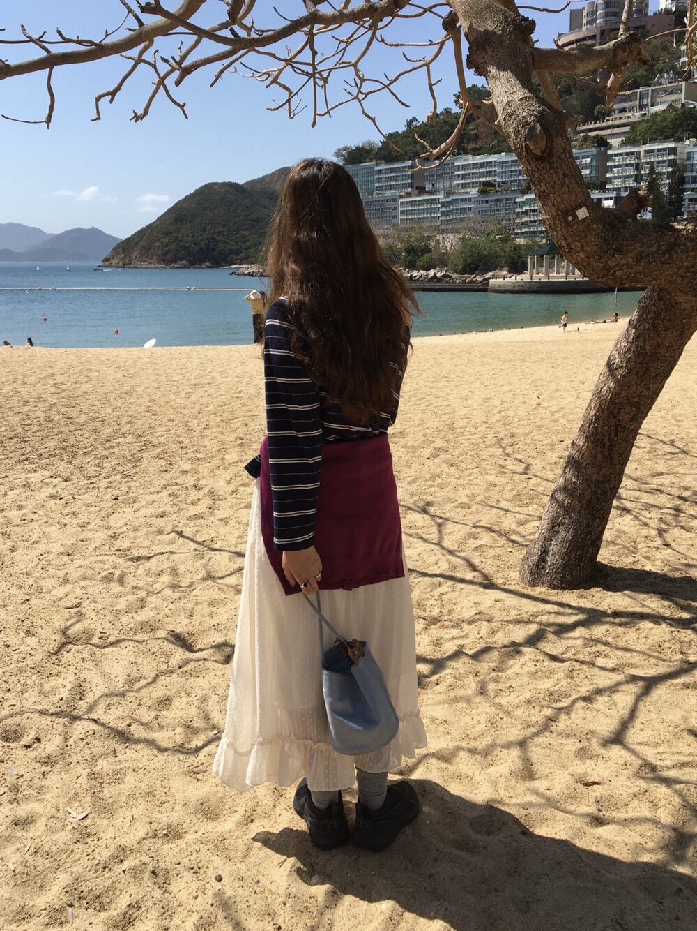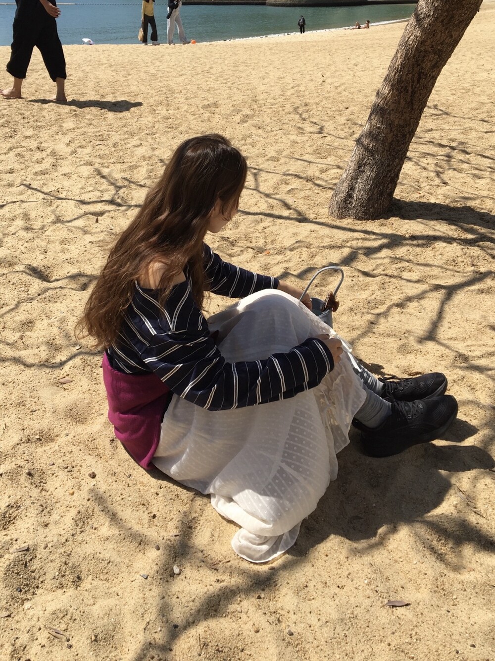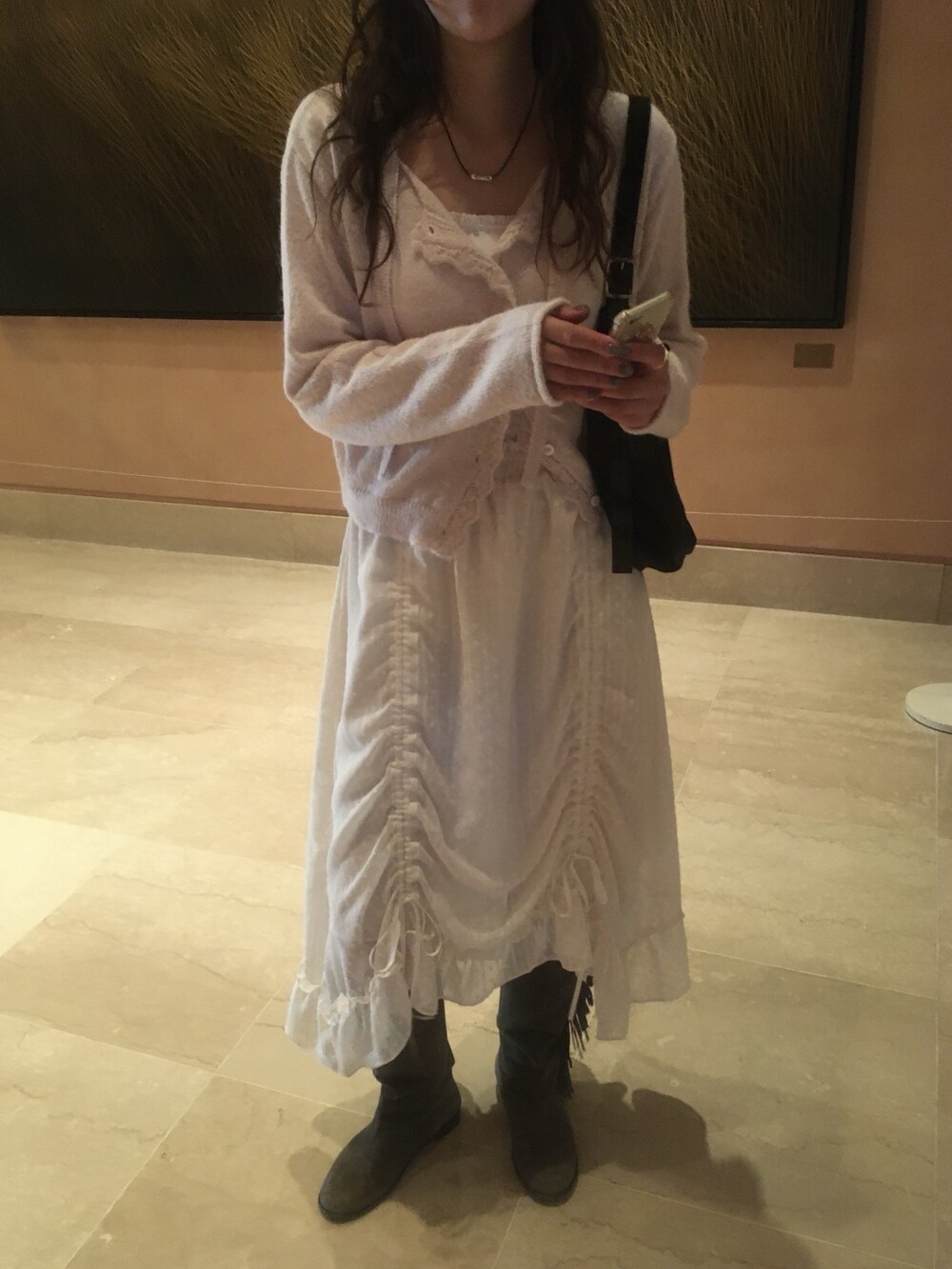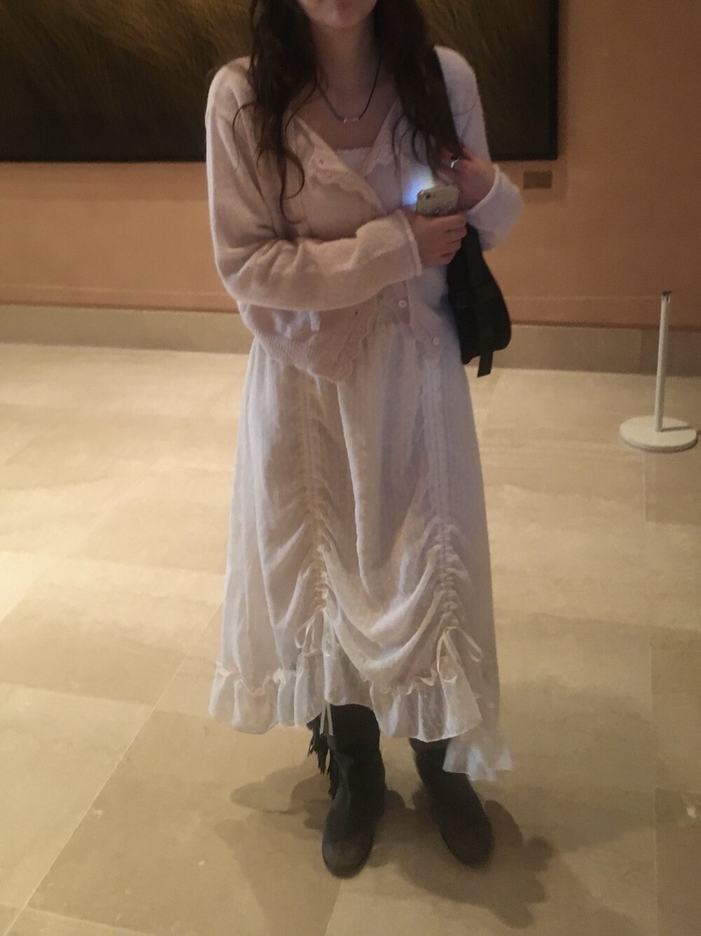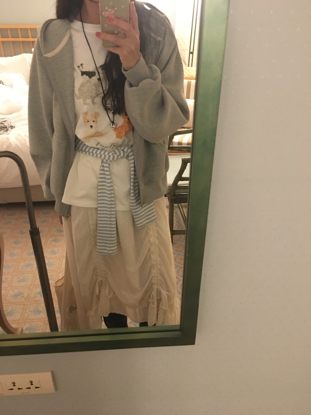 롱한 기장감에 세로로 들어간 스트링을 조여 자연스러운 셔링 주름을 만들고, 스트링 끝의 리본 장식이 사랑스러운 분위기를 더해줍니다.